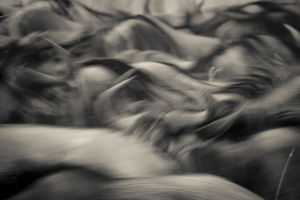 During the great migration wildebeest, in great numbers, are like a long endless wave going down a river.