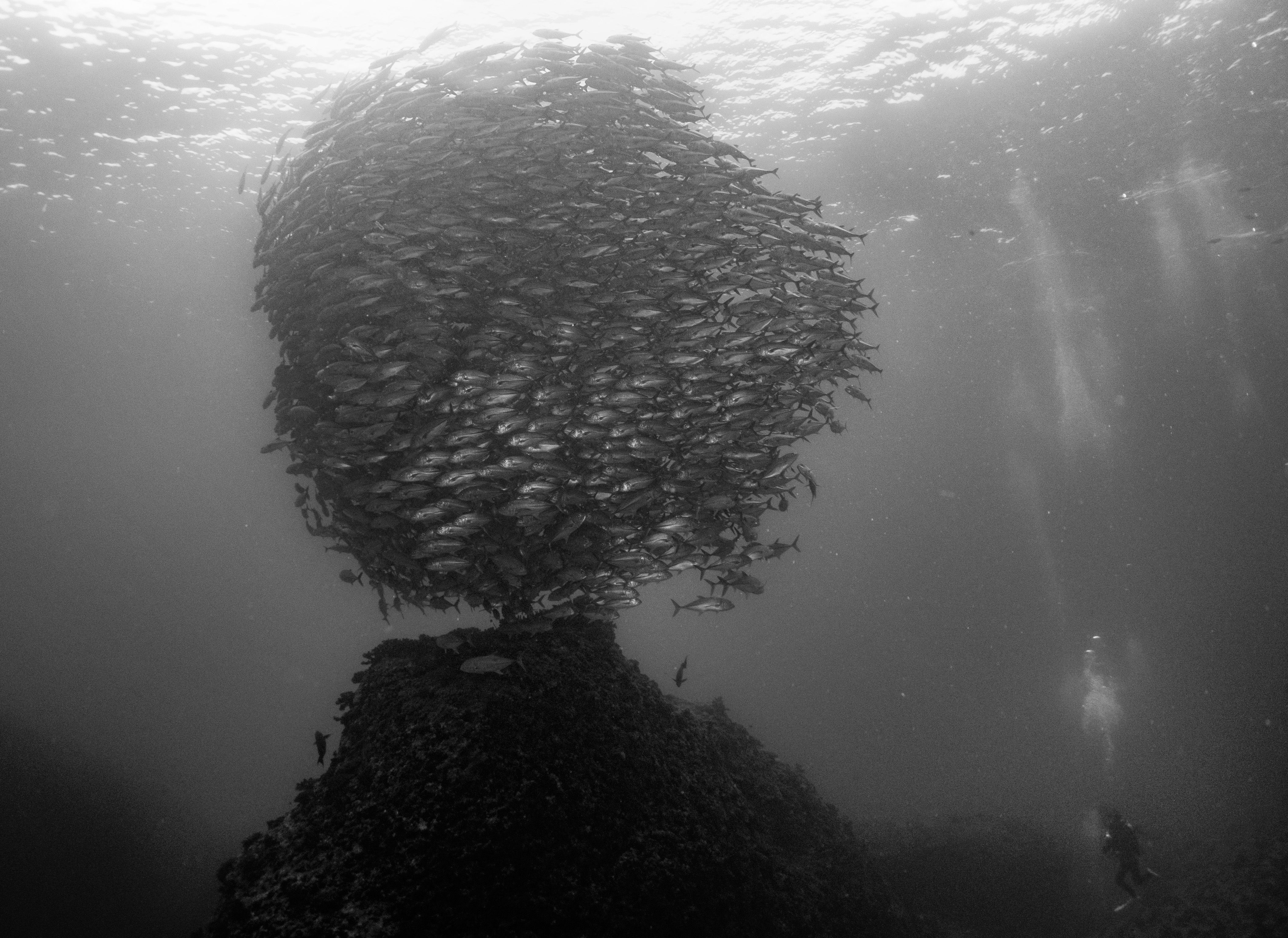 Cape Fuden on Aguni Island in japan is famous for school of Jack fish. On that day, we found a large school of jack on the roots of a coral. It was like a tree.