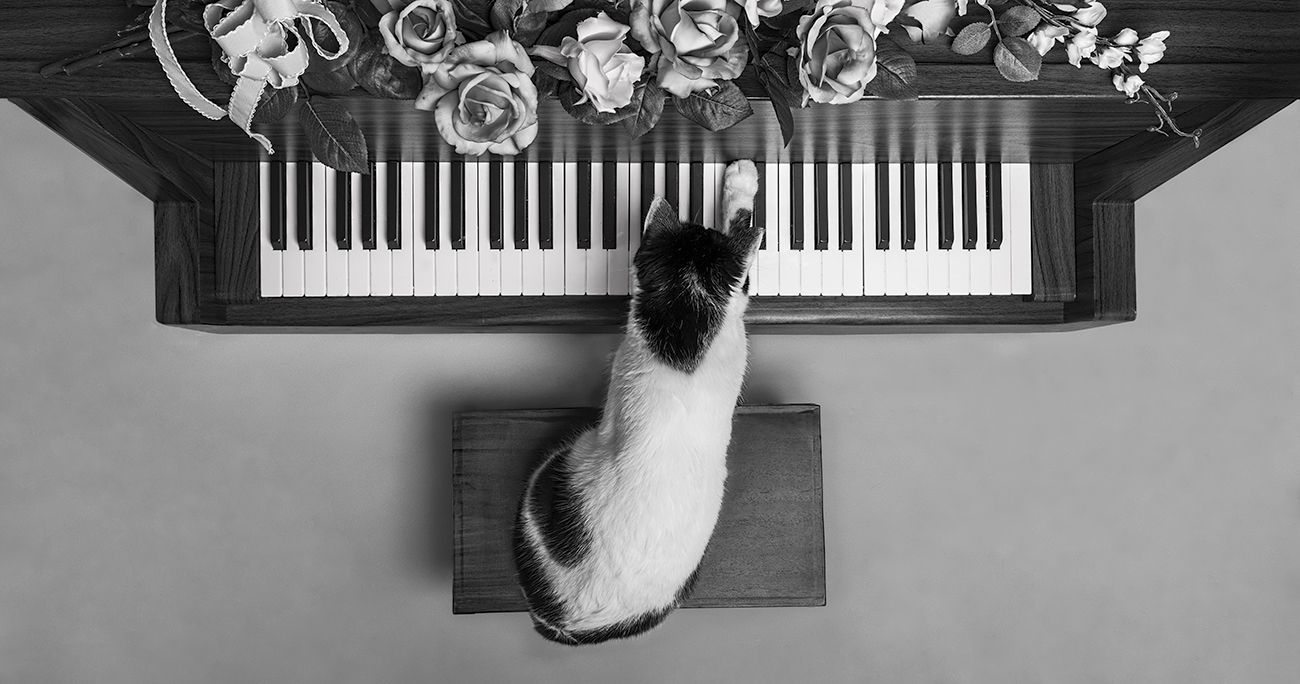A whimsical portrait of my cat playing on a piano converted into black and white for simplicity and impact.