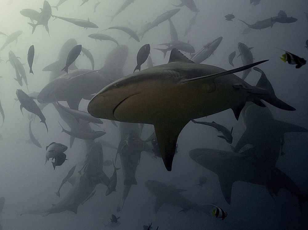 A group of 20 bull sharks dancing above my head
