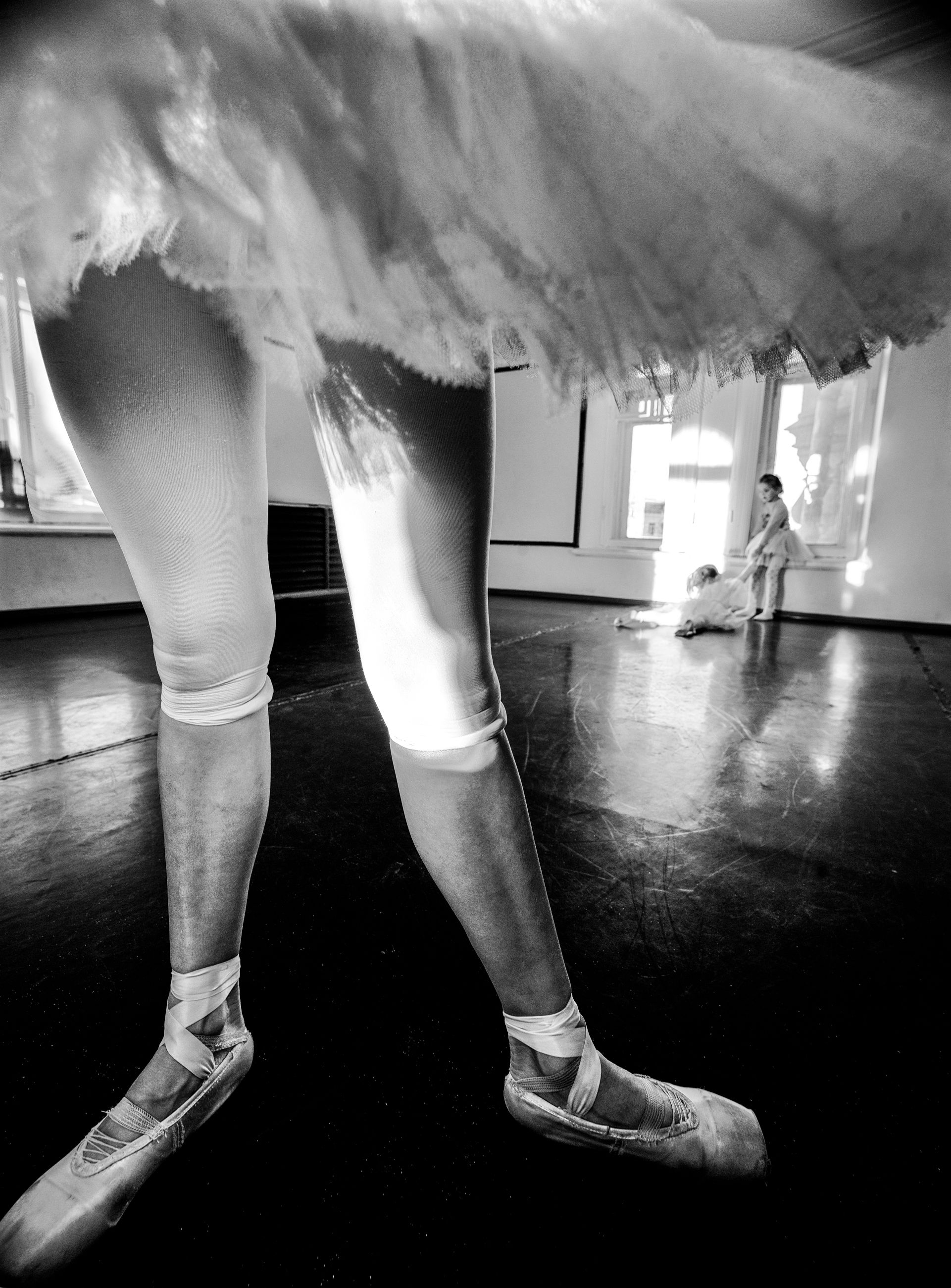 As their ballet instructor turns her back, two young aspirant ballerinas play their own game.