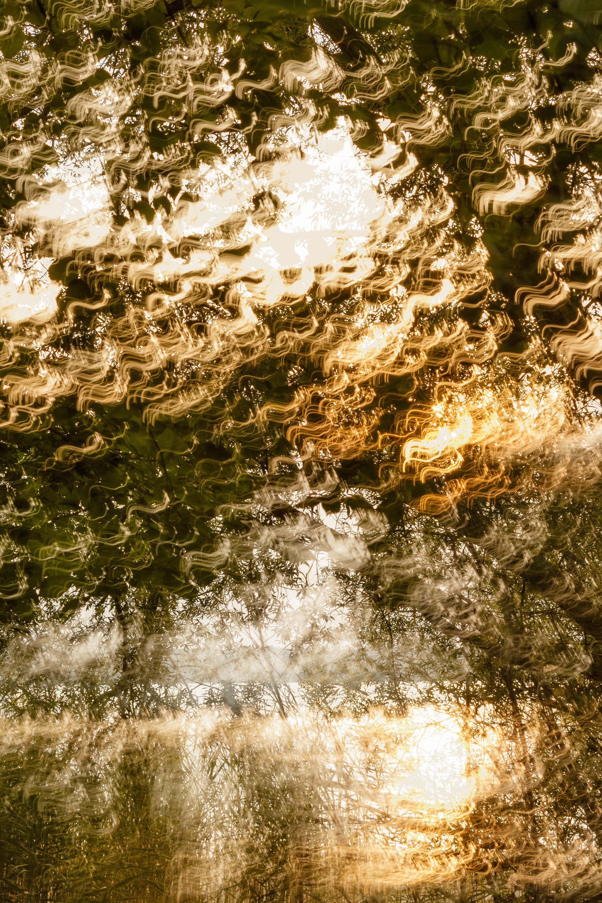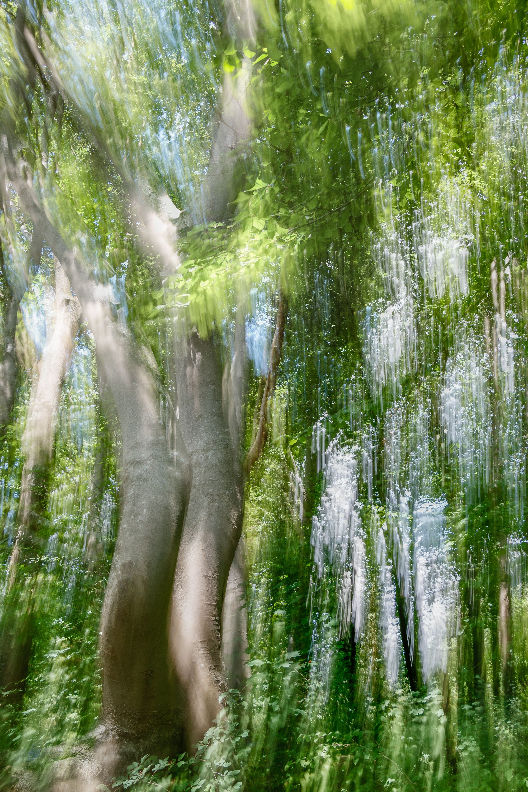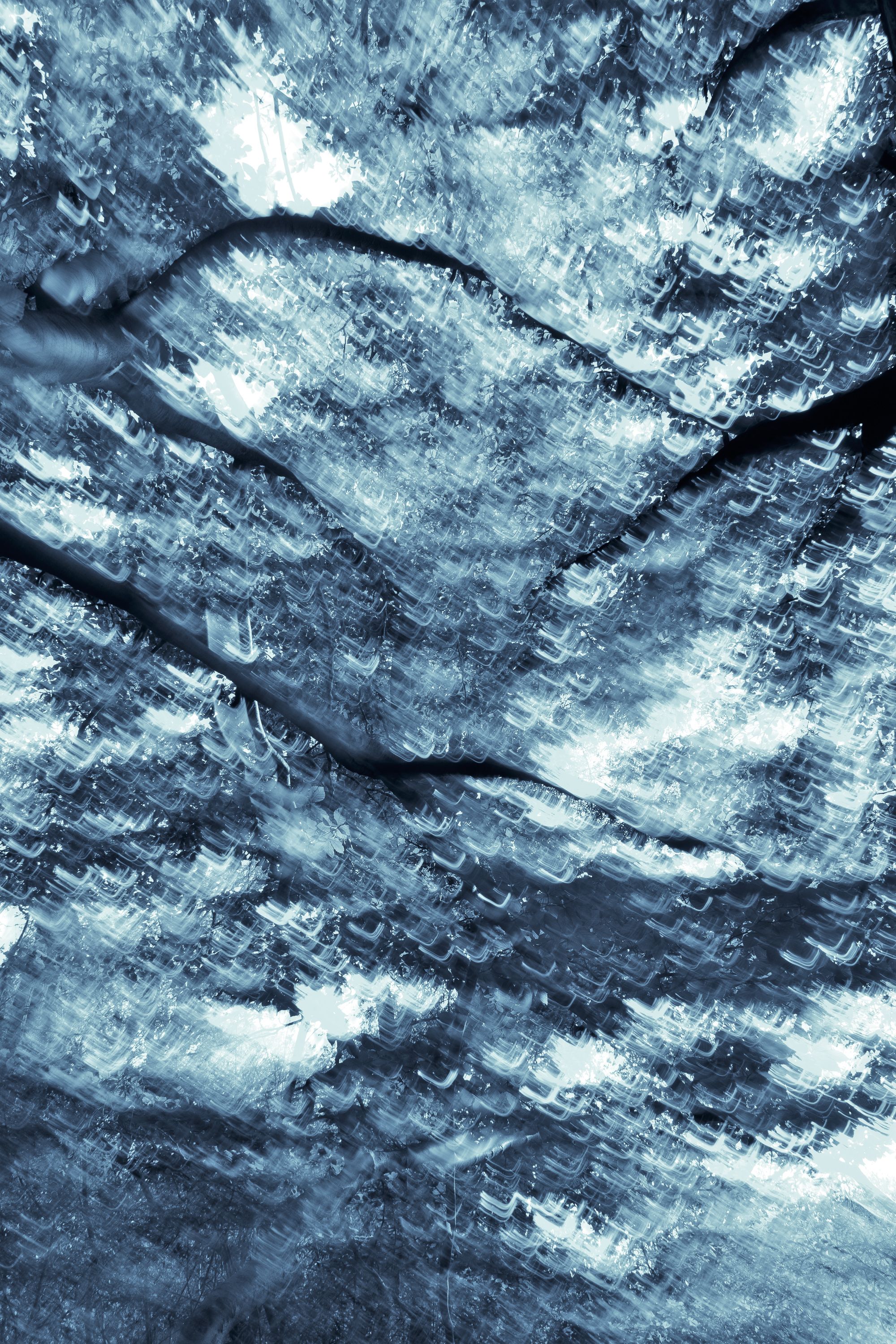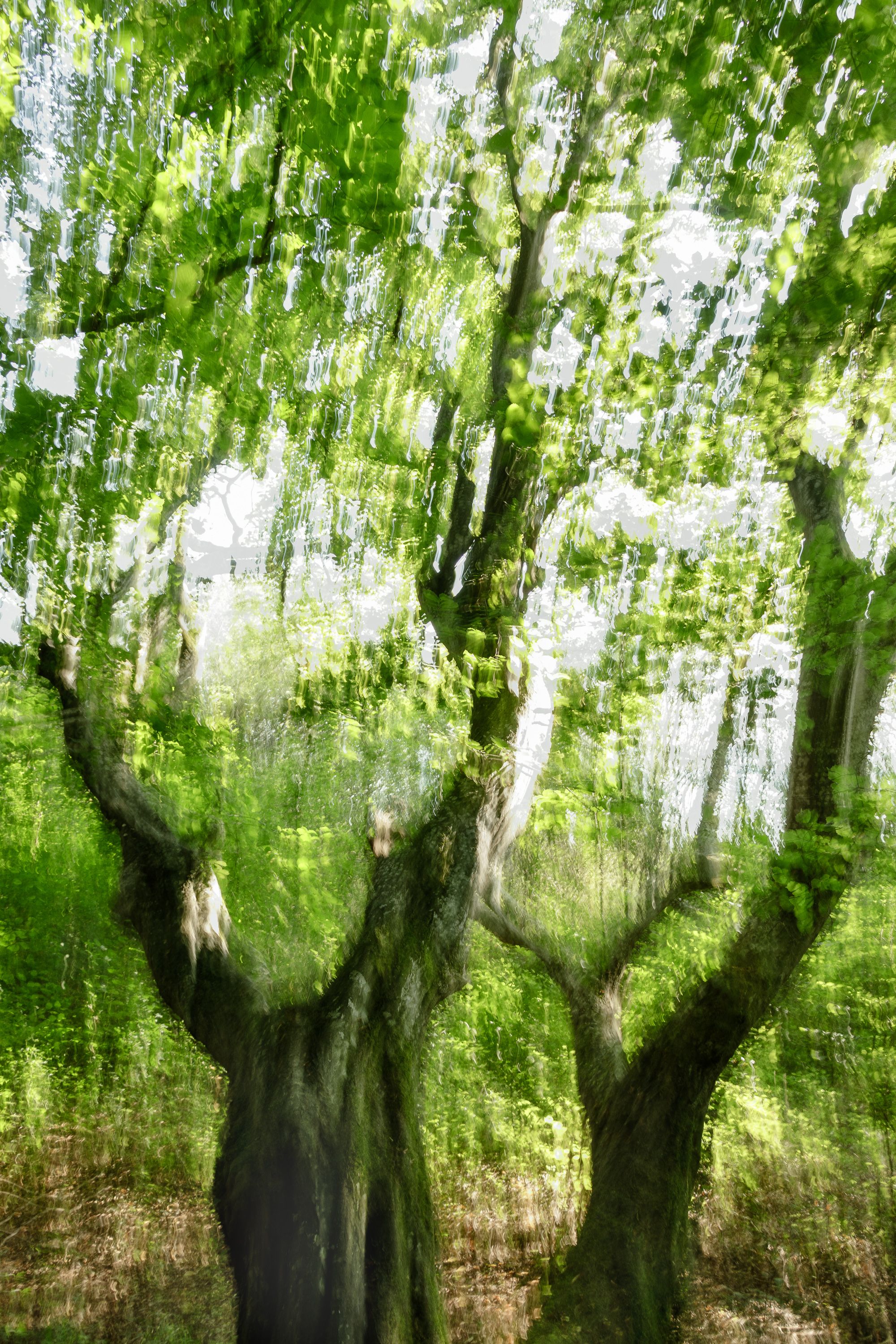 A forest with impressive tree individuals directly at the shore of the Ammersee was my playing field. I found expressive branches and trunks, which remind me partly of human torsi, partly of trumpets, which sound loudly from the ground. The trees seem so vibrant to me, as if they were speaking a language that is unknown to me. Many of these strong trees seem to be fed directly by the power of Lake Ammersee and its afternoon and evening light.With the help of multiple exposures I created photographs directly on site, which correspond to my perception of the subtle tones of the nature creatures.
