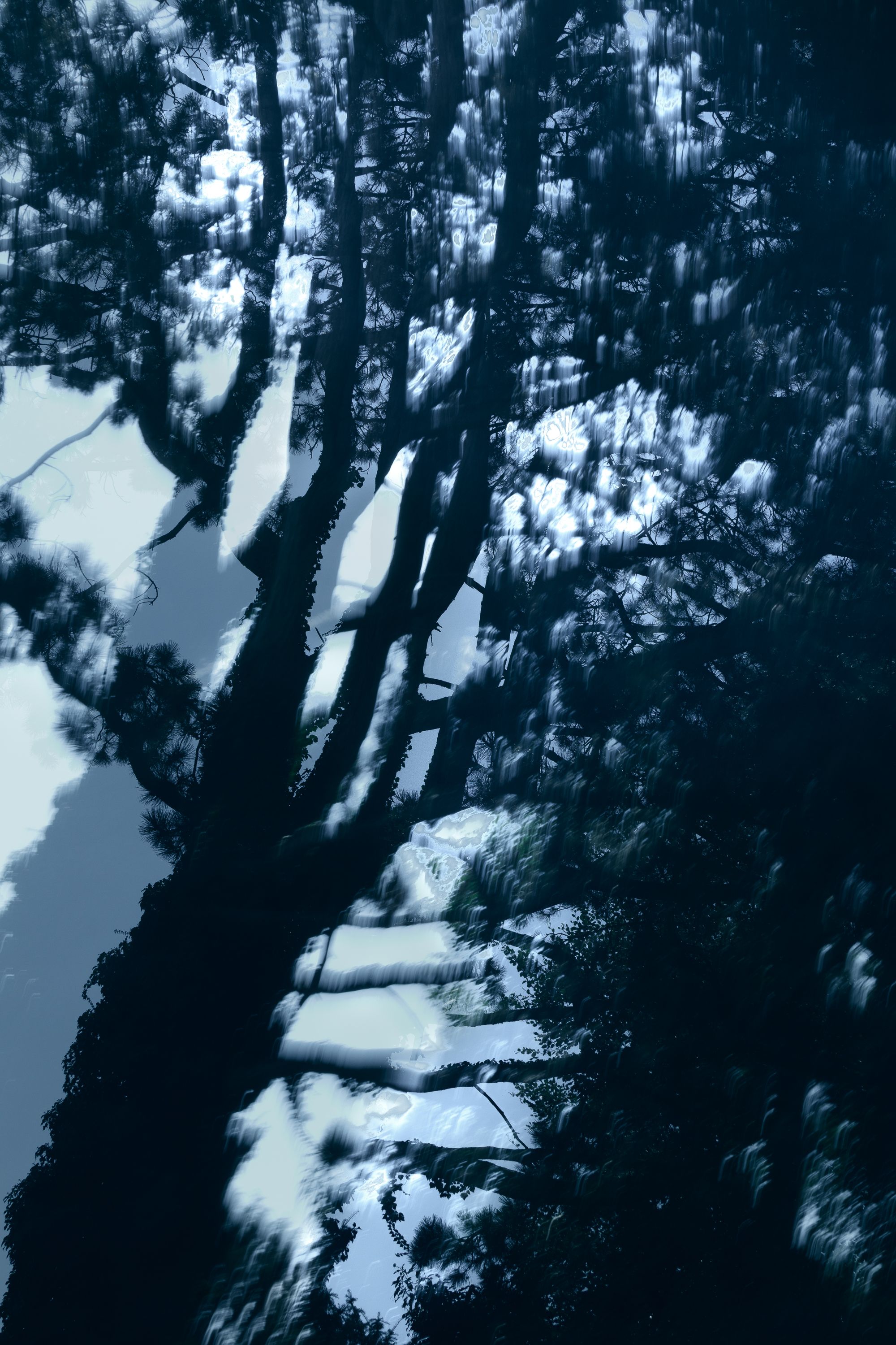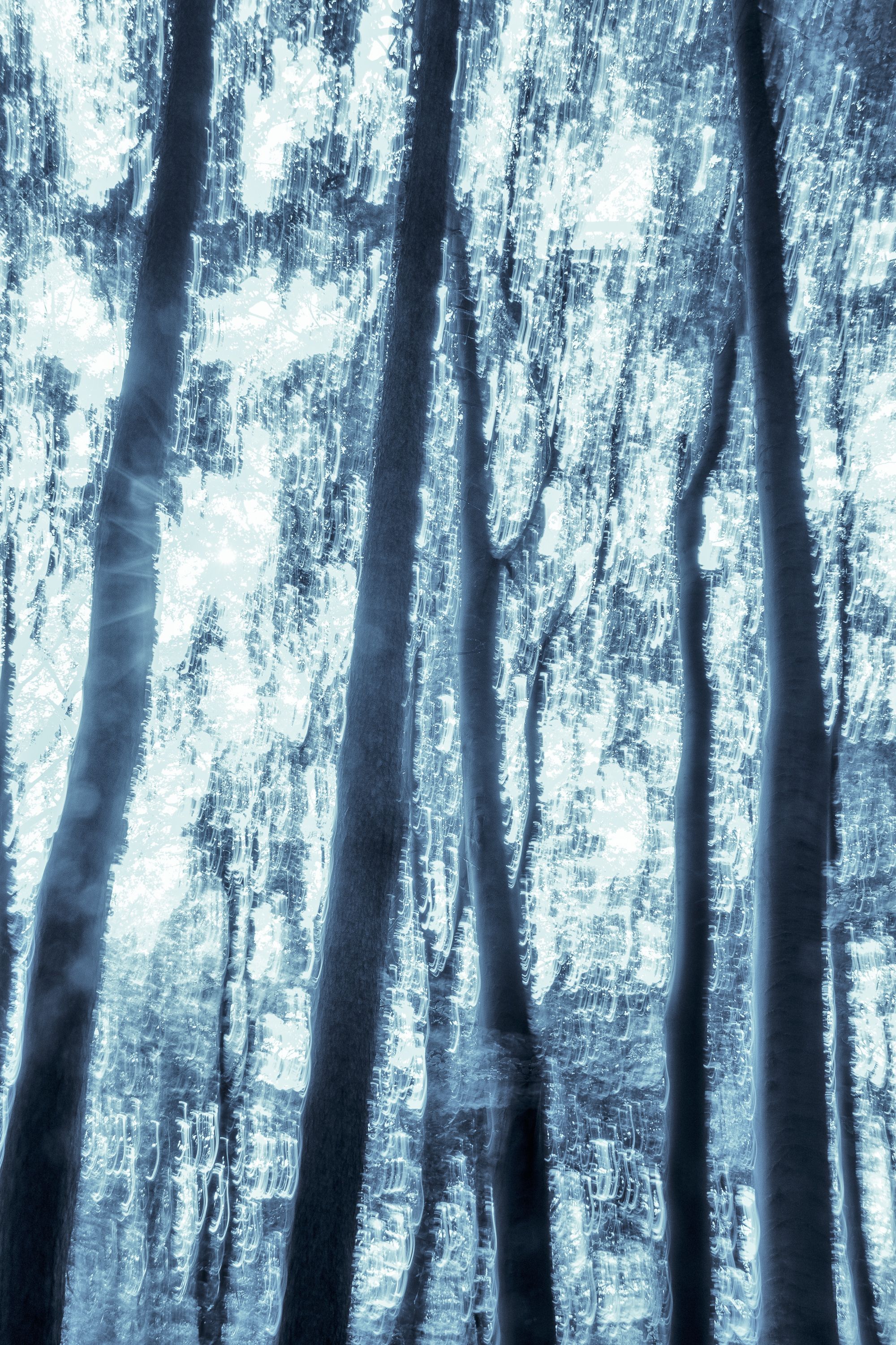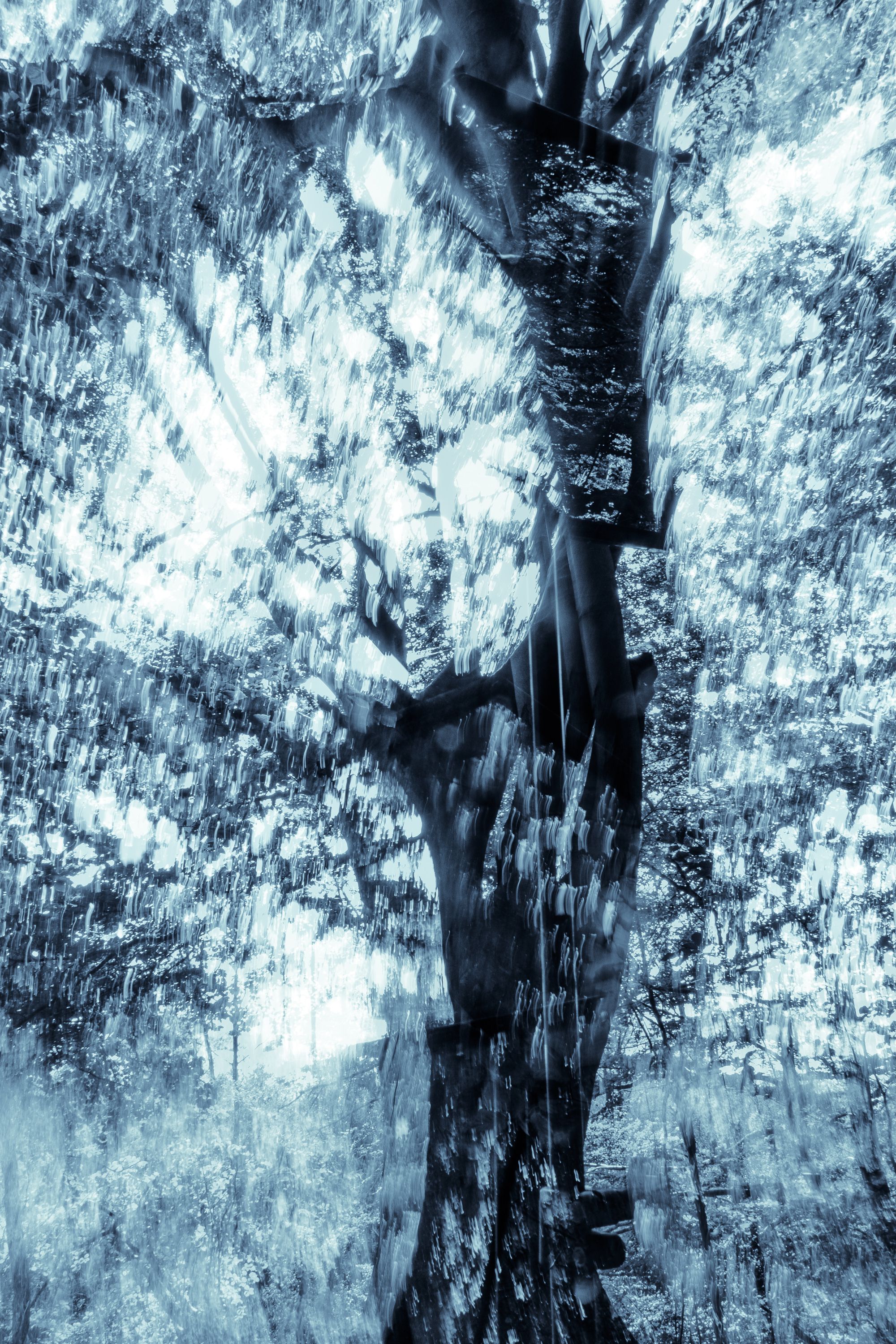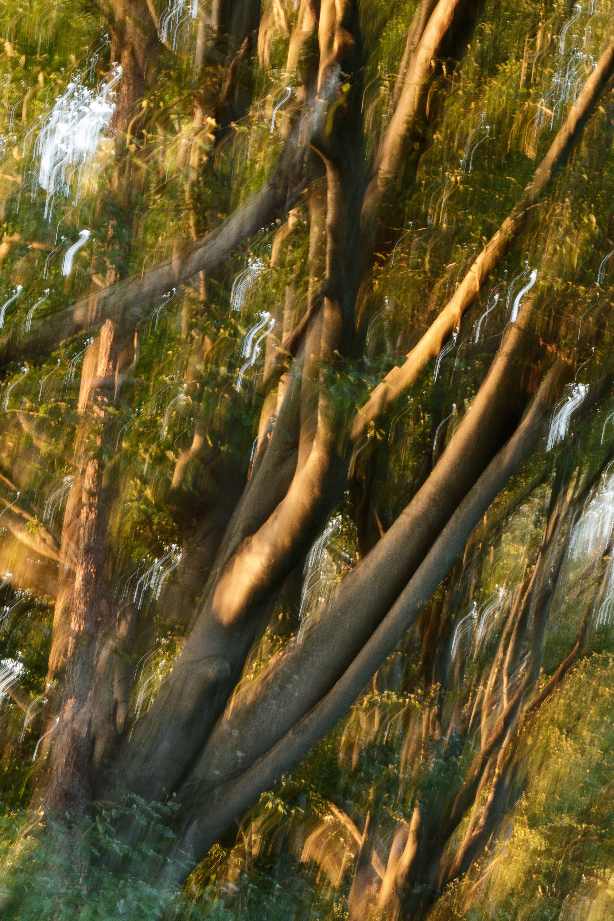 A forest with impressive tree individuals directly at the shore of the Ammersee was my playing field. I found expressive branches and trunks, which remind me partly of human torsi, partly of trumpets, which sound loudly from the ground. The trees seem so vibrant to me, as if they were speaking a language that is unknown to me. Many of these strong trees seem to be fed directly by the power of Lake Ammersee and its afternoon and evening light.With the help of multiple exposures I created photographs directly on site, which correspond to my perception of the subtle tones of the nature creatures.