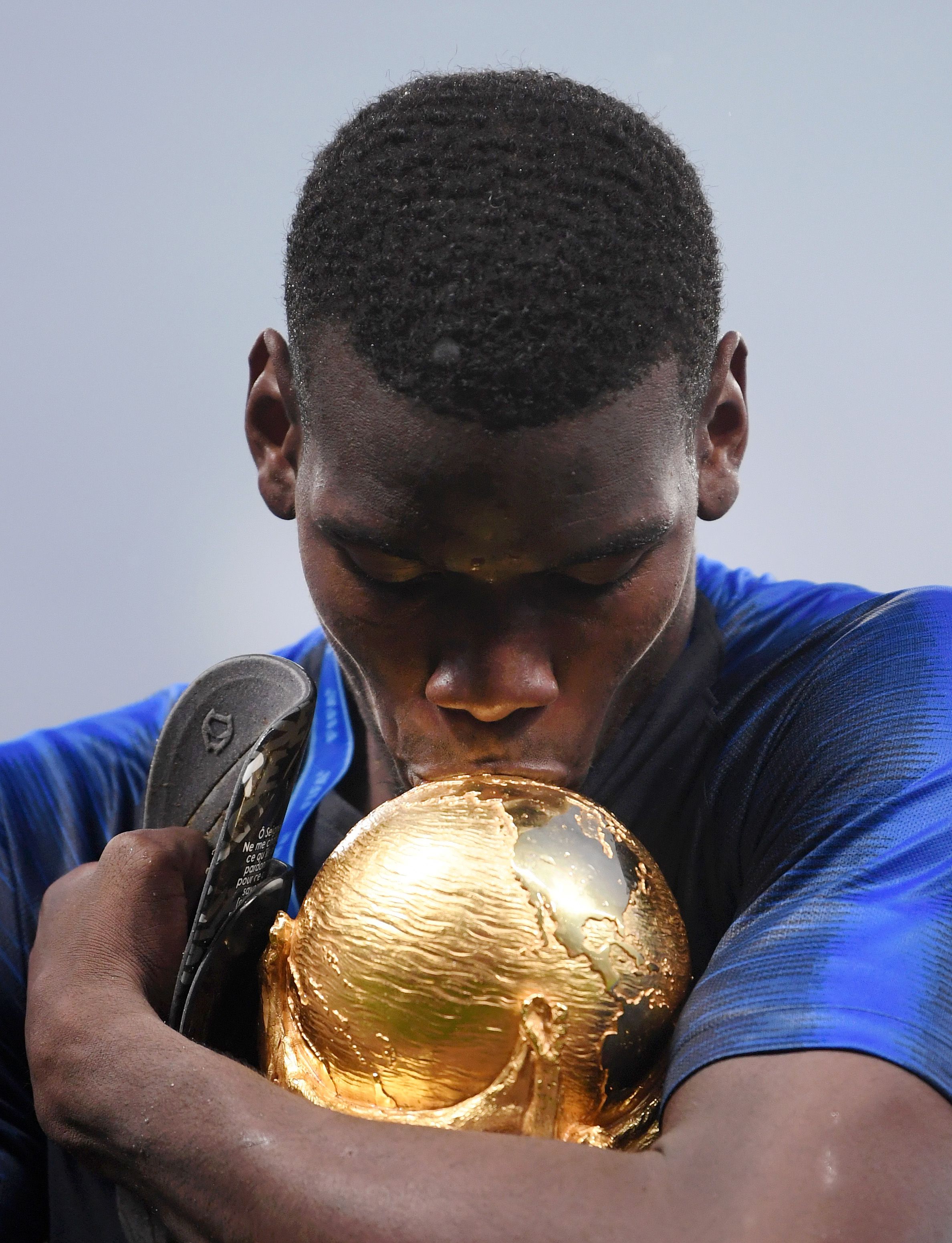 MOSCOW, RUSSIA - JULY 15: Paul Pogba of France kisses the World Cup trophy following during the 2018 FIFA World Cup Russia Final between France and Croatia at Luzhniki Stadium on July 15, 2018 in Moscow, Russia. (Photo by Laurence Griffiths/Getty Images)