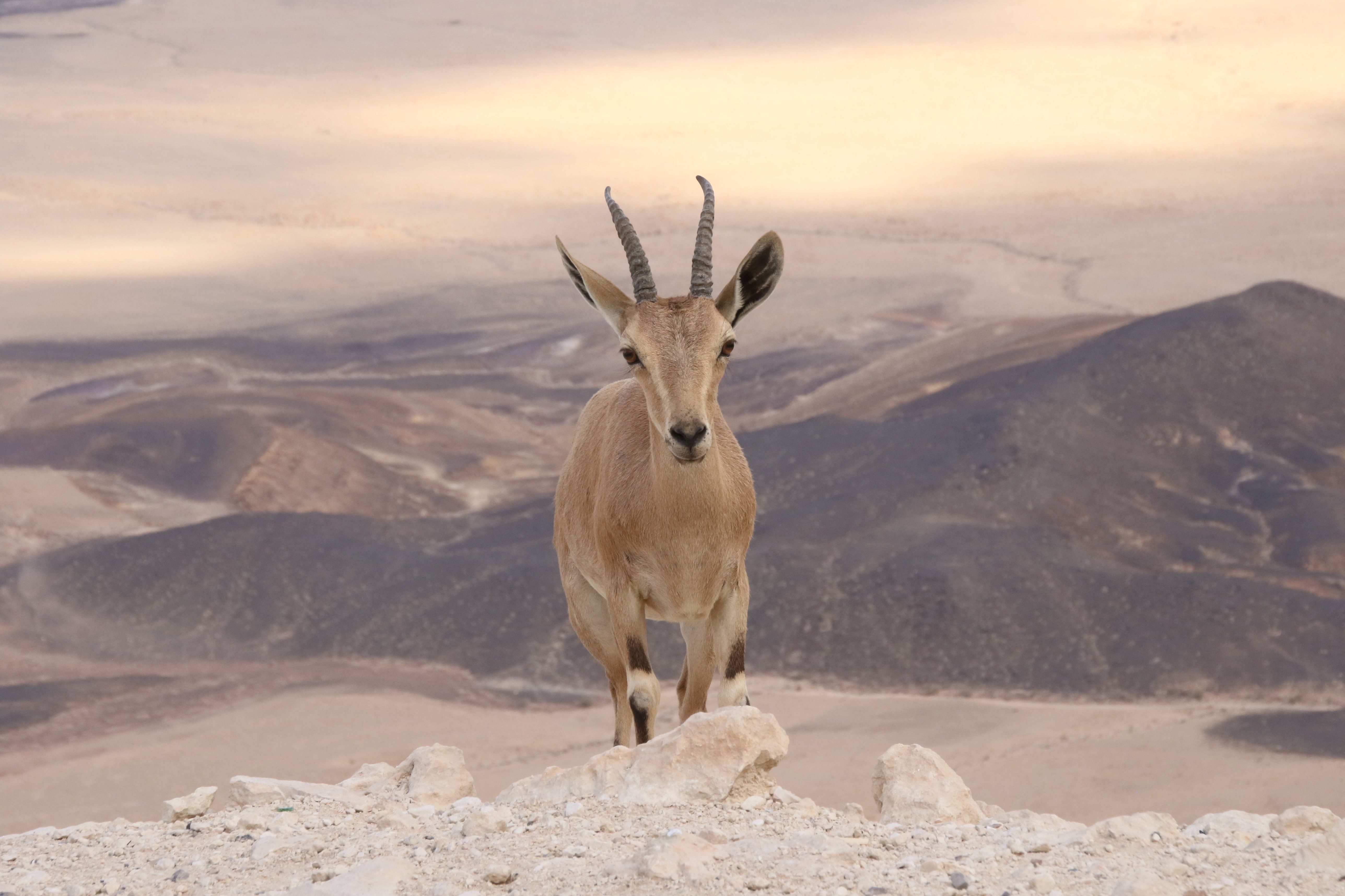 A lone Ibex stands on the rim of the world's largest crater at Mitzpe Ramon, Israel