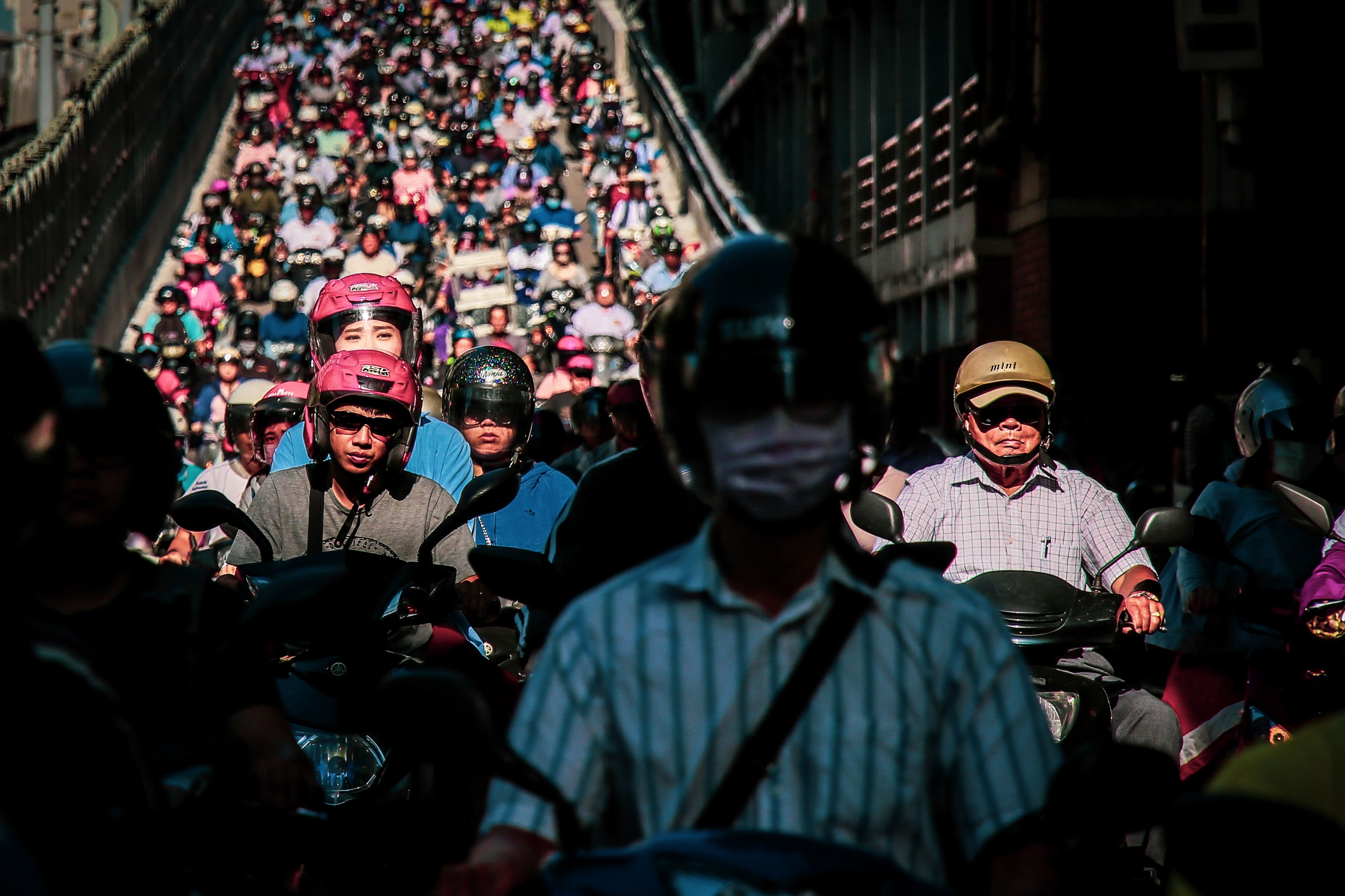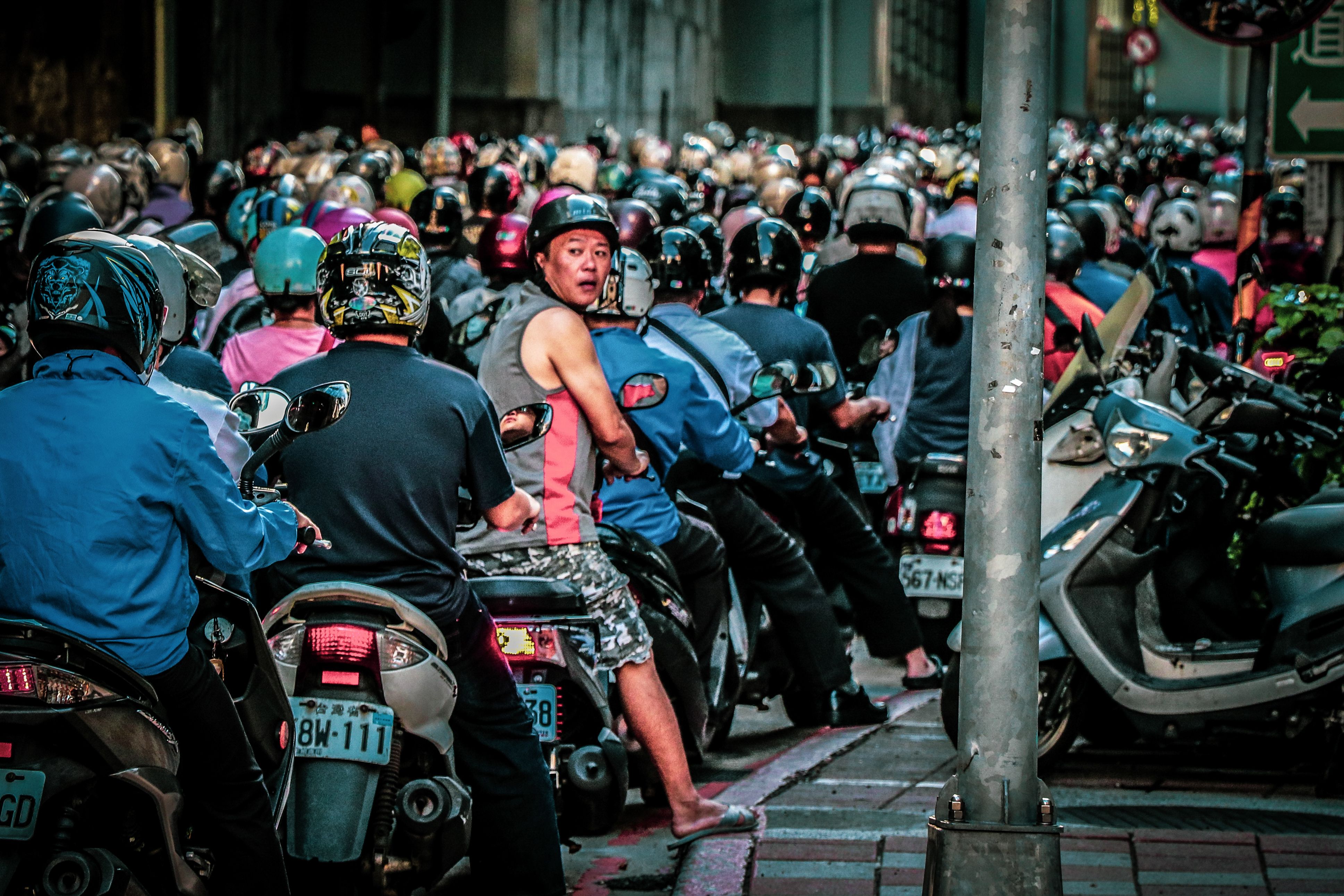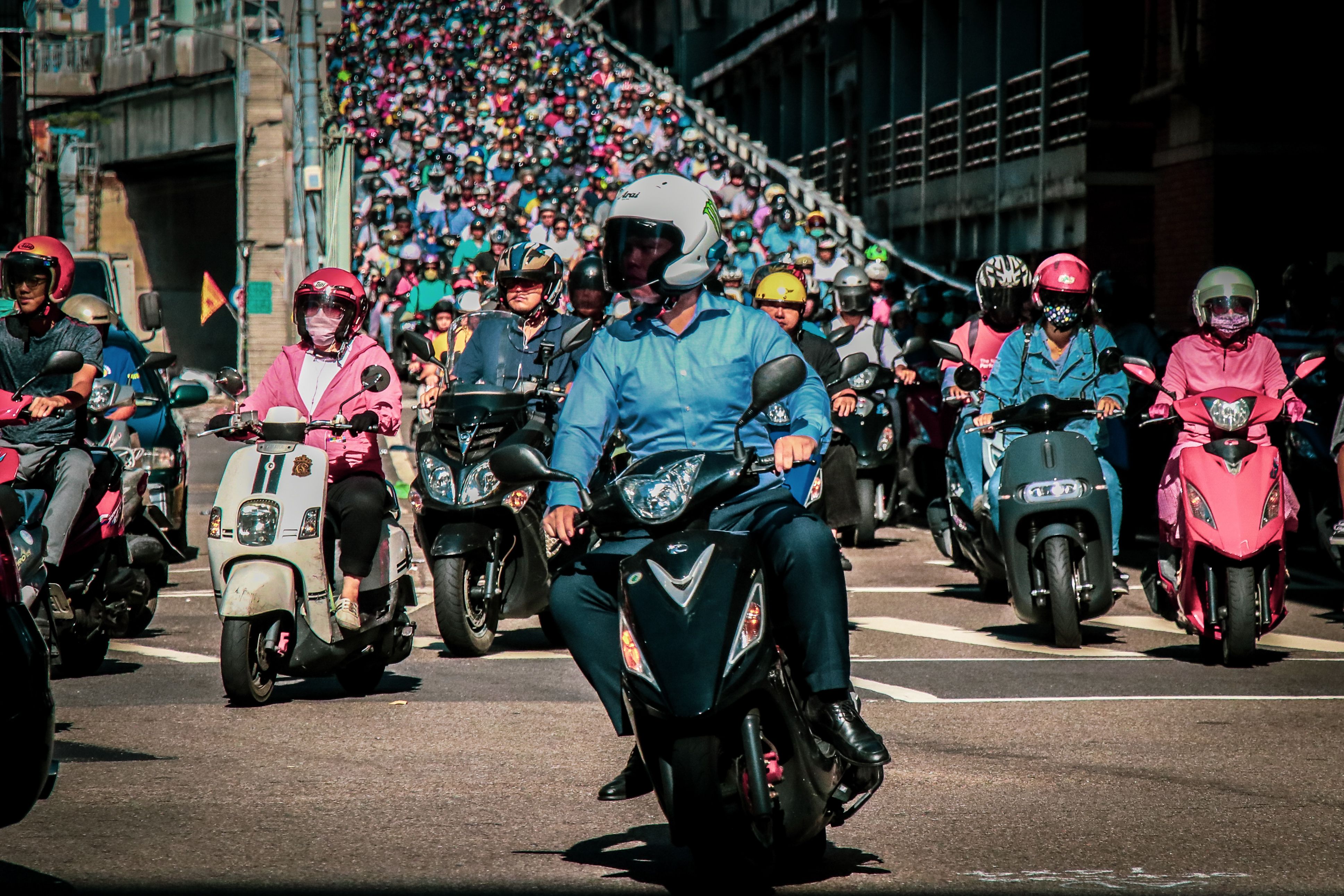 Taiwan has the highest scooter density in the world. According to the statistics of the Ministry of Communications of Taiwan, 71.1% of scooter riders will not choose to take public transportation because of the lower cost and high mobility. This is the bridge between Taipei City and New Taipei City. There are 15,000 scooters per hour through the bridge at the peak time, most of them are rushing to work. This scene that happens every weekday morning just like a waterfall.