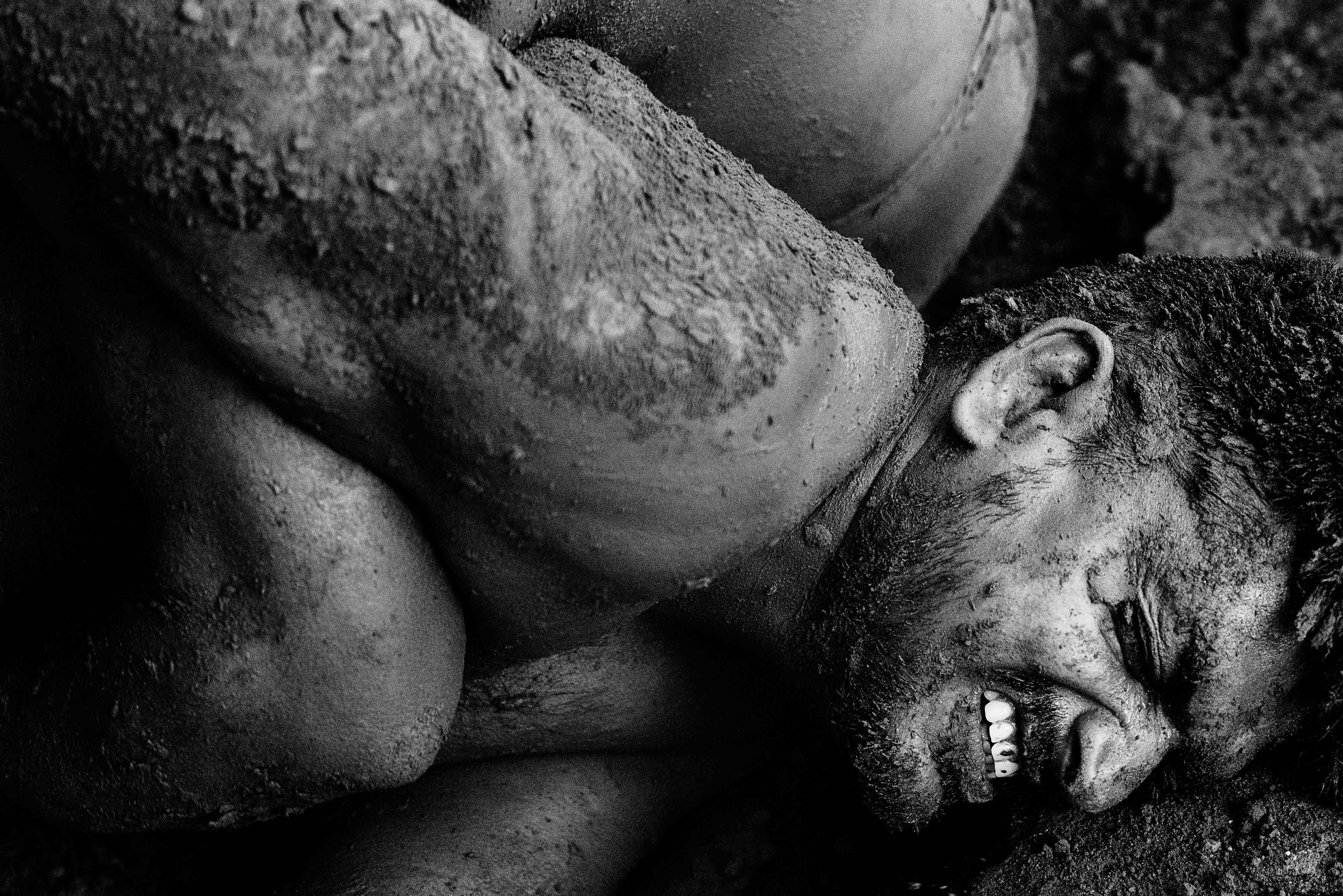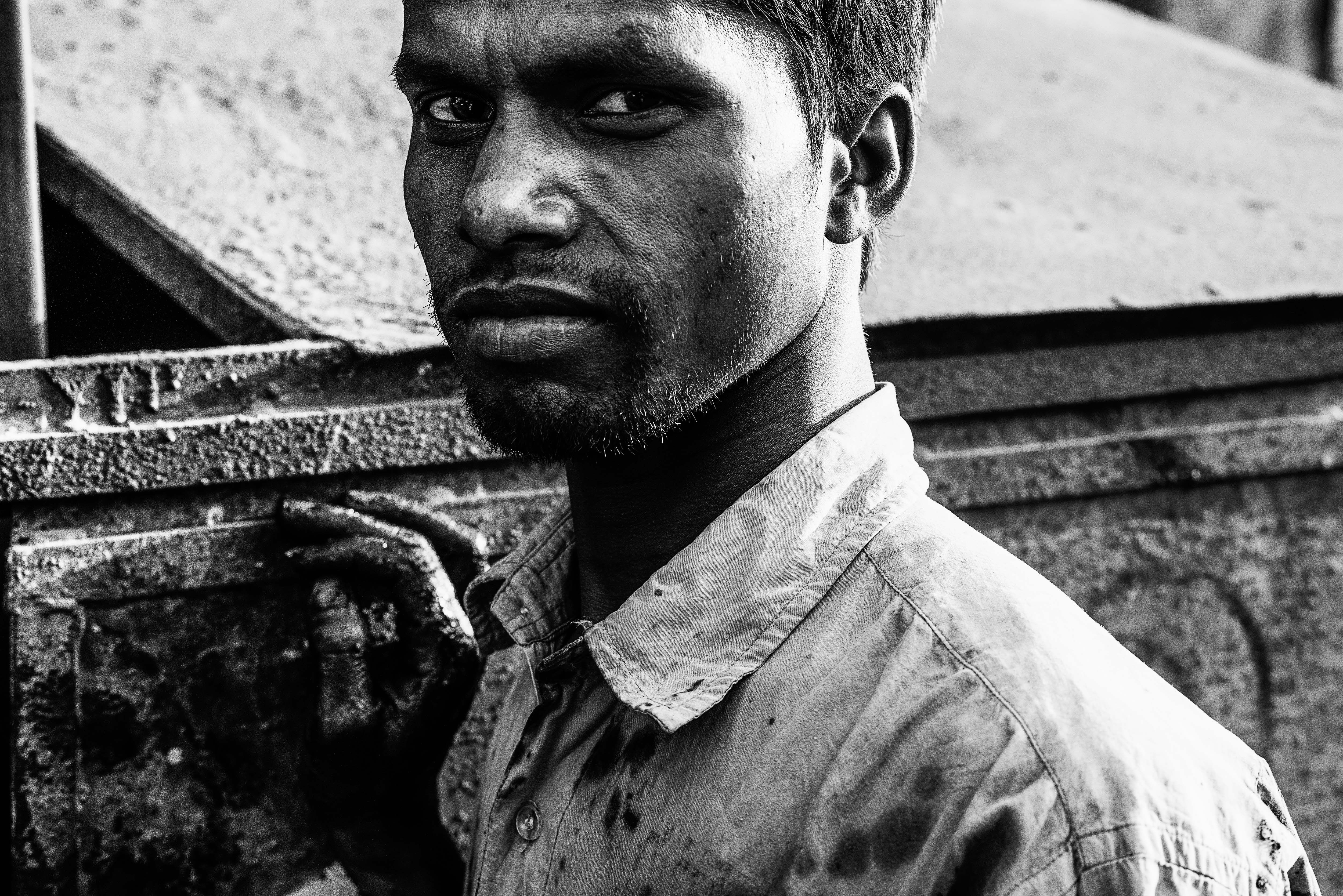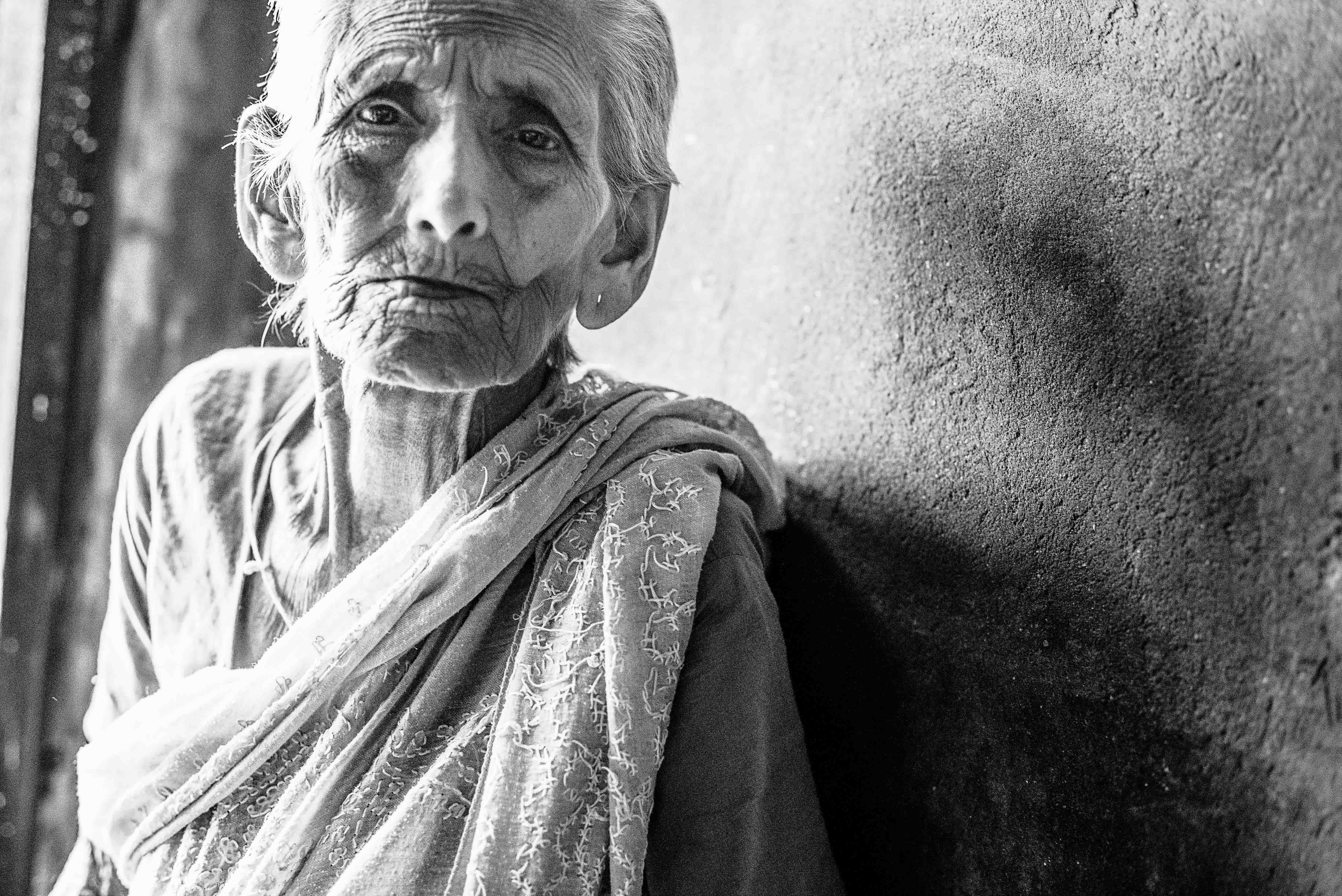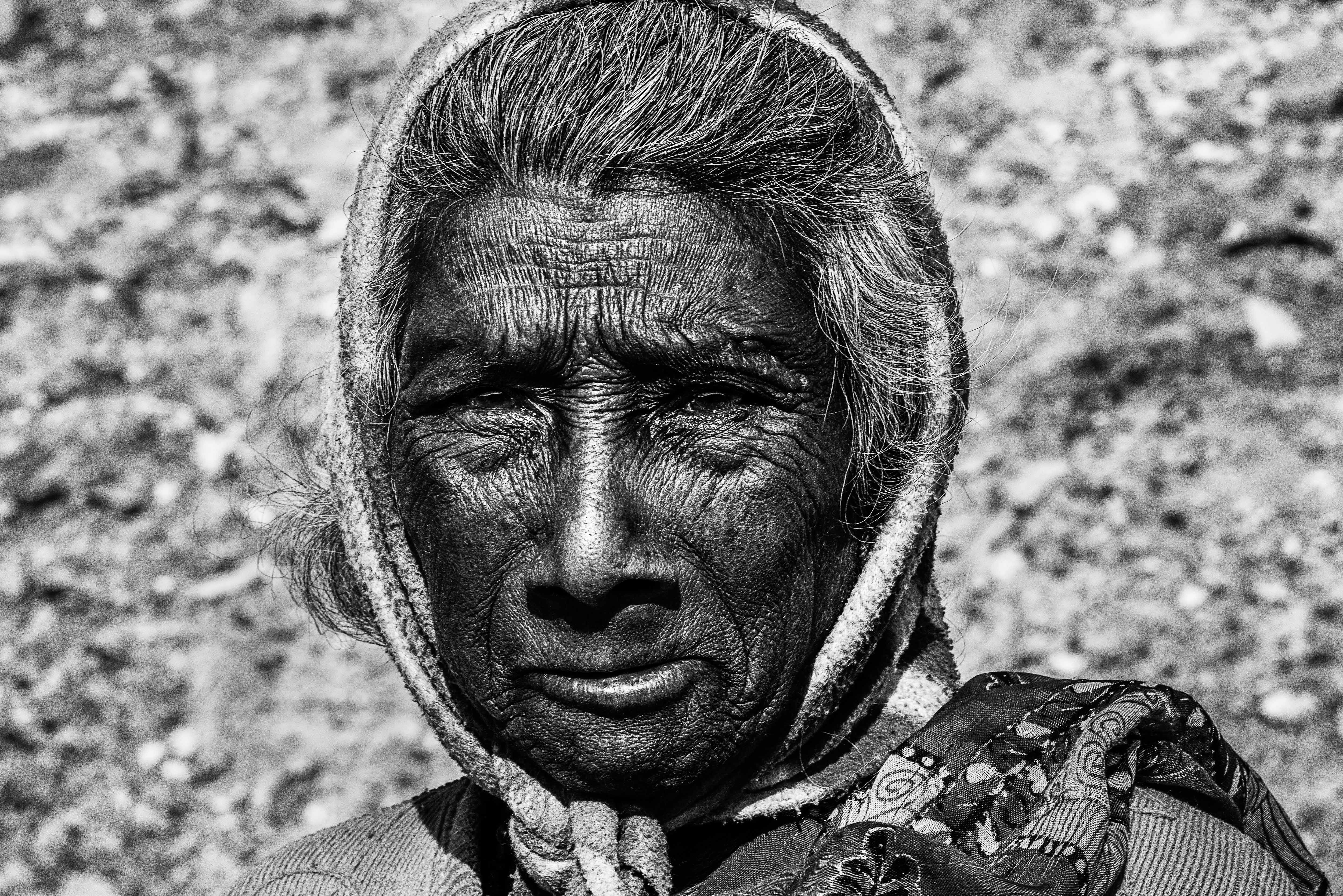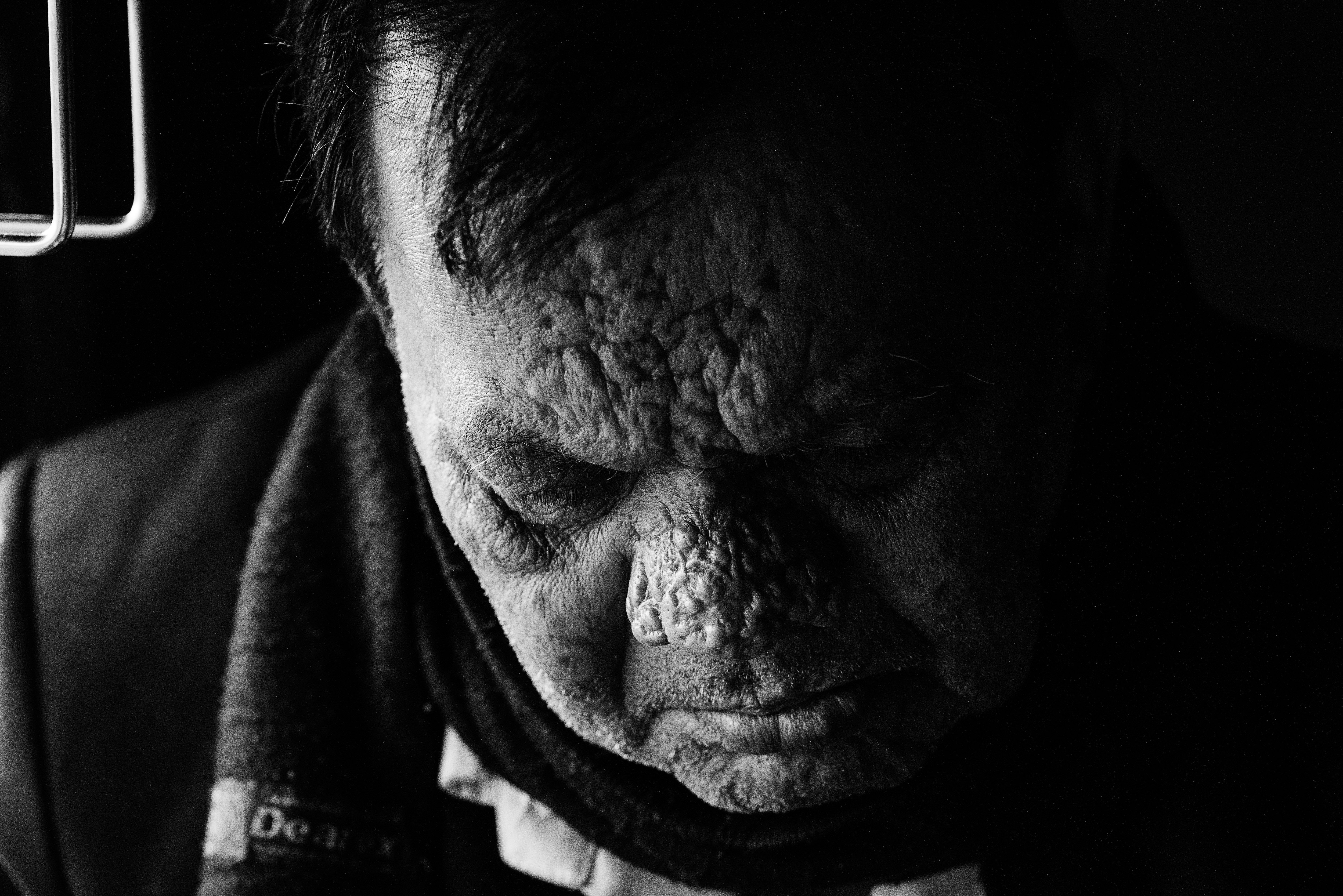 Human expressions from different sects of life, caught on 85mm prime lens: The people in this series are a Hindu pilgrim capturing memory with his cellphone lens at Kumbh fair, Prayagraj, India, an aged tribal woman in the dry and rough district of Purulia (India), an Indian mud wrestler of Kolkata, a 93 years old widow in Varanasi(India), a road worker in Kolkata with his hand covered in tar and a man with rough skinned face whom I found as co-passenger in train.