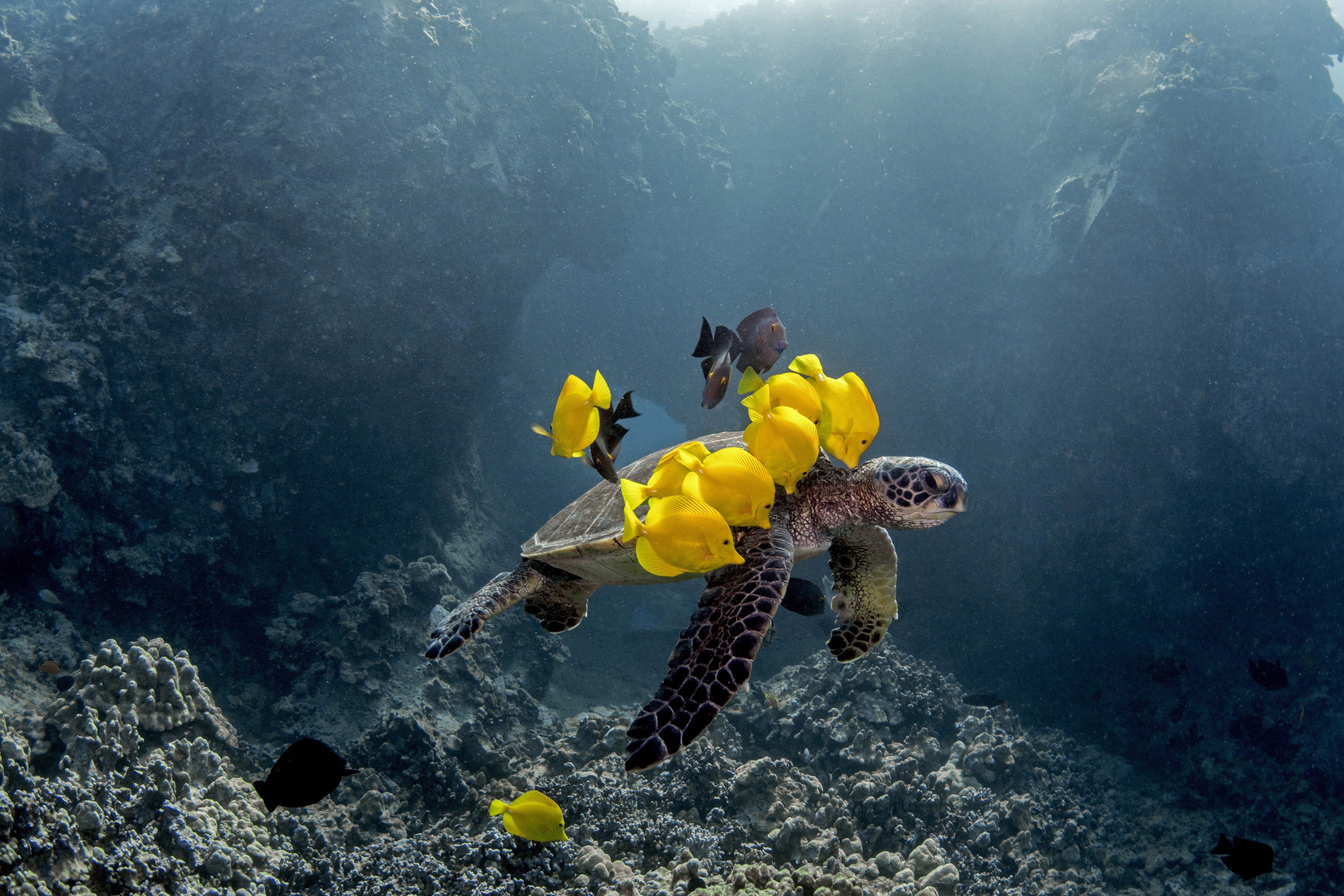 Green turtles visit certain reefs that are populated with tangs, which nibble at the algae that accumulates on the turtle's shells and bodies.