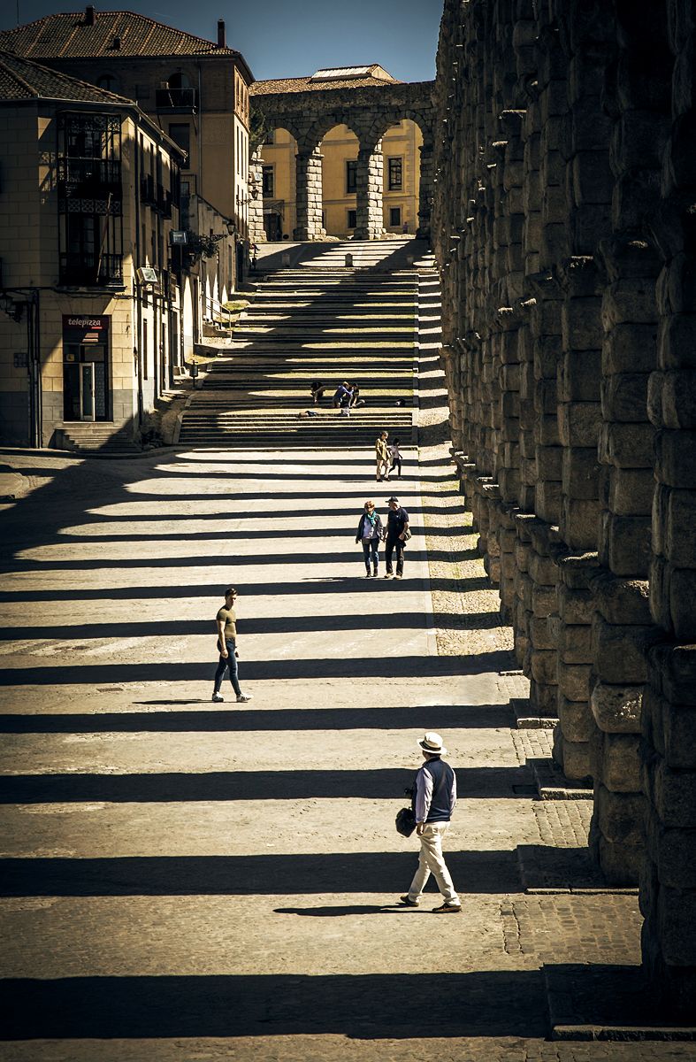 In Segovia, Spain, the aqueduct was built by Roman from the late 1st century. When sunlight came through the architecture, it seems like a piano with black and white keys. People were there representing different stories of life.