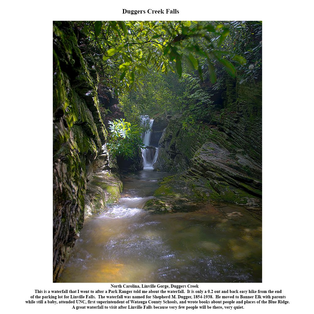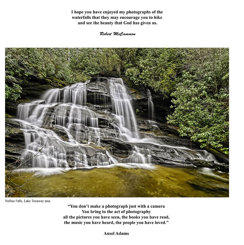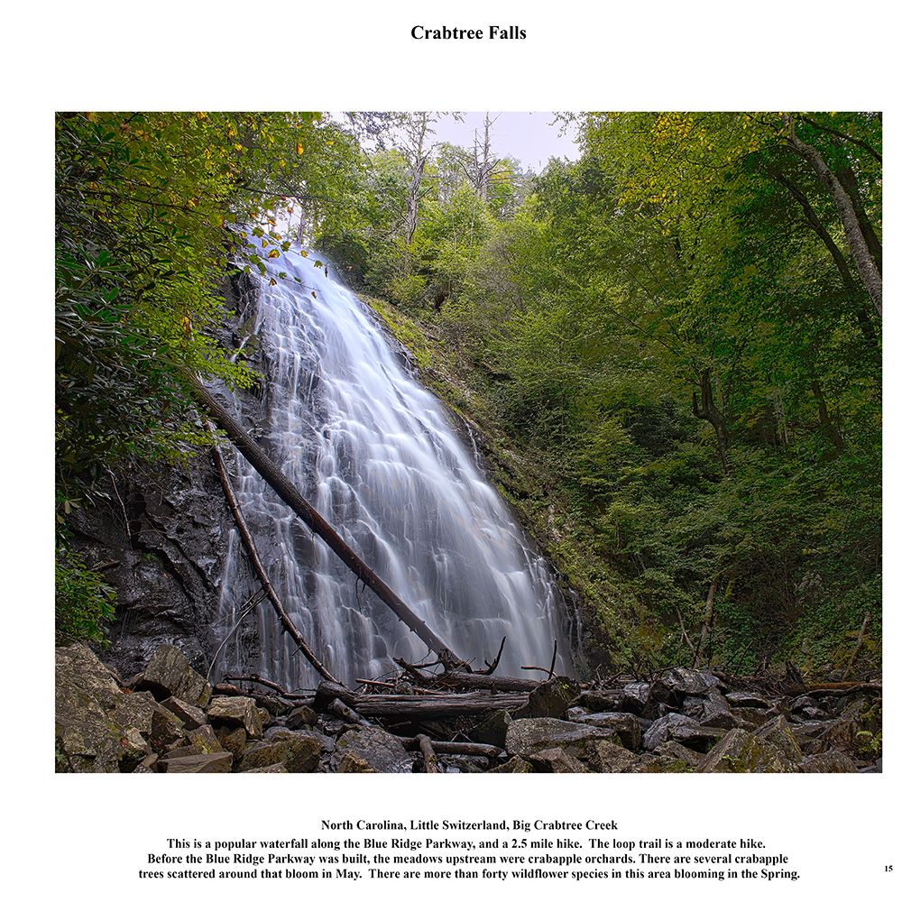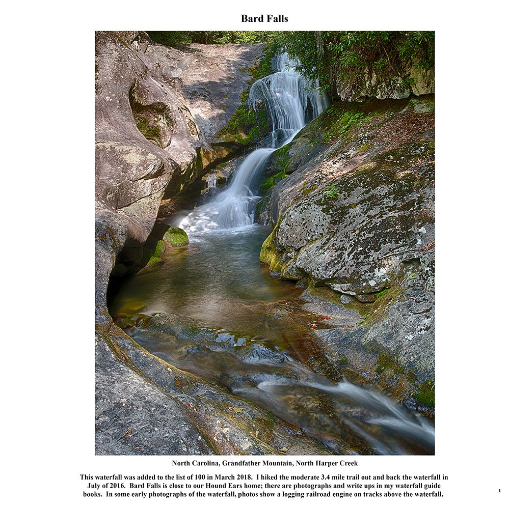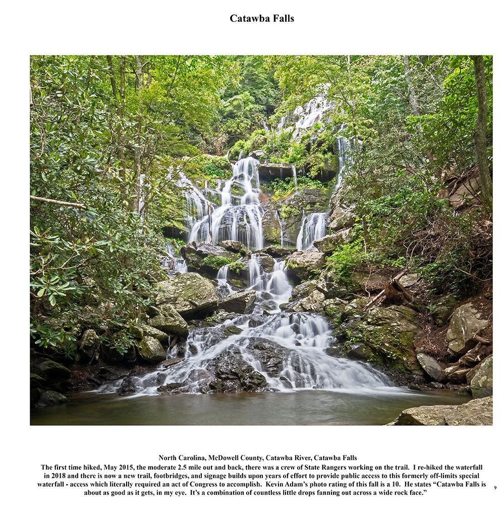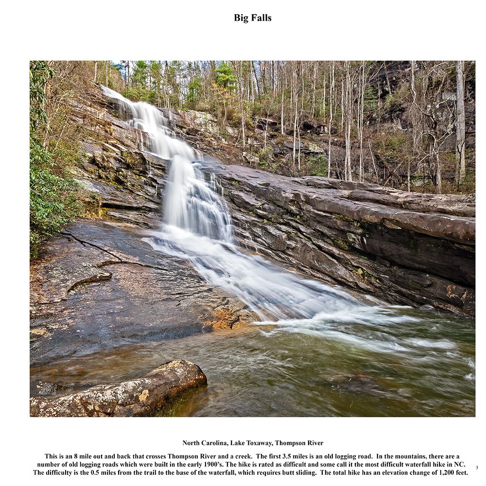 I completed Carolina Mountain Club's 100 Waterfall Challenge (25 people have completed the challenge)and developed a book of the 100 waterfalls I hiked and photographed. Friends saw the book and requested a copy, leading me to publishing “Waterfalls of the Carolinas.” The book includes images of the 100 waterfalls in the challenge, plus three waterfalls that were dropped from the challenge, and 16 images of other waterfalls photographed while completing the challenge. This required 290 miles of hiking.