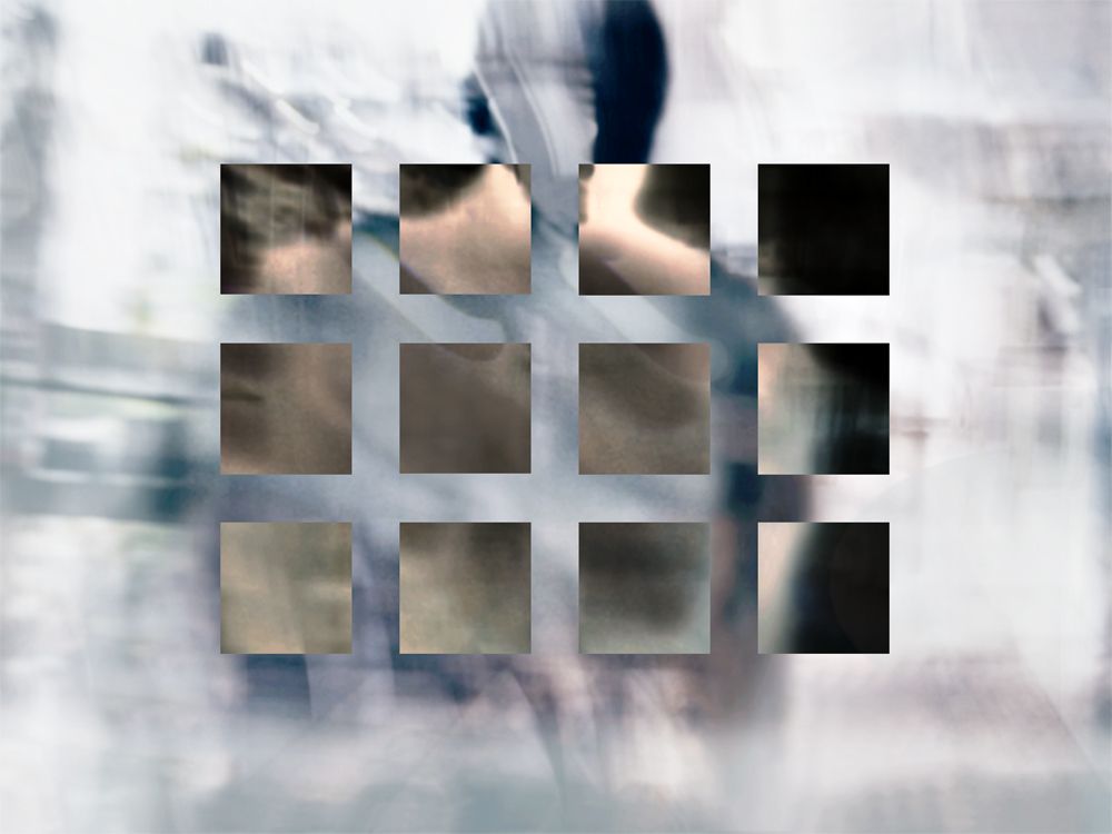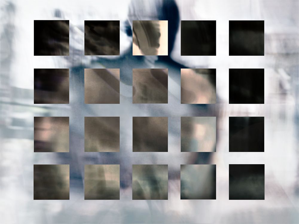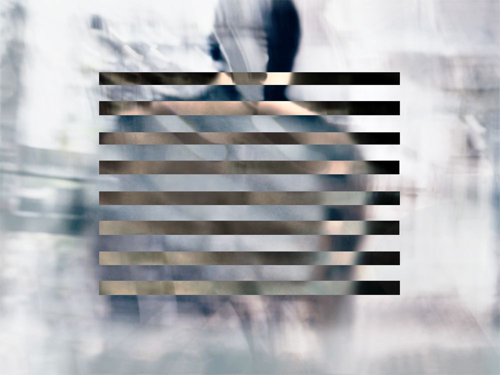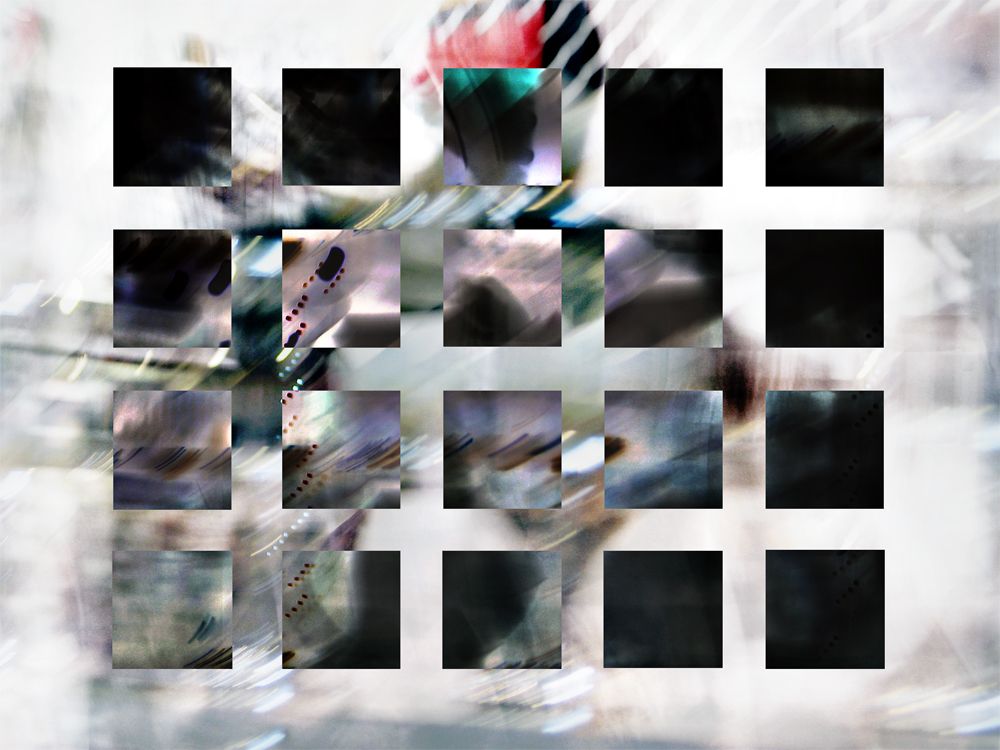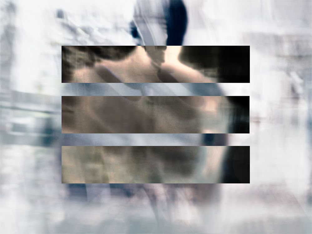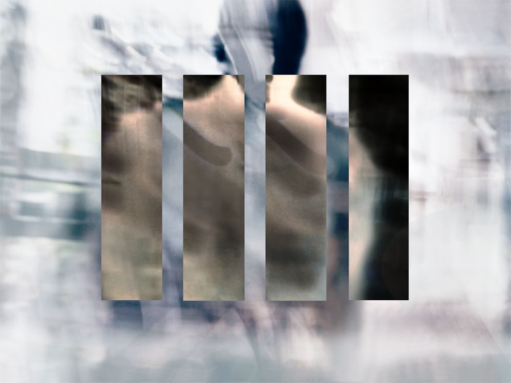 AMBIT SERIES: This series tells a visual story in an an abstract space. Inverted graphics appear over a monochromatic digital photo composite figure, until color appears, as the image appears to dissolve and come forward from the background.