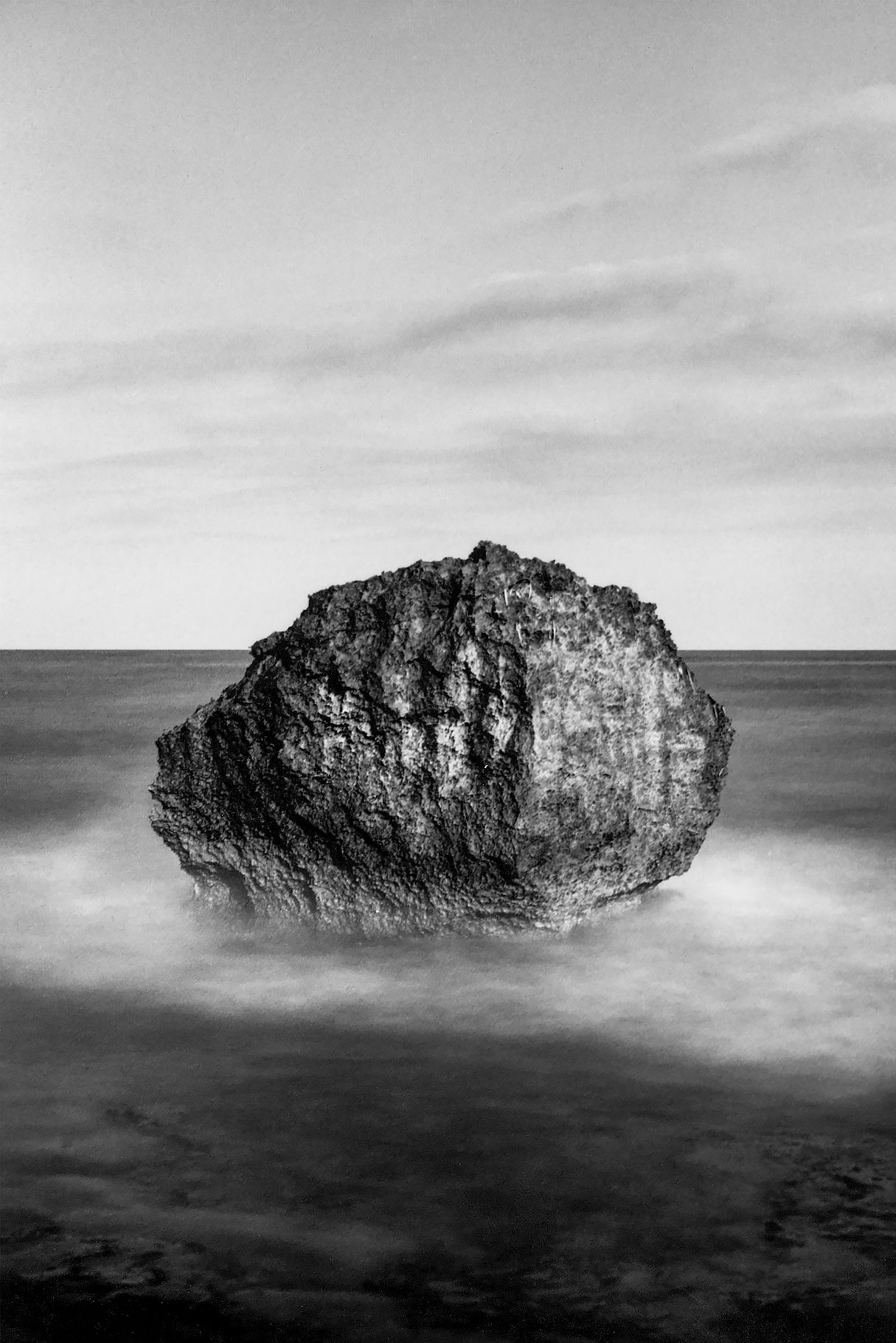 Meteor is an exploration of the contrast between the still and the fluid, the harsh texture of geological structures and the glassy smooth of the surface of the sea. This image was photographed using black and white film and hand printed on silver gelatin darkroom paper.
