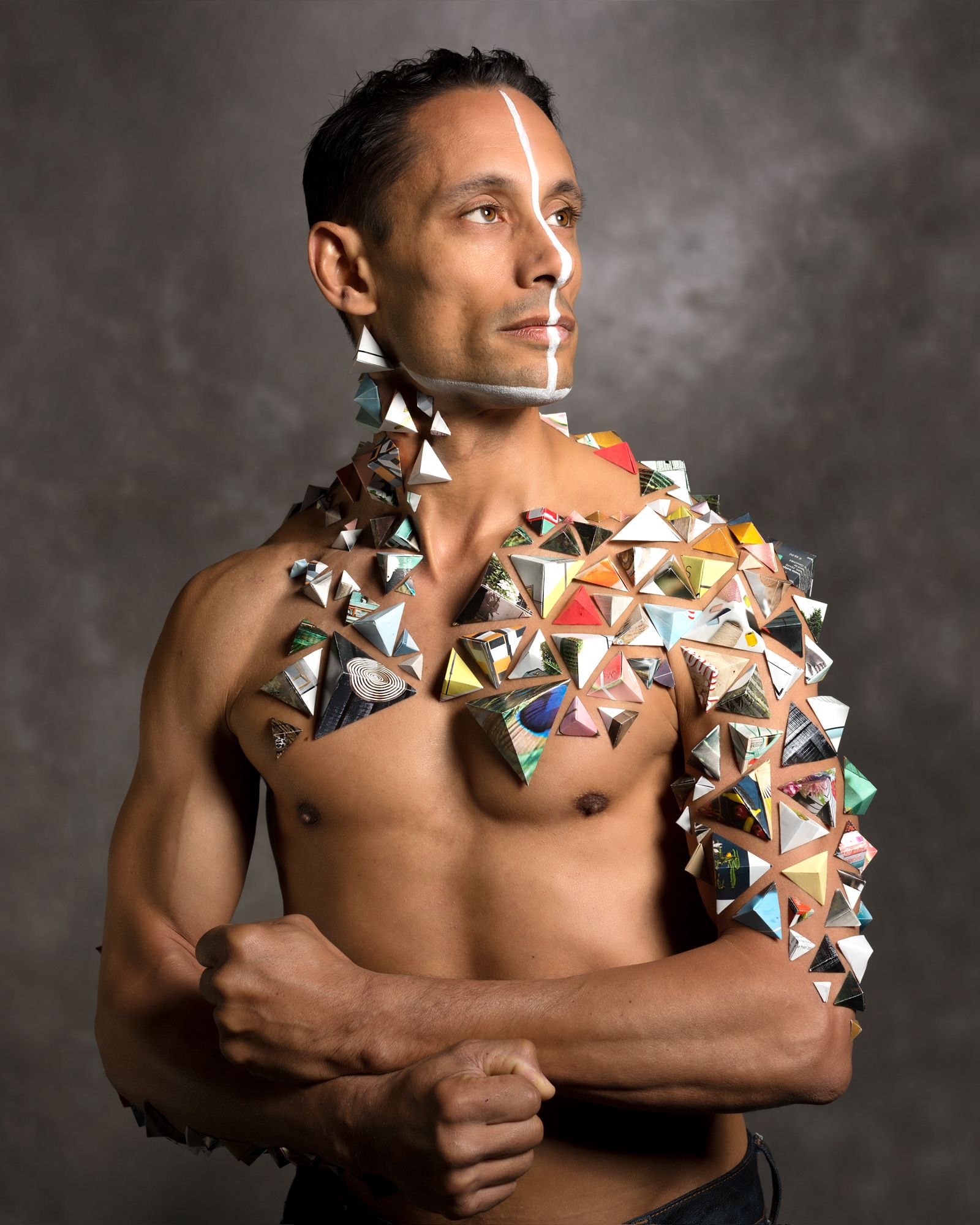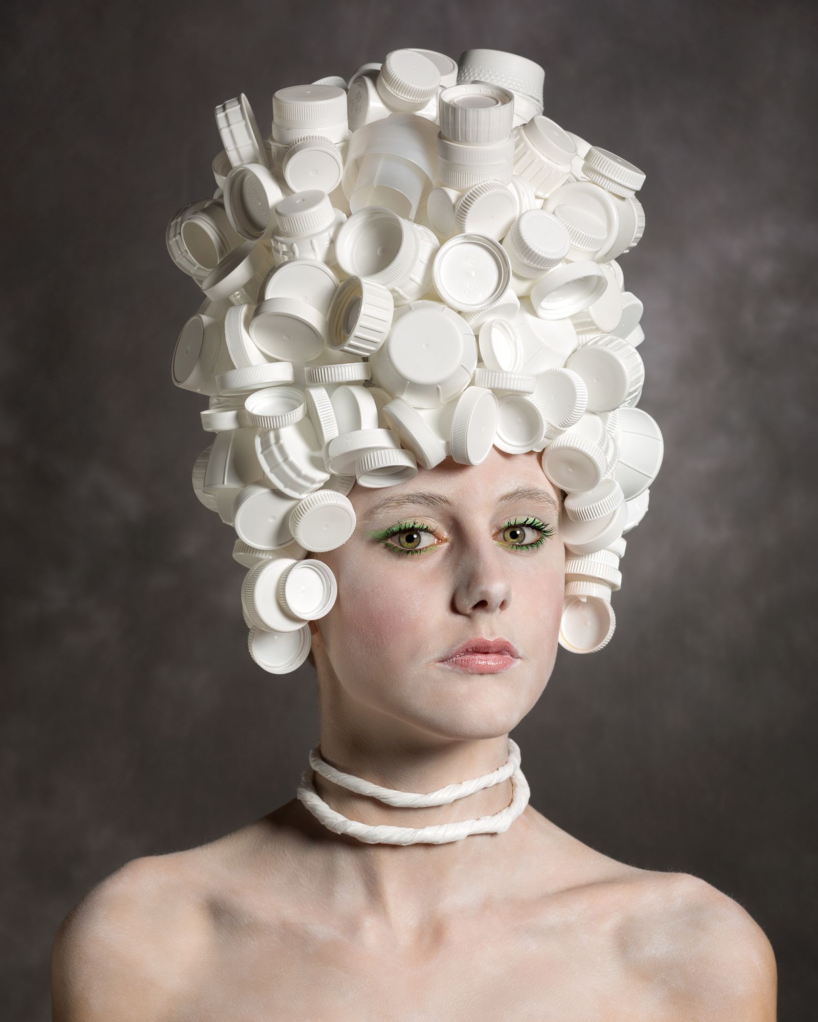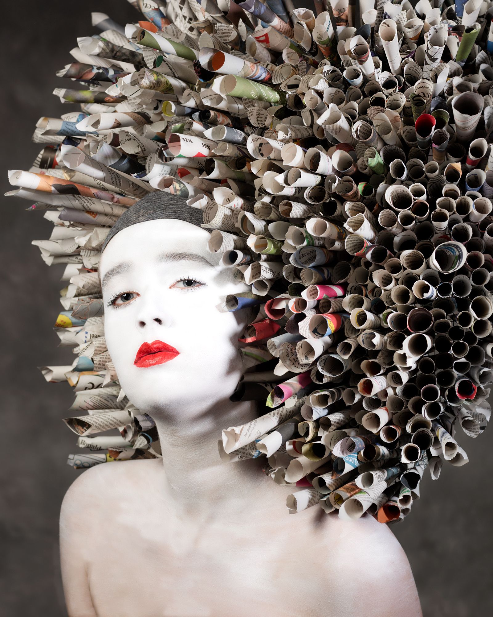 In this photo series we photograph the top 10 most important recyclable materials (Mixed paper, HDPE plastic, Computers parts, Magazines, Newspapers, Aluminium, Cardboard and PET bottles) in an artistic way. Recycling is one of the best ways for us to have a positive impact on the world in which we live. Recycling is important to both the natural environment and us. We must act fast as the amount of waste we create is increasing all the time. We come up with and create the complete image ourselves. For example: we have made 1000 beads of used magazines for the necklace.