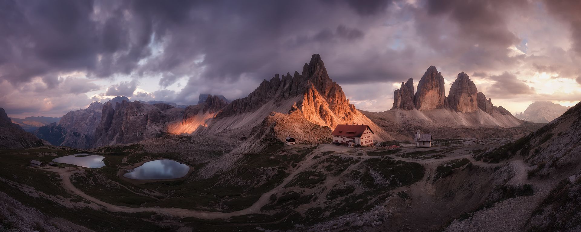 This photo was taken in Tre cime di Lavaredo, Dolomites Alps. At dusk, the sun's rays filter through the clouds, illuminating part of the mountains with golden colors.