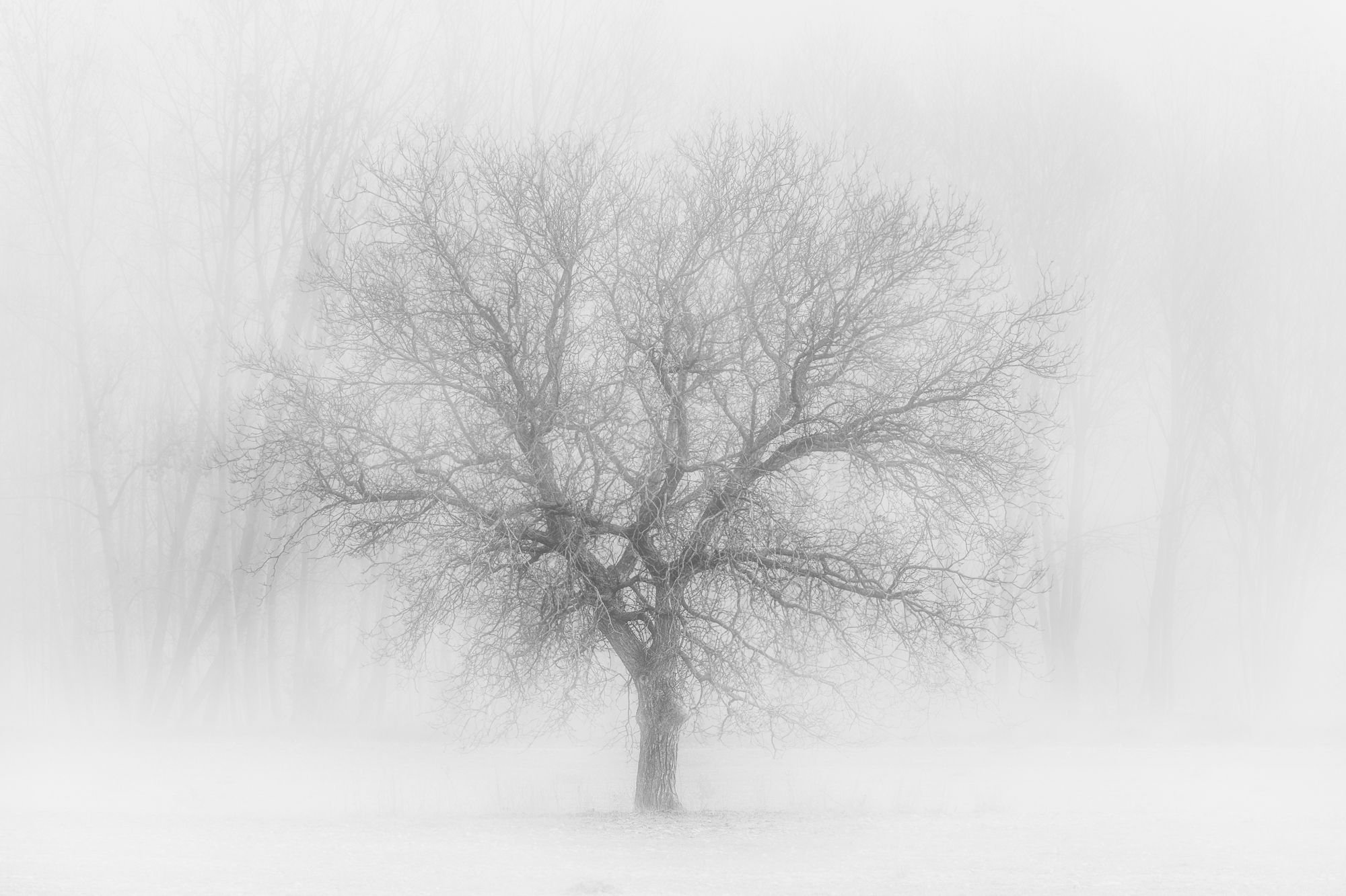 This photograph was taken in November 2018 in the province of Teruel (Spain). The present mist and the focal distance (100mm) allowed me to isolate a tree from its surroundings whilst letting the grove a few meters behind it lightly visible. This way, perspective is achieved and the fabulous atmosphere of that morning in which the photo was taken is enhanced.