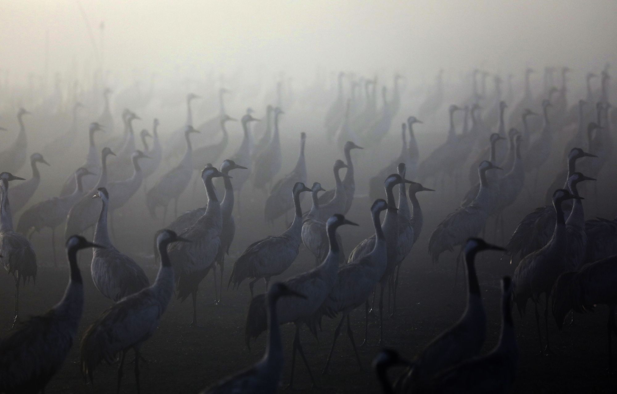 Photographed early in the morning in the Hula Lake in Israel from a special hiding-place wagon. It was a special morning, with heavy fog. About 50,000 cranes were in the area. The photographed cranes moved as a group, but at the moment of the picture, something attracted their attention and a certain symmetry was created at the angle of their heads, which drew my eyes to do the photograph at that moment.