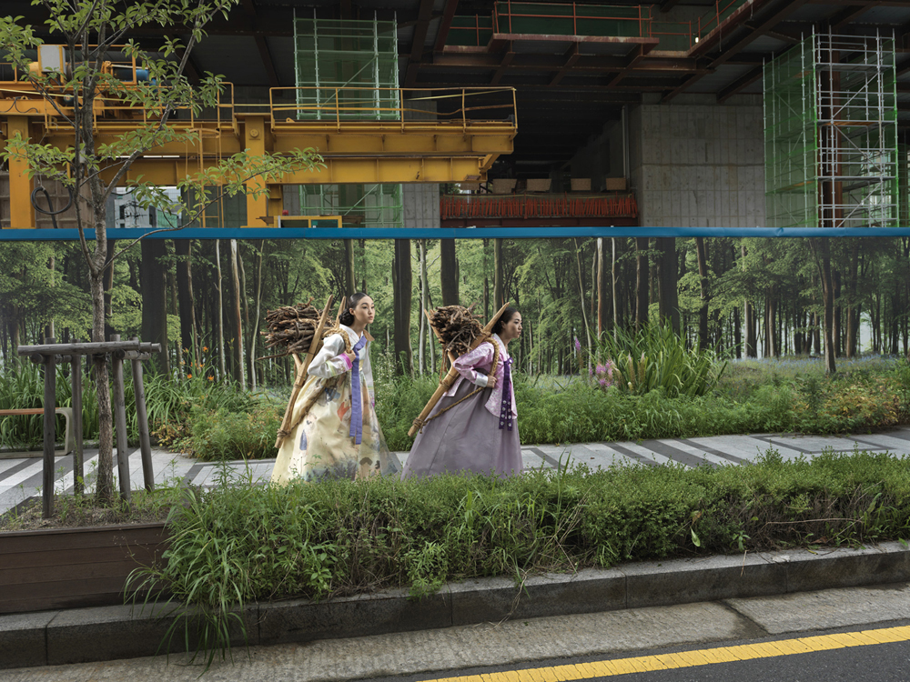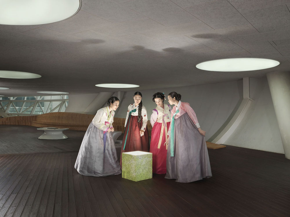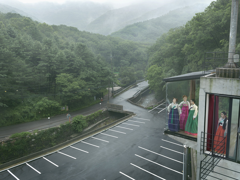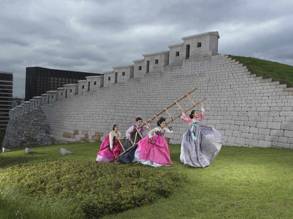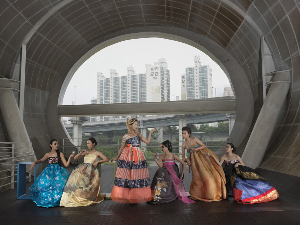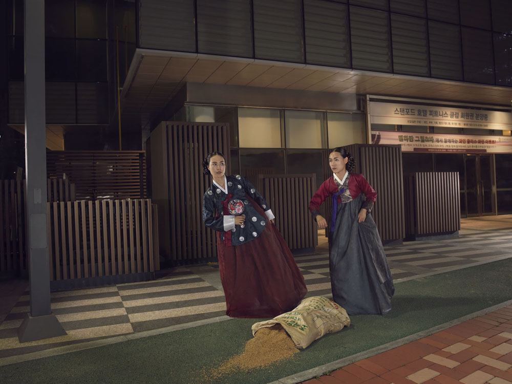 In this series of images, I have posed street-cast young Korean women dressed in the traditional Hanbok against a backdrop of its modern austere capital city, Seoul. The setting illustrate the country’s history, the political tensions between South and North Korea, and its cultural traditions, such as the tea ceremony and gift giving.