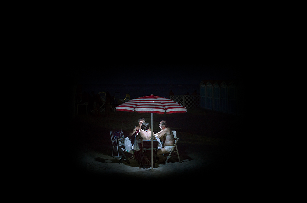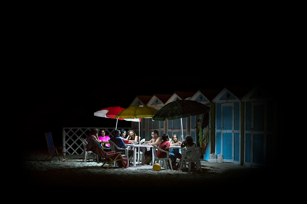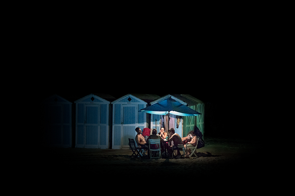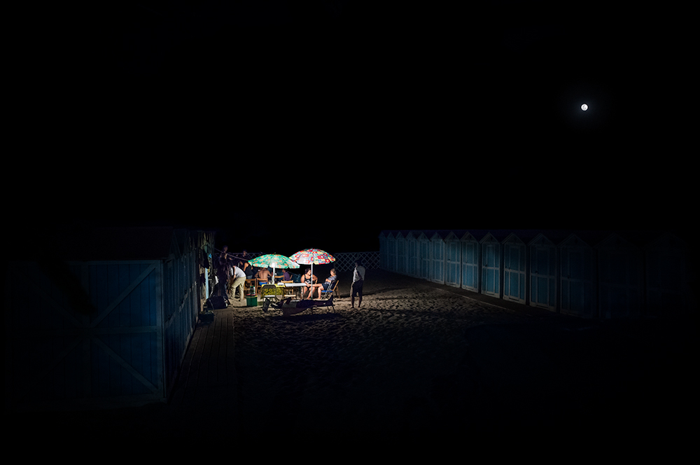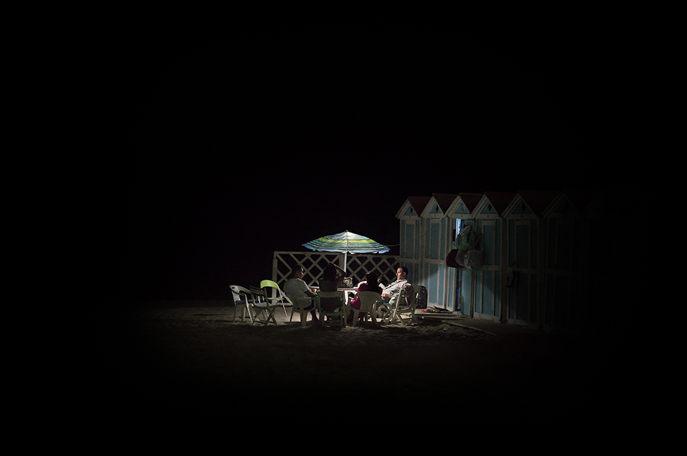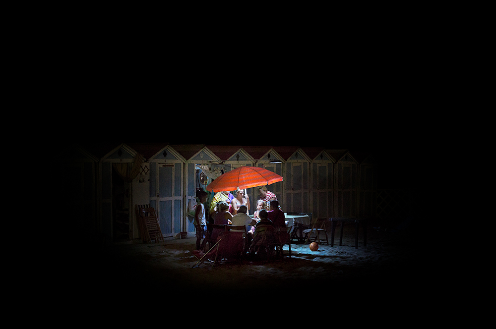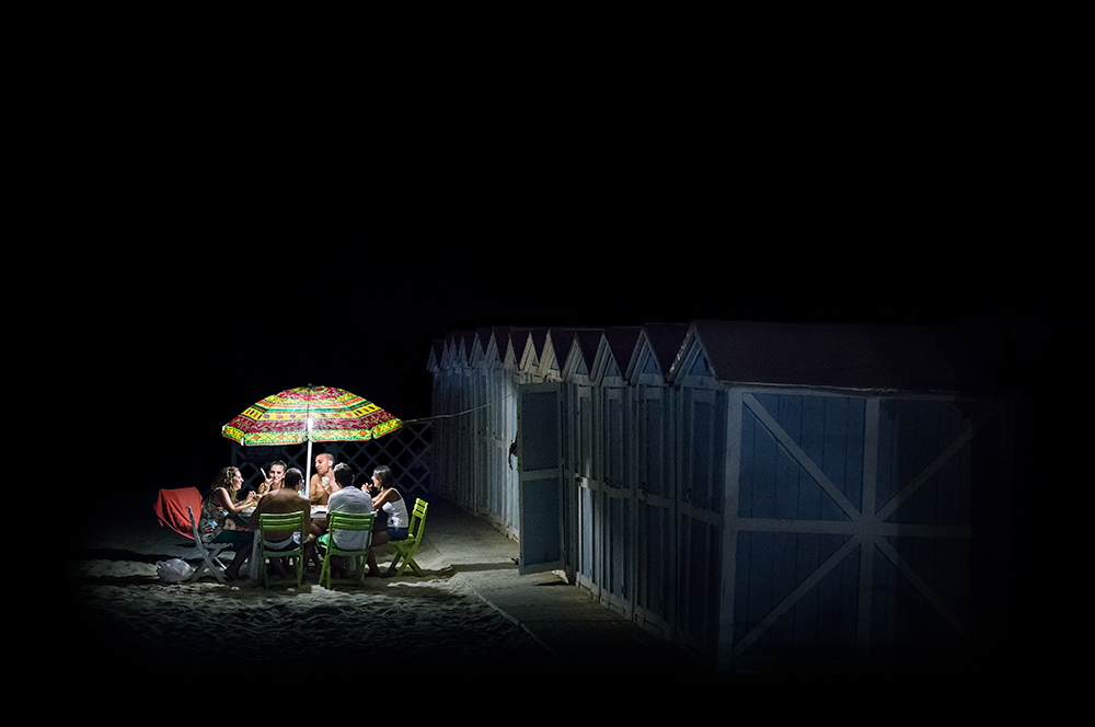 Mondello is a popular beach in Palermo, enclosed between Mount Gallo and Mount Pellegrino and detached from Palermo, thanks to the Favorita Park. Every year in this location, a private company assembles and rents tiny terraced houses, known with the italian words "cabine" or "capanne". Among these, inside the courtyards, the Palermo families meet for dine, play and tell stories, in the darkness broken by small lights hanging from to the umbrellas. The marine smell and the one of pine are strong, as well as the sound of the wind and sea that are the main soundtrack of this outside "summer theater", from seventy years.