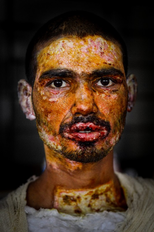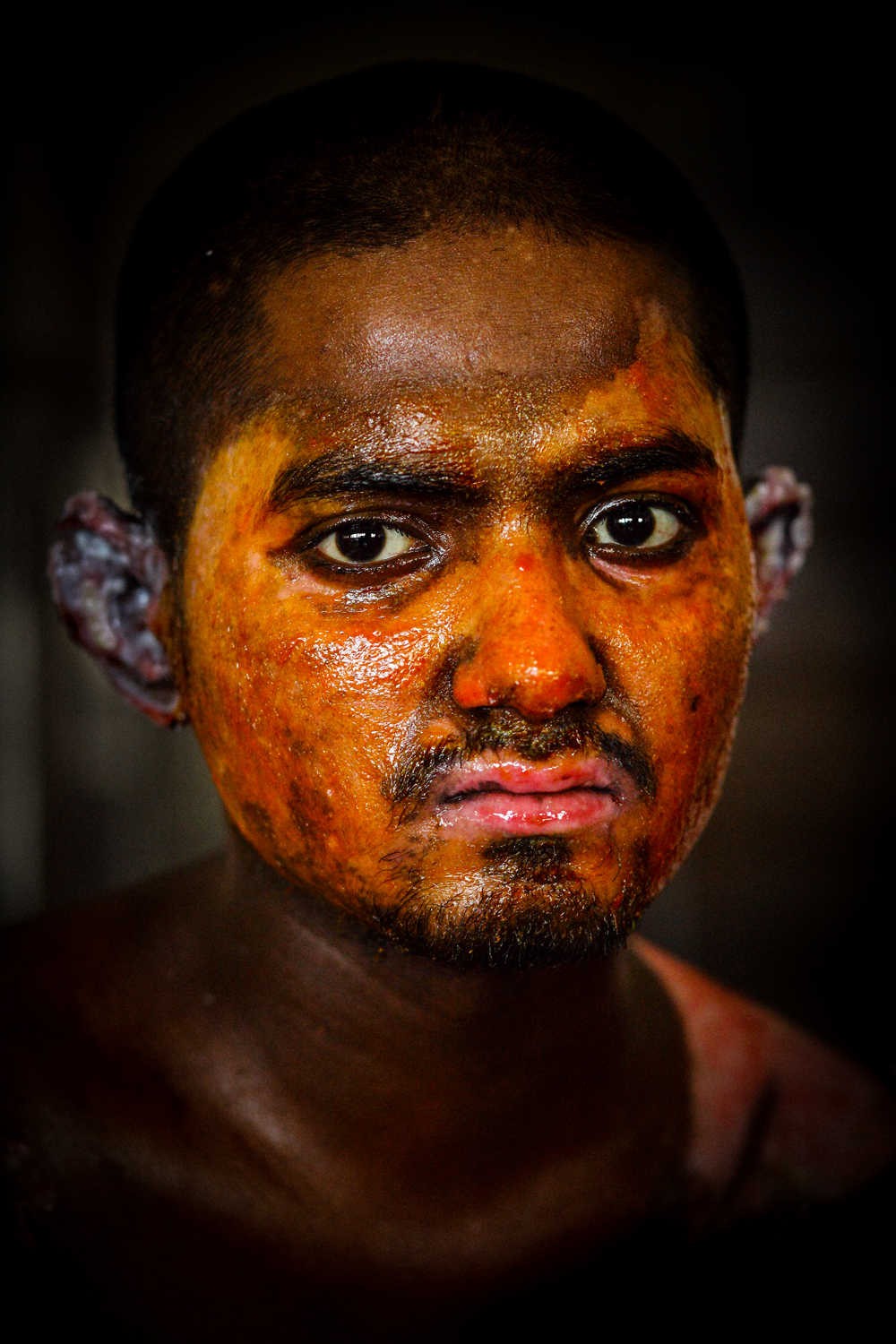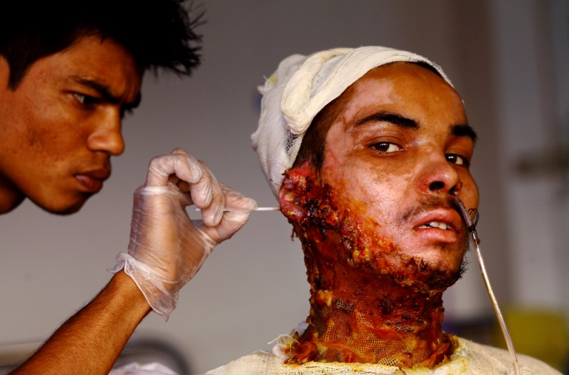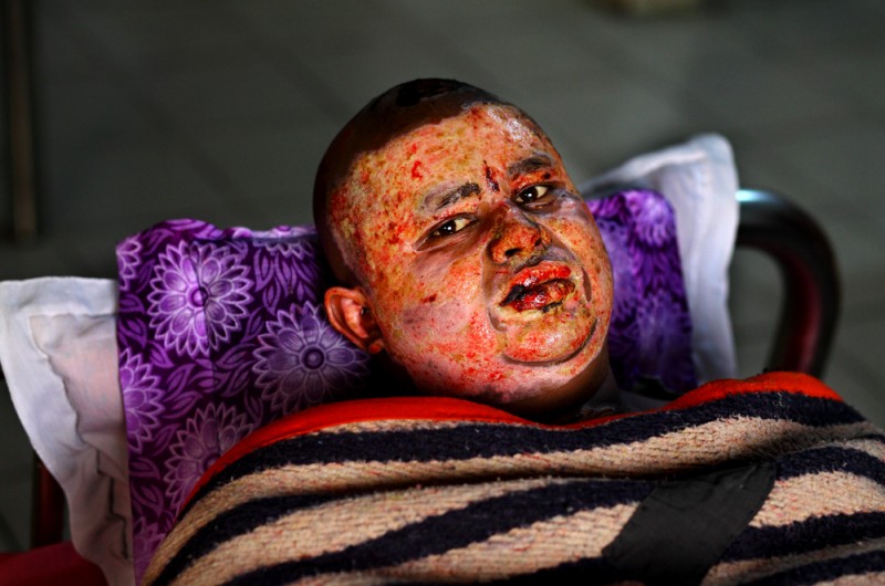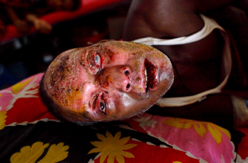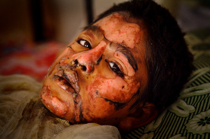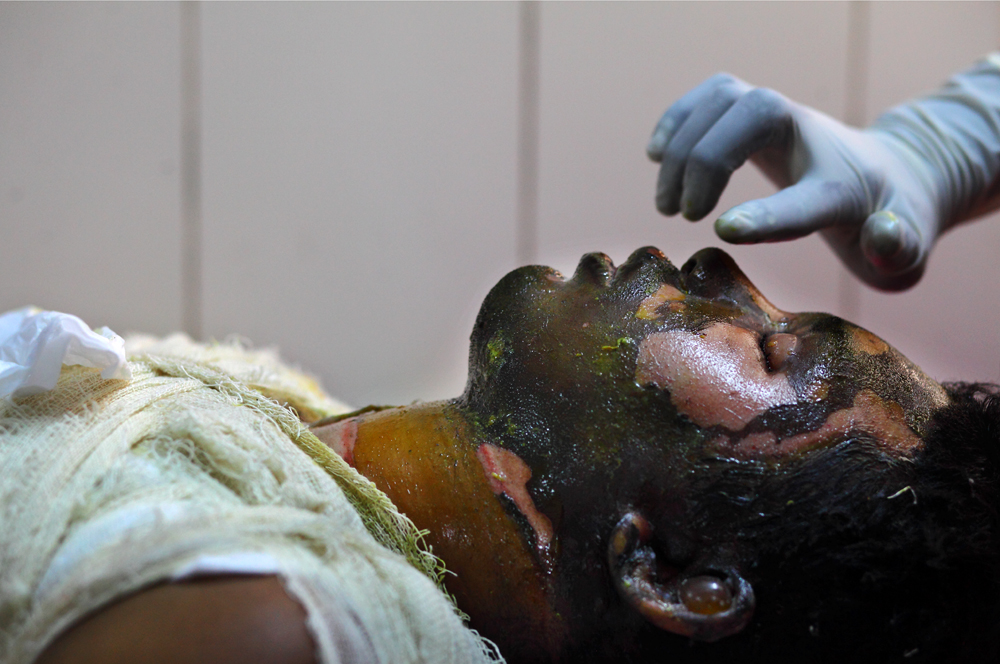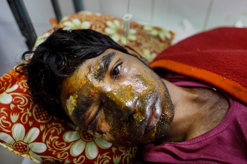 Dhaka Medical College Hospital (DMCH), Burn Unit doctors said that most of the petrol bomb victims were burnt from 20 percent to 40 percent of their bodies. Out of a total of 130 patients who are having medical treatment in DMCH burn unit, 80 are in critical condition. A continuous blockade interspersed with hartals (general strikes) has been going on since the 6th January, 2015. It was called by the 20-Party Alliance demanding the resignation of the Awami League government which came into power through the one-sided election of the 5th January. The protests have become increasingly violent and nearly 1,000 vehicles have been torched or vandalized. The security forces have in turn arrested more than 10,000 opposition supporters while more than a dozen protesters have been shot dead, prompting allegations of a shoot-to-kill strategy. There has been an outbreak of violence and innocent ordinary people are being killed. Petrol bomb attacks on vehicles in Bangladesh are leaving people dead, destroying families and terrorizing normal society. Dhaka, Bangladesh, 2015.