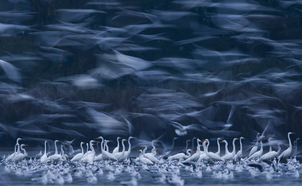 When the ponds are being drained, thousands of birds are gathering around, because of a great occasion to eat fish. I woke up before the sunrise, hid myself in the reeds and waited for birds. After some time the first egrets and gulls started to appear in the distance. It was still very dark so my exposure time was pretty long. Suddenly an eagle appeared on the horizon. All gulls lifted off while the egrets were standing still and motionless.