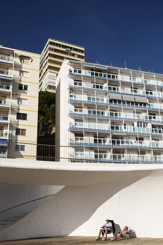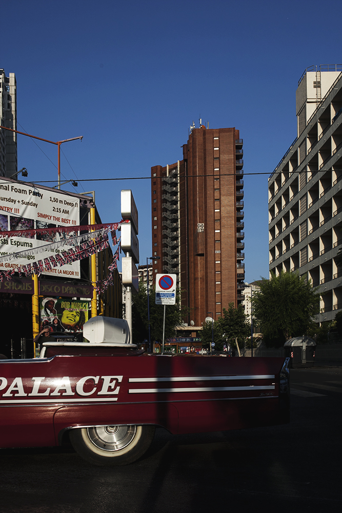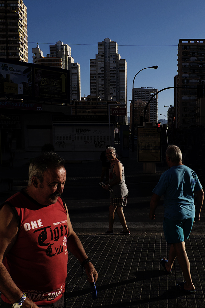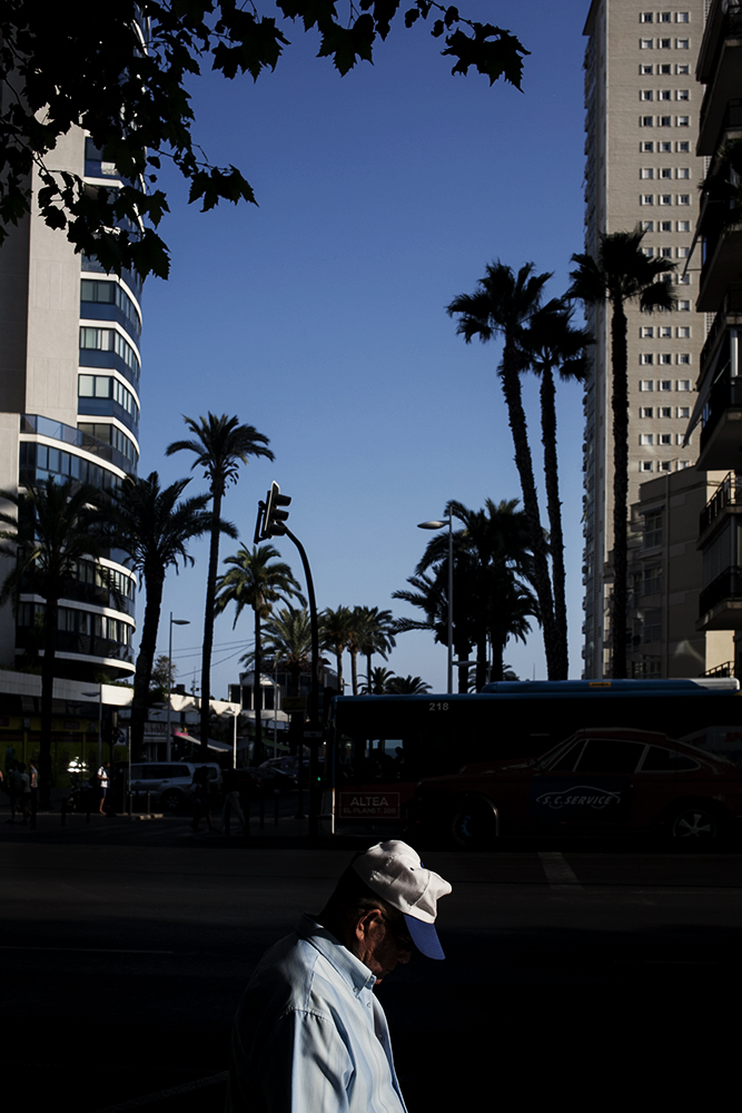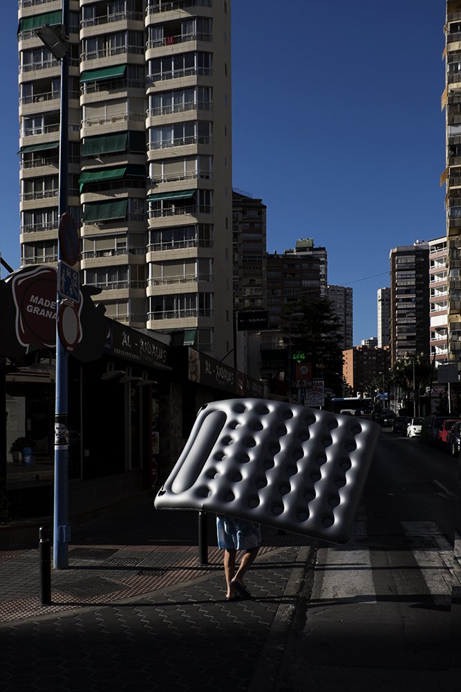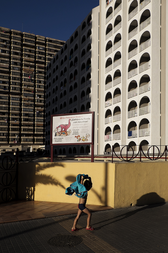 Benidorm is an old fishermen Mediterranean village located to the east of Spain and one of the most amazing and successful experiments in terms of sociology, urbanism and advertising in Spanish history. Two years ago, an experts’ committee proposed Benidorm to be considered as a candidate to be UNESCO World Heritage site. With a local population of 70.000 inhabitants, Benidorm population can be up to 8 million of visitors during the year. Benidorm skyline is the one with more skyscrapers per inhabitant of the world only after Manhattan. This is why is warmly called “Beniyork†or “Mediterranean Manhattanâ€. Its vertical model was created using the principles marked by Le Corbusier as the ones needed for a city to be considered as an ideal one, and Henri Lefebvre considered it as the most habitable city after the II World War. This project focuses on the relationship between Benidorm and their inhabitants and visitors, using vertical photography, on the same way an architect rotated a cigarettes packet to explain how a building occupies the same volume whether it’s built horizontally or vertically, This local legend points out the beginning of the vertical model in Benidorm and also it allows me to rotate my camera, combining the architecture of the city with its streets, leaving aside others elements commonly used to define the city: the beach and the drunkenness tourism, and focusing my vision into the daily life of this strange city over which everybody in Spain has an opinion, even if they have never been there before.