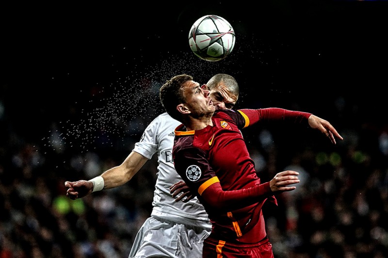 UEFA Champions League 2015/2016 08/03/2016 Estadio Santiago Bernabéu, Madrid, Spain Round of 16 - Second Leg Real Madrid CF v AS Roma 2-0 (Aggregate 4-0) Edin Džeko of AS Roma (right) and Pepe of Real Madrid CF (left) captured in a heading duel during the UEFA Champions League 2015/16 round of 16 second leg match between Real Madrid CF and AS Roma at the Estadio Santiago Bernabéu in Madrid, Spain.