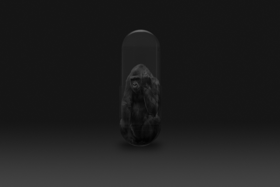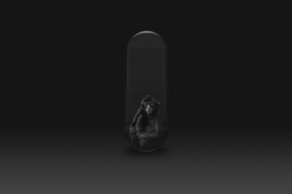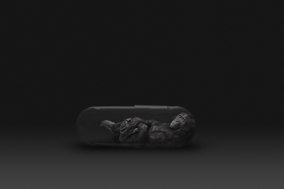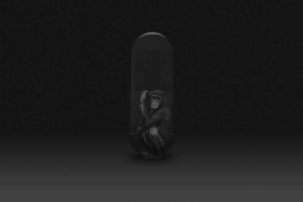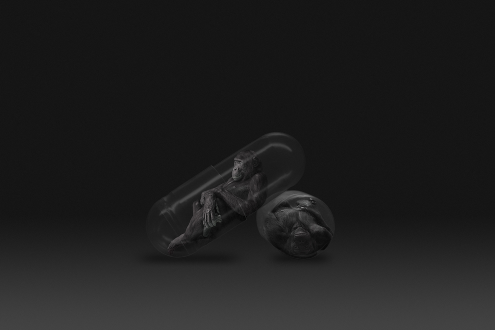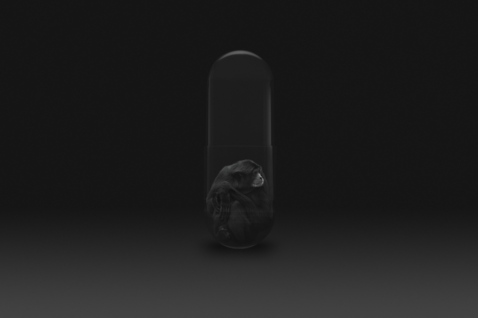 In a world where the human race seeks dominion over all but it is often a victim of its own shares, such as environmental disasters, I thought of this conceptual work where primates, who share with us up to 99% of the DNA, are inserted into safety capsules to be able to someday regenerate a primitive life in another place, after our extinction. The photographs on the monkeys were taken in European zoos and the capsules are photos taken in the studio.