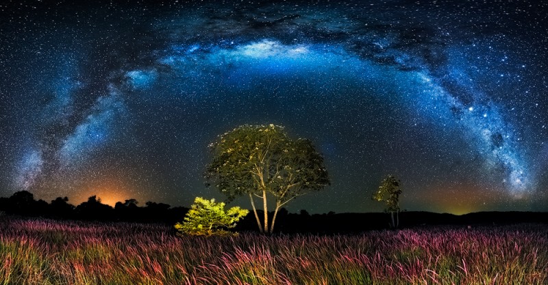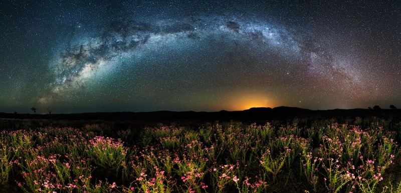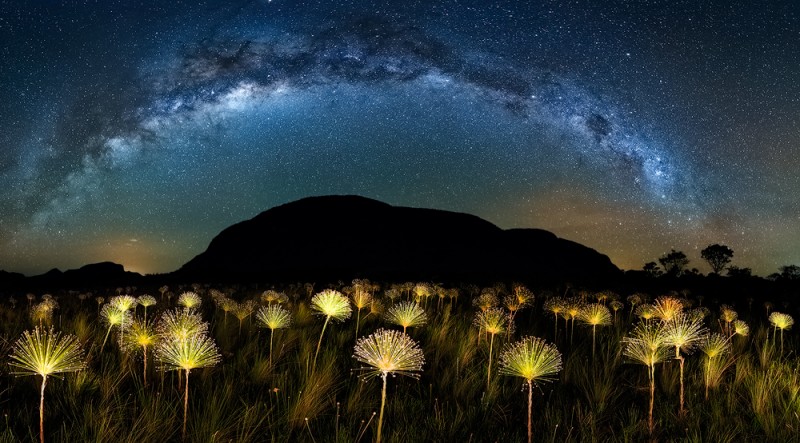 Cerrado is the Brazilian Savannah and it is being destroyed to plant soy and livestock activities. There remain just over 10% of its native vegetation, located in national parks and protected reserves. This series uses techniques of panoramic photography and paintlight along with astrophotography to record the Milky Way and the wild flowers in the foreground were illuminated by a flashlight.