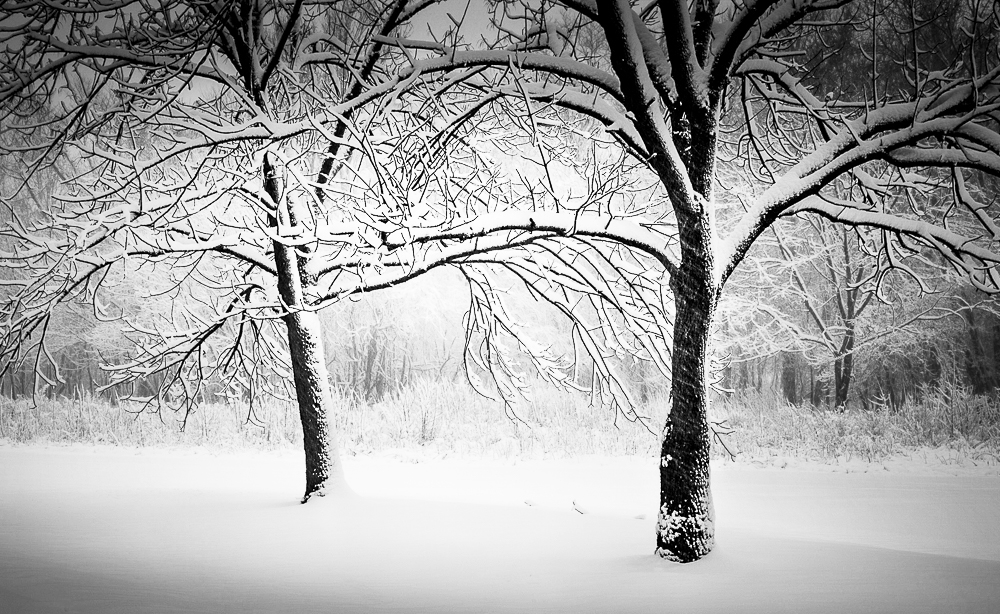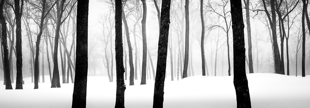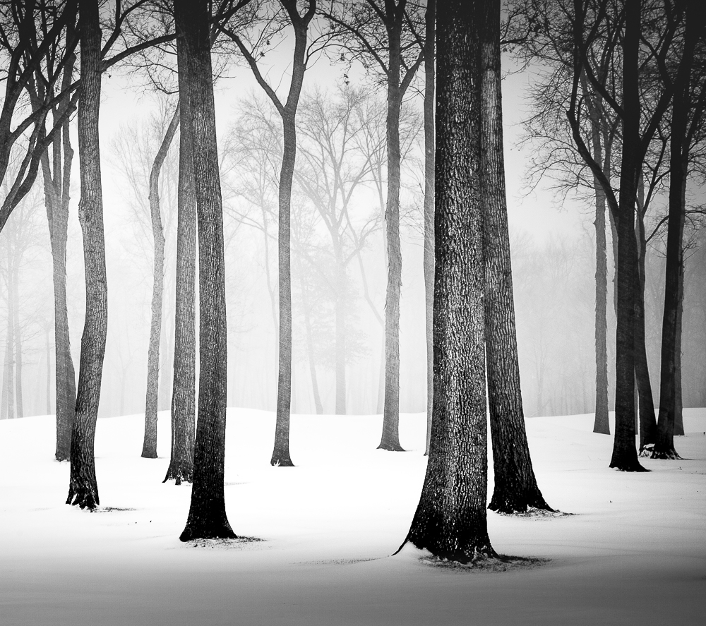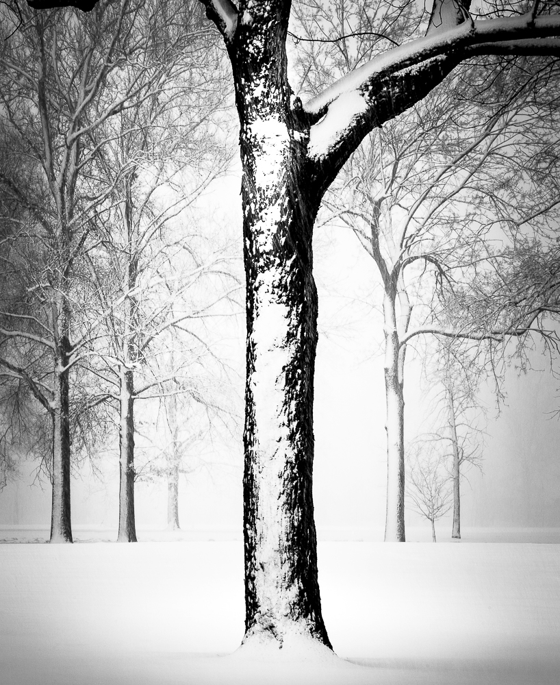 Trees are the life force of the planet, standing tall and converting Co2 to life giving oxygen. During the harshest weather they continue to withstand the elements. I find trees in winter visually unique, as they stand out in their dark hibernation against the bright and freezing snow. I love the soft light and quality of luminousness that can be achieved in B&W during a snow storm.