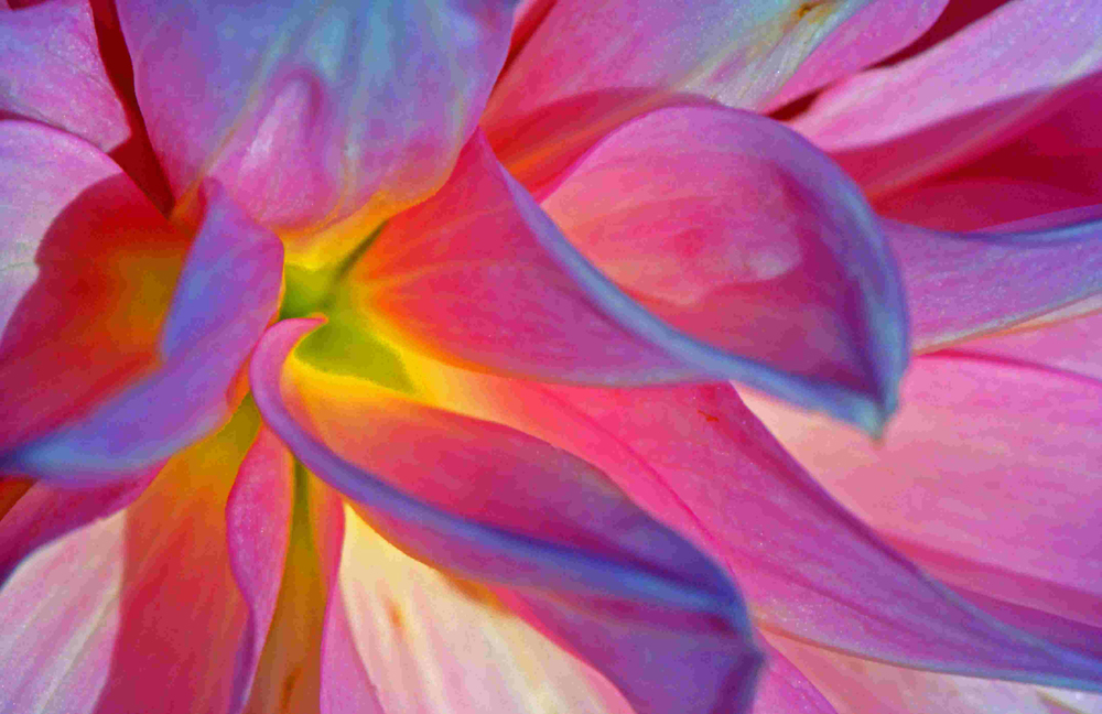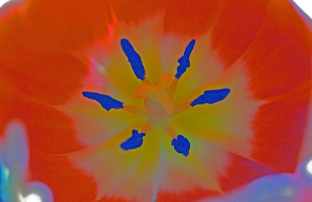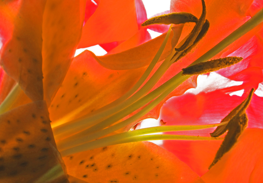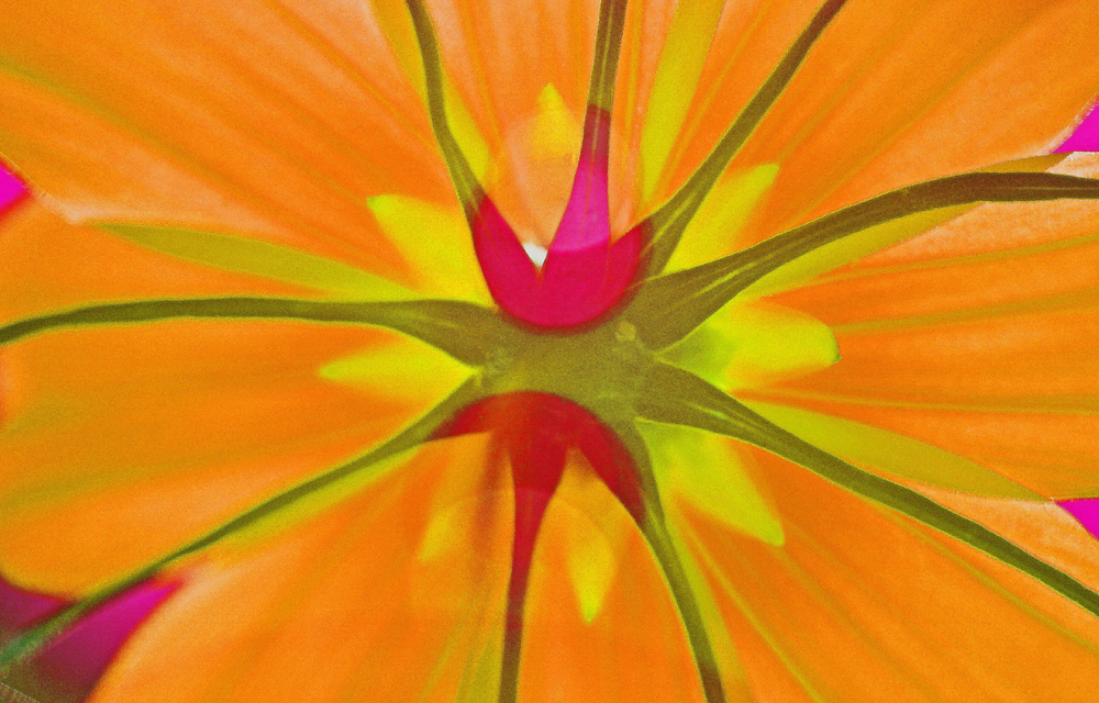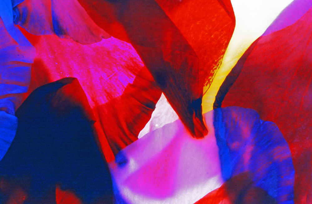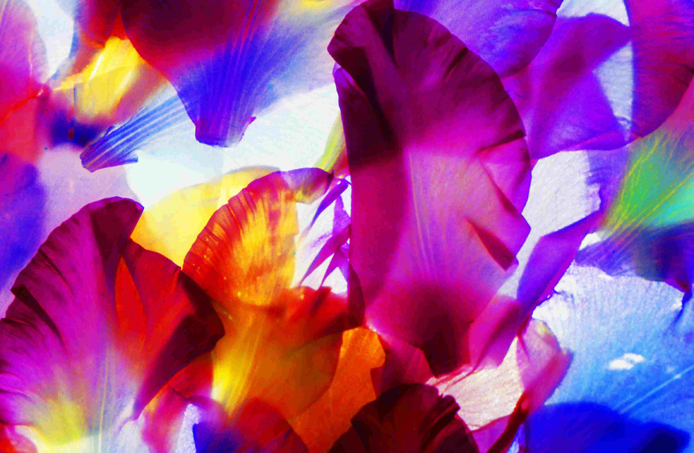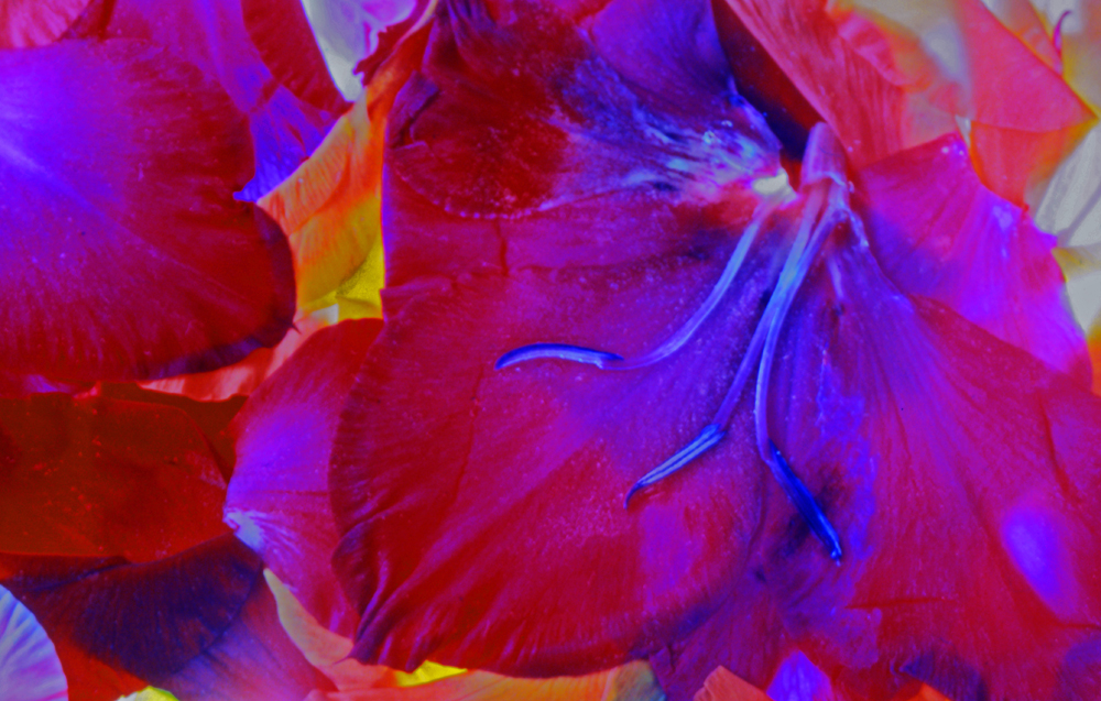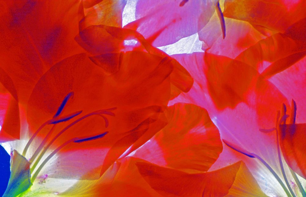 Garden flowers (gladiolas,cosmos, calla lilies, cactus)pressed between panes of glass and photographed at sunset.