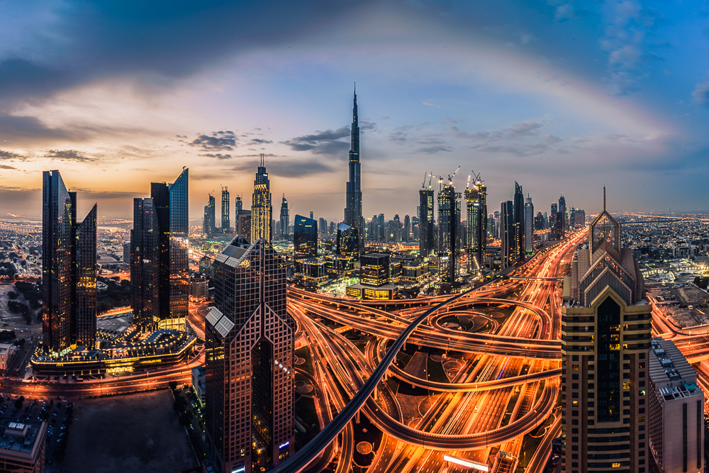The view over Dubai city center is just breathtaking. Especially at sunrise when the city lights and the ambient blue light blend in an amazing mix. The lights of the city are on, so is the city majestic highway system. When I arrived to the rooftop I remained speechless. The view was just amazing. This was my first visit to Dubai and I've been very lucky with the weather conditions. The sky, typically clear, was cloudy and the sunrise so colorful. I coulnd't desire a better welcoming.