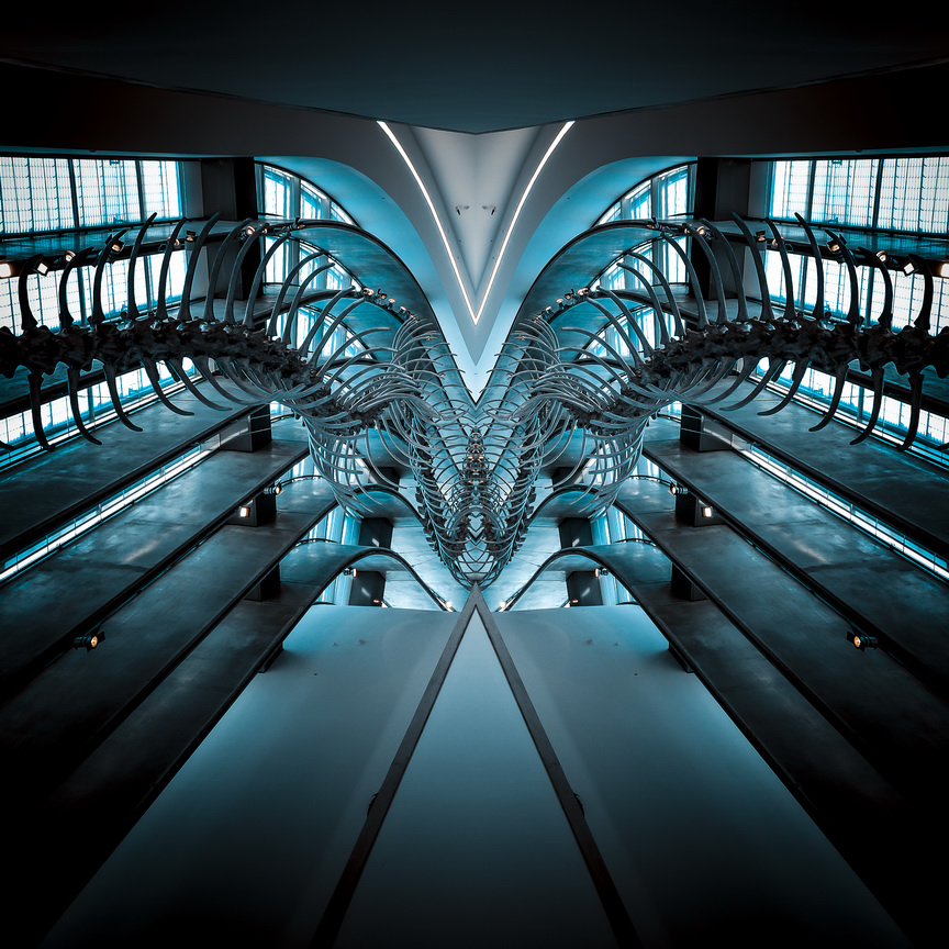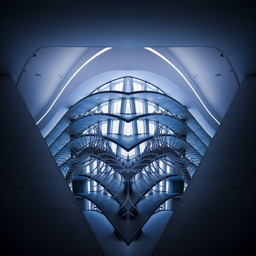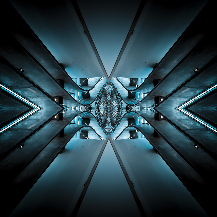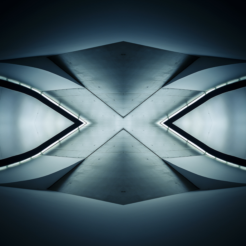 The Alien Structures photographs are part of a larger series entitled Impossible Architectures, started a few years ago, which is a long-term open-ended project structured on three different tiers. The sequence that Im presenting in this entry puts under a hyper-realist intimate scrutiny several architectural images. The mirroring applied to the original images accentuates the inherent dual nature of the subject and creates a new potential space of self-integration, thus giving birth to new impossible architectural disclosures. The reflected image is, in fact, a new-born architectural space that enriches the world of the imaginary, highlighting the infinite possibilities to dream on. The world of dreams, the most intimate of spaces, becomes a never-ending speculation - perhaps a little Freudian, but nonetheless nourishing. It is not a haze, but a daydream, within which different scenarios may be played-out by the viewers imagination.