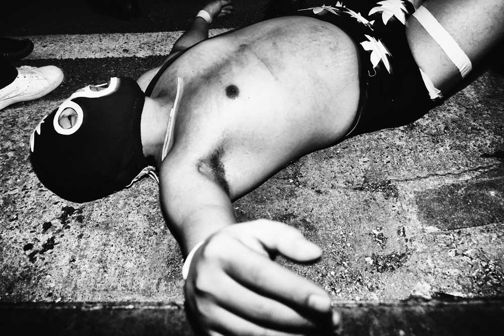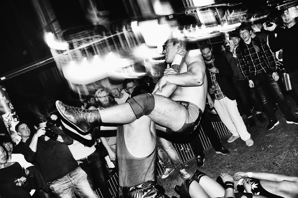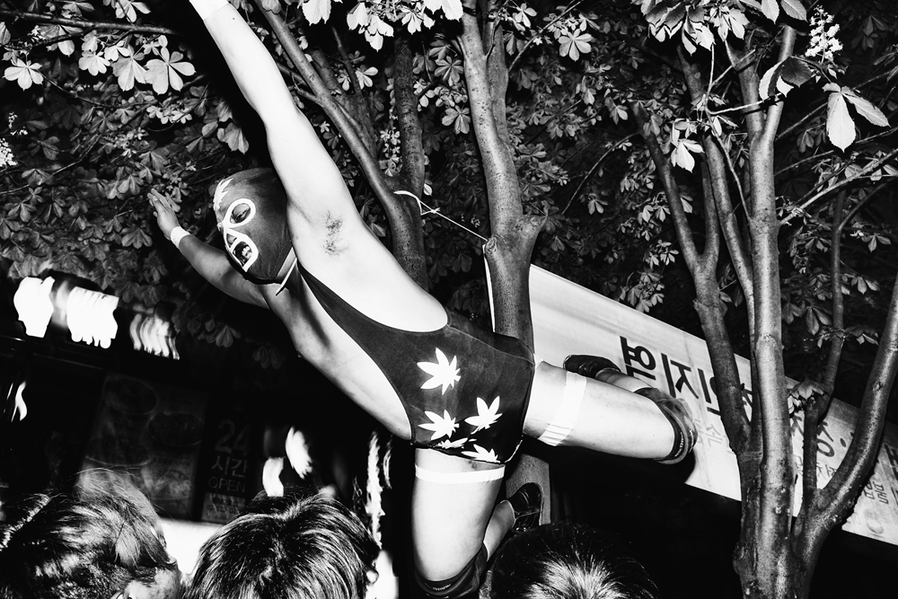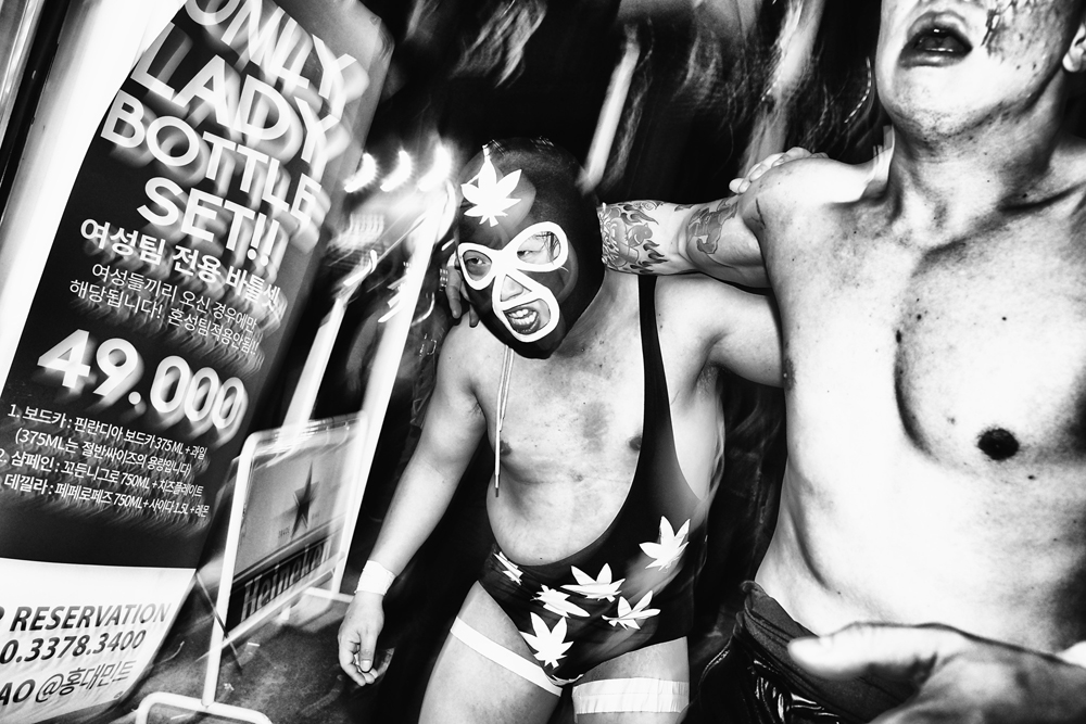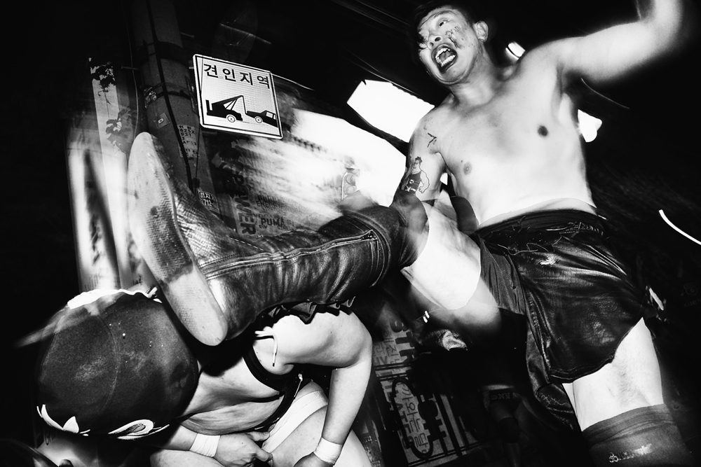 Pro Wrestling Fit is a South Korean wrestling group that fights anywhere, be it in a gym, club, or even a busy city street. One of South Korea’s only wrestling organizations, they hold monthly matches called Supernovas at their Dream Storage gym in Goyang, located just north of Seoul. To promote themselves, they fight at unconventional places in backyard wrestling style. This fight event took place during an underground rock show dubbed, “an unholy unity of music and wrestling†at Club Freebird in Hongdae (a district of Seoul known for their urban arts and indie music culture). Between the opening act and the headlining band, the PWF wrestlers were introduced and immediately started sparring. To the surprise of the audience, they quickly took their fight out of the club and into the city streets. Enticed by the offbeat, the audience couldn’t help but chase after and marvel at the ensuing gorilla performance.