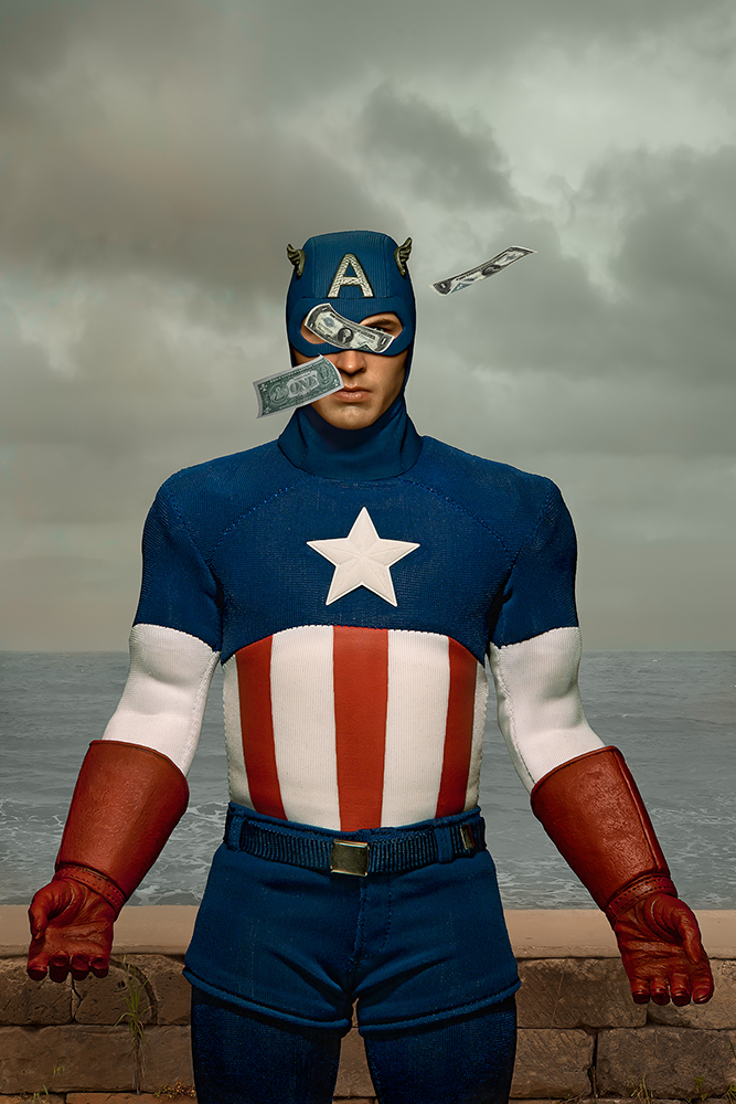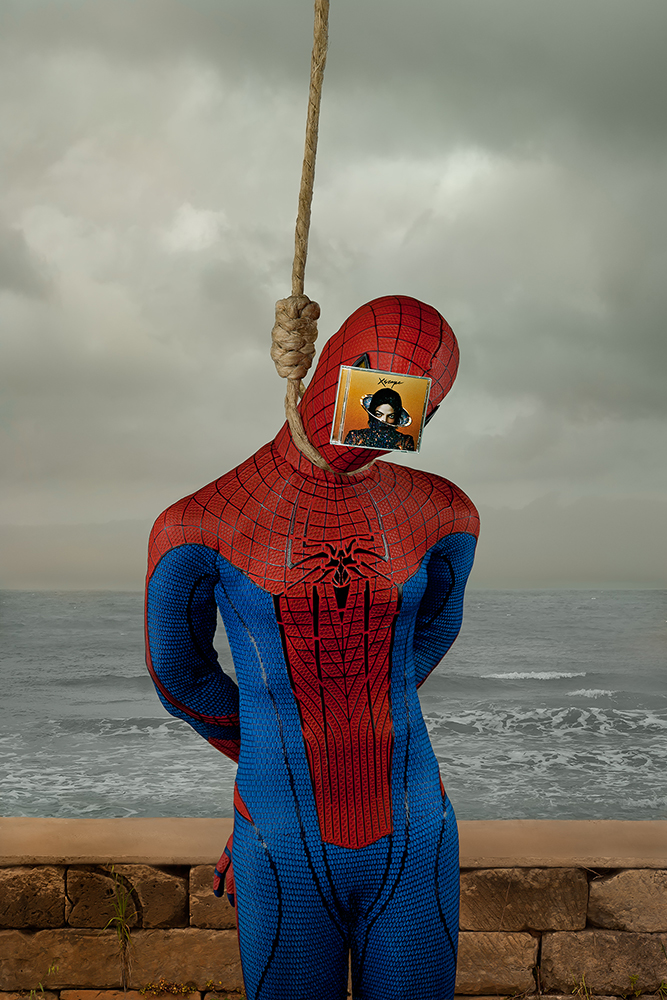 Clearly inspired by the famous painting "Le fils de l'homme" by Rene Magritte, this series of images is to present a brief ironic overview about the "quality" of modern Western society. As the original work, the project hides a criticism which is partly made explicit by the choice of the title given to single images. The figures, taken from the world of comics and the film industry, offer a hint for meditating on the ideologies, political choices, tendencies of thought and mechanisms typical of our society: 1. The homogenisation of thinking with the consequent difficulty in recognizing what is beautiful in what is different; 2. The lust for money, synonymous of consumerism and self-achievement; 3. The choice of being a part of a corrupt system which would overwhelm them,otherwise; 4. The connotation of a male society, which makes more and more often use of sexual images for commercial purposes; 5. The tragic consequences to which the refusal of such a system leads, for those who decide to "get out of the box"; 6. The madness inside acceptance, as well as the worship of a reality suitable for a few giants who walk trampling on the heads of the crowd forced to contend the cold shadowy areas.