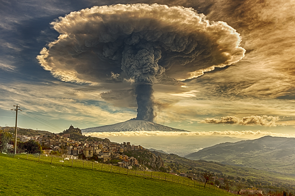 Etna Explosion Spectacular eruption of Etna volcano with a cloud of ash and lapilli like an atomic explosion. The comparison with the small village of Cesaro need to understand the scale of the phenomenon, and juxtaposes the roar of the eruptive power with the quiet of the small center and flocks graze.