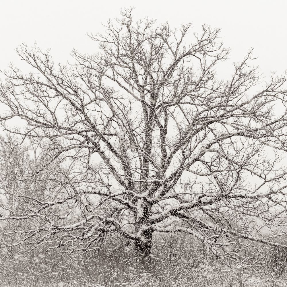A majestic oak tree braves the winter wind during a blizzard.