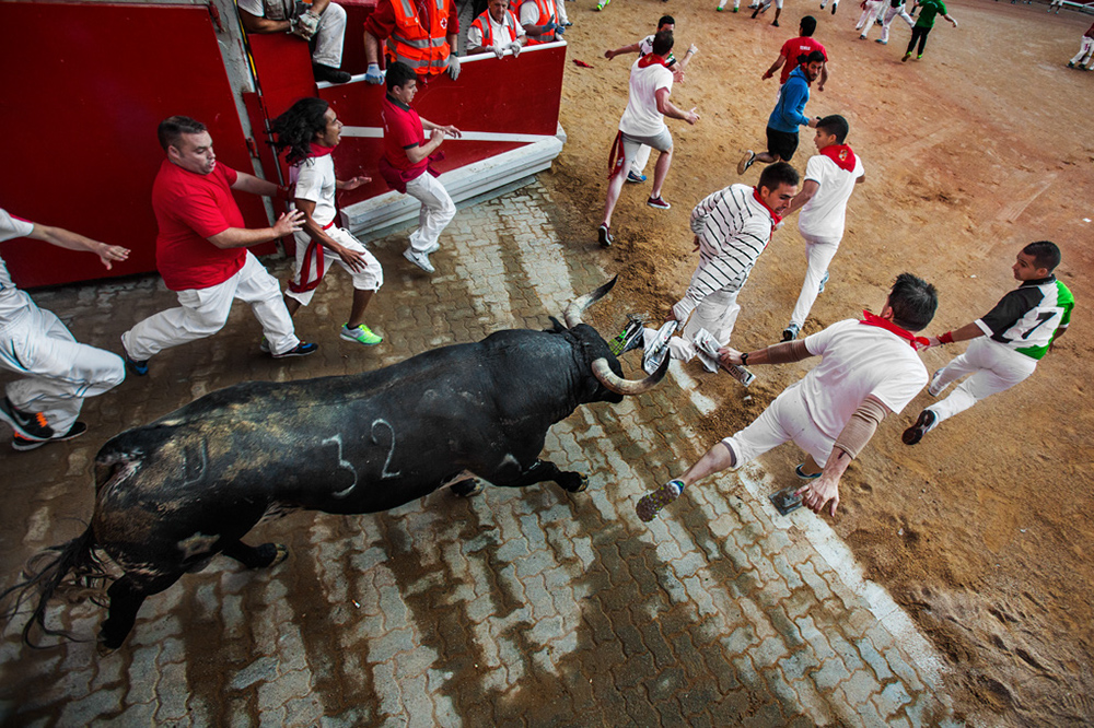 The festival of San FermÃn is a week-long, historically rooted celebration held annually in the city of Pamplona (in Navarre, Spain). The celebrations start at noon on the sixth of July, when the opening of the party is marked by setting off the pyrotechnic chupinazo,[a] and continue until midnight, on the fourteenth of July, with the singing of the Pobre de MÃ. While its most famous event is the encierro, or the running of the bulls, which happens at 8:00 AM from the 7th of July to the 14th July, the festival involves many other traditional and folkloric events.