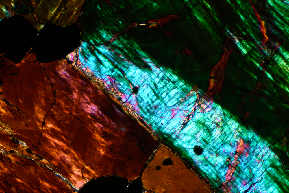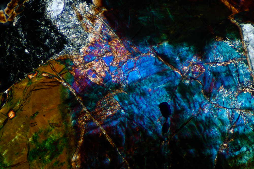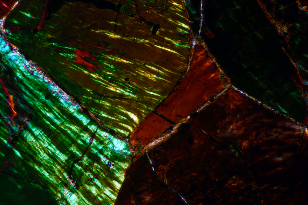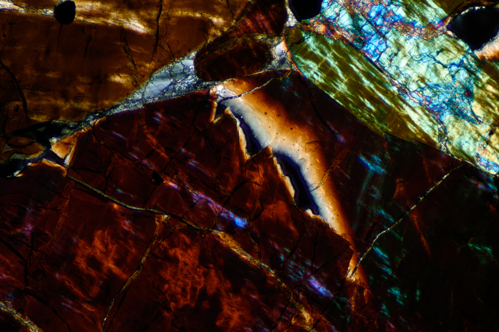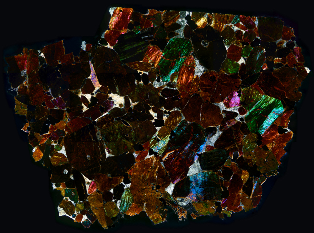 Northwest Africa 2737 Meteorite Thin Section viewed in cross polarized light. Camera: Nikon D810. Focus stacking with Zerene Stacker.