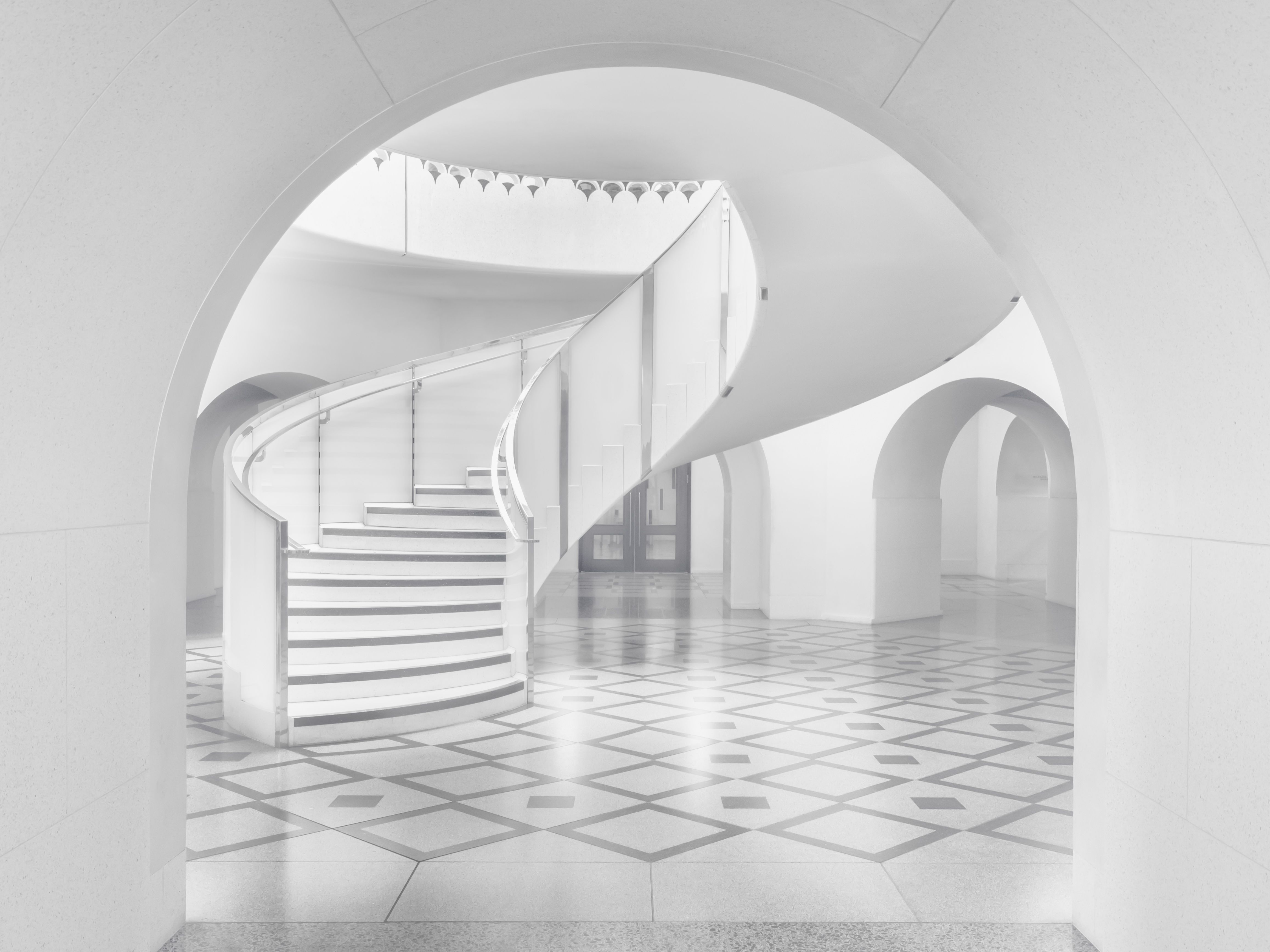 A high key version of the amazing curves and arches of the Tate Modern, framed and juxtaposed against the geometric flooring.