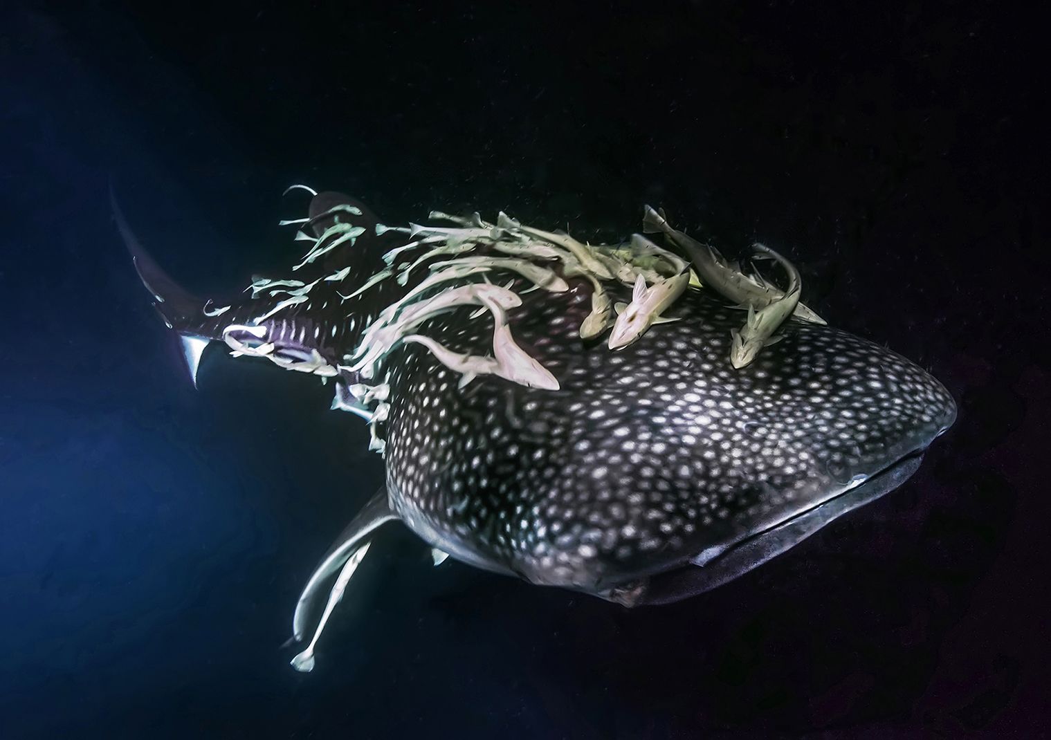 A whale shark surrounded by many repulses, it runs in the immensity of the sea