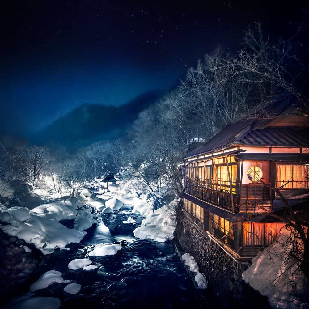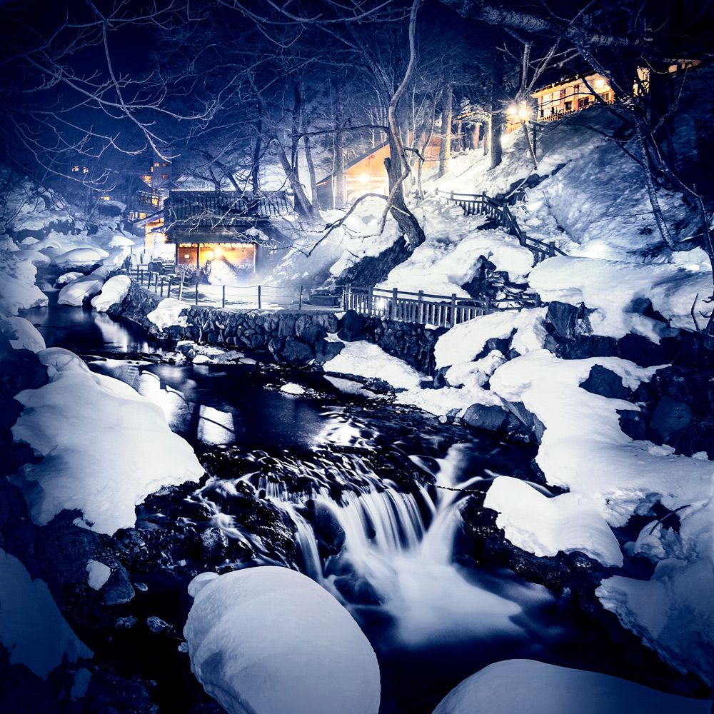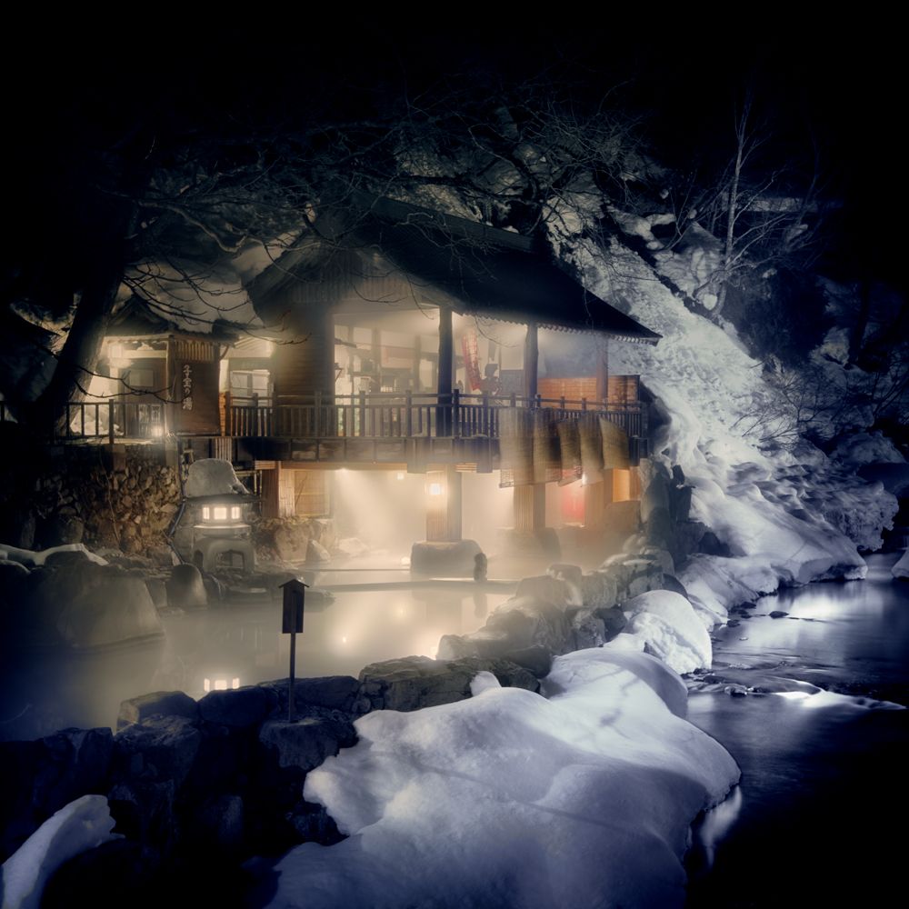 Winter Magic of Hot Springs Water, baths, and showers in our mundane fast-paced lives no longer carry any meaning except practical. Japanese Onsens return us to the times when water was used for ablution and the bath had symbolic meaning. The tranquil-naked-soaking ritual in Japan’s hot springs brings us closer to nature, helps us meditate and connect to our inner selves. Bathing at night in the winter elevates the experience to a higher level. To not be intrusive in a bather’s privacy, the photographs were taken after midnight, when almost all pools were empty.