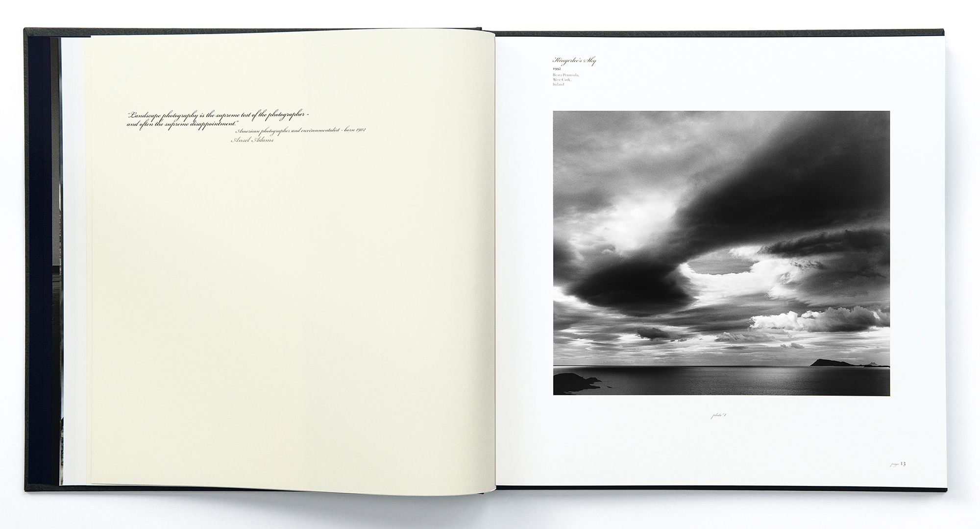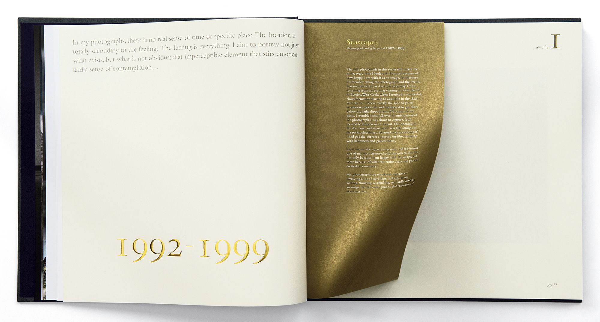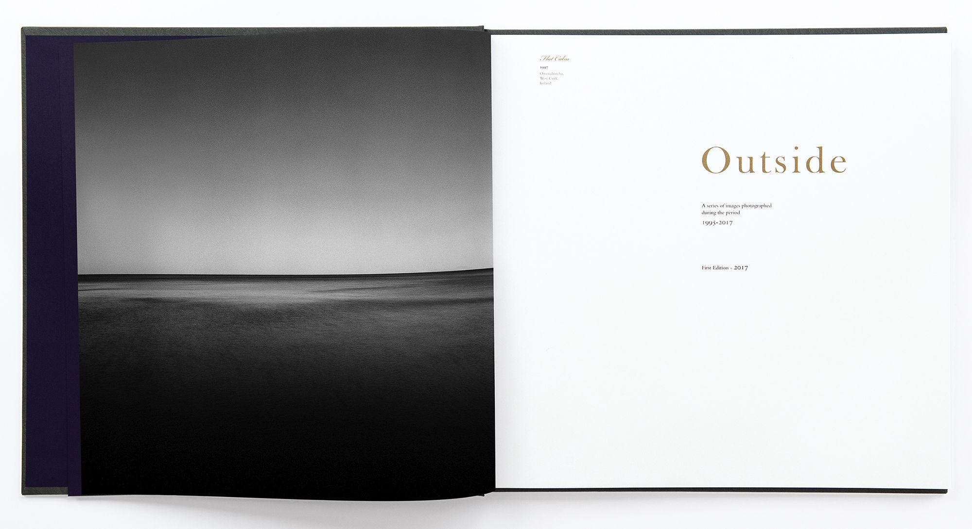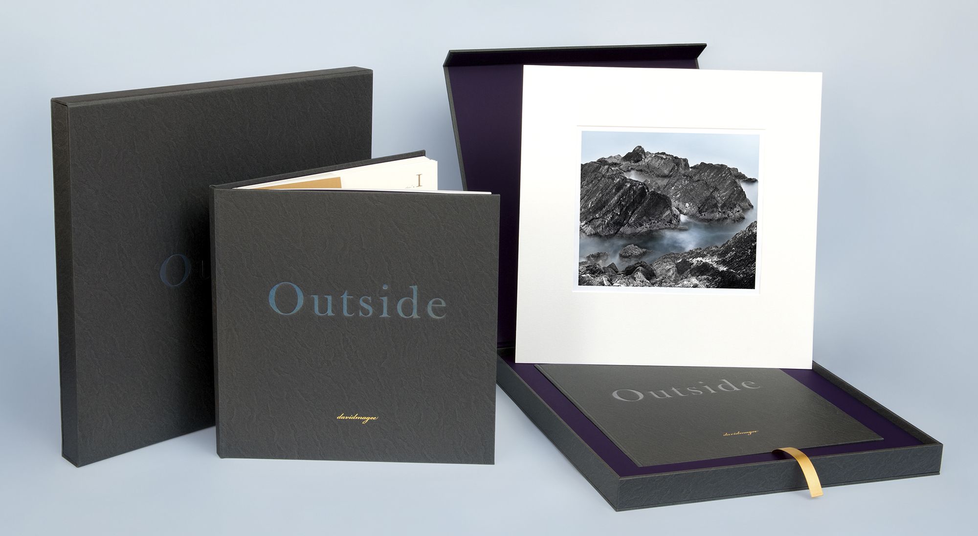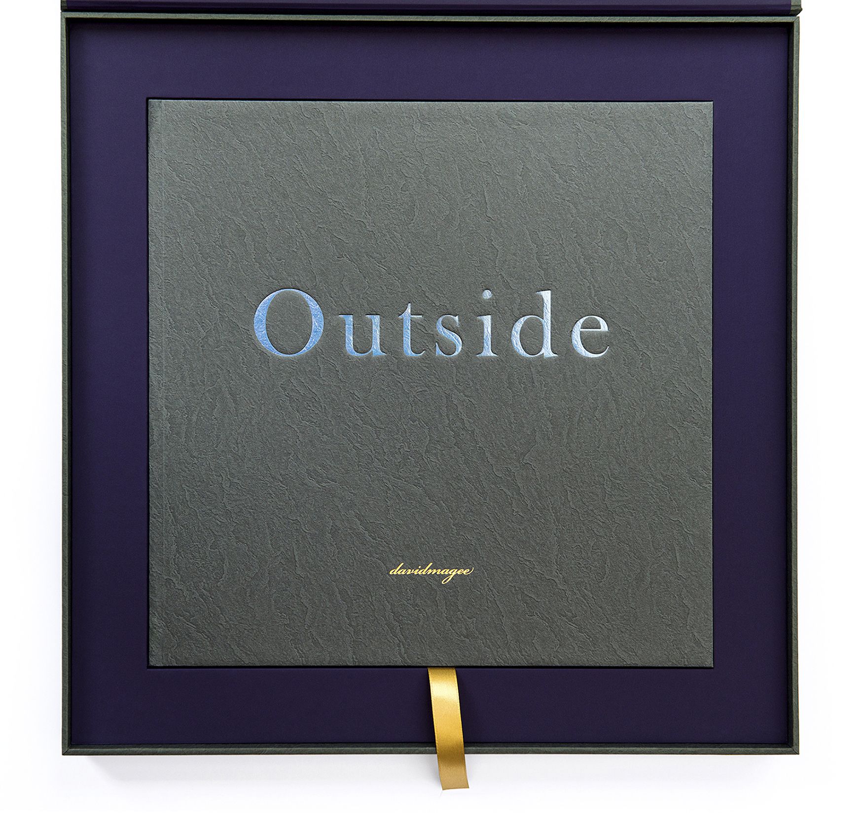 Outside. A twenty five year retrospective by fine-art landscape photographer David Magee. This book was to present an overview of his approach to landscape photography. One that mirrored his aesthetic of “feeling” being the most important emotion to be taken from his photographs. Outside, is designed as a gallery in itself, with forty-seven plates, accompanied by intimate anecdotes by the artist. Square in format, case bound in Japanese paper that resembles rock, featuring gold and translucent foiling, presented in a clam shell box. Each book numbered and signed by the artist.