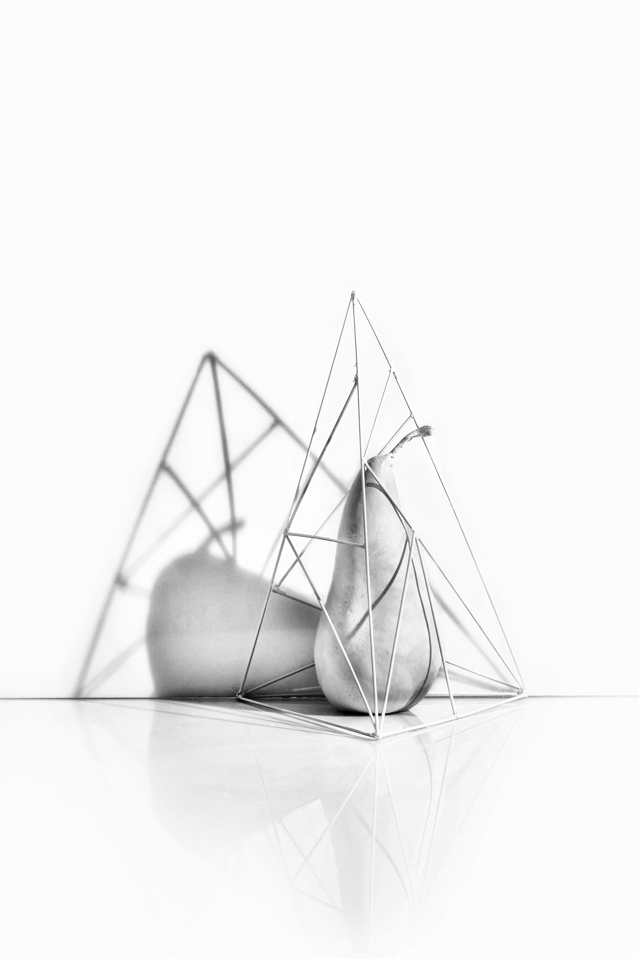proposes a game of shadows based on geometric structures created with rice paste and four fruits and vegetables: custard apple, pear, artichoke and romanescu. All painted in white to obtain a homogeneous result