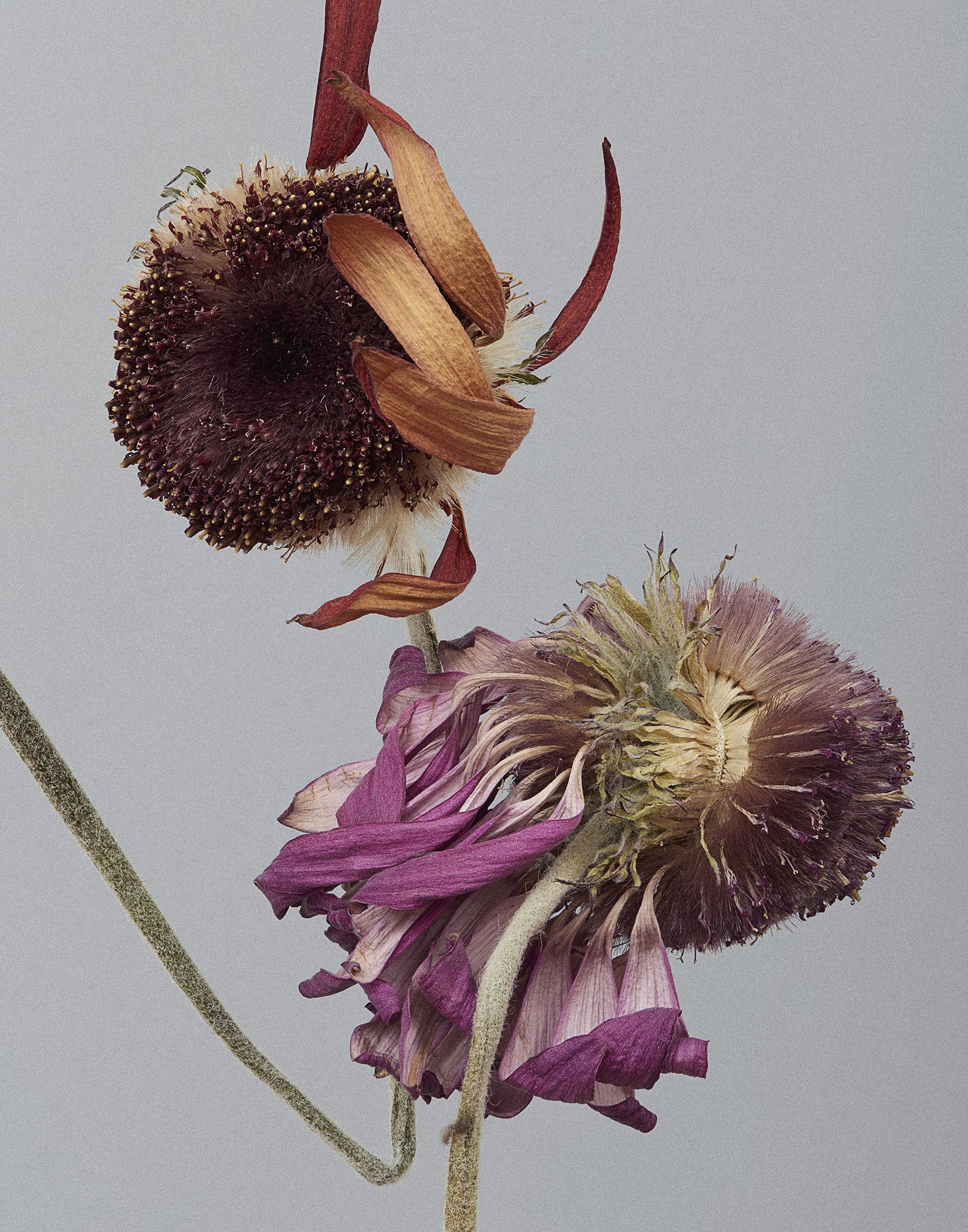 Time changes nature in not only its physical shape but also its character. As time goes by, a flowers body and color are transformed in a more abstract way.This project finds both the reality; the superficial elements from the camera frame and the emotional aspect; a beauty of flower. These photographs reflect my gaze as an observer; thinking about not a plant but the texture, shape, color and composition as a reconstructed objects.