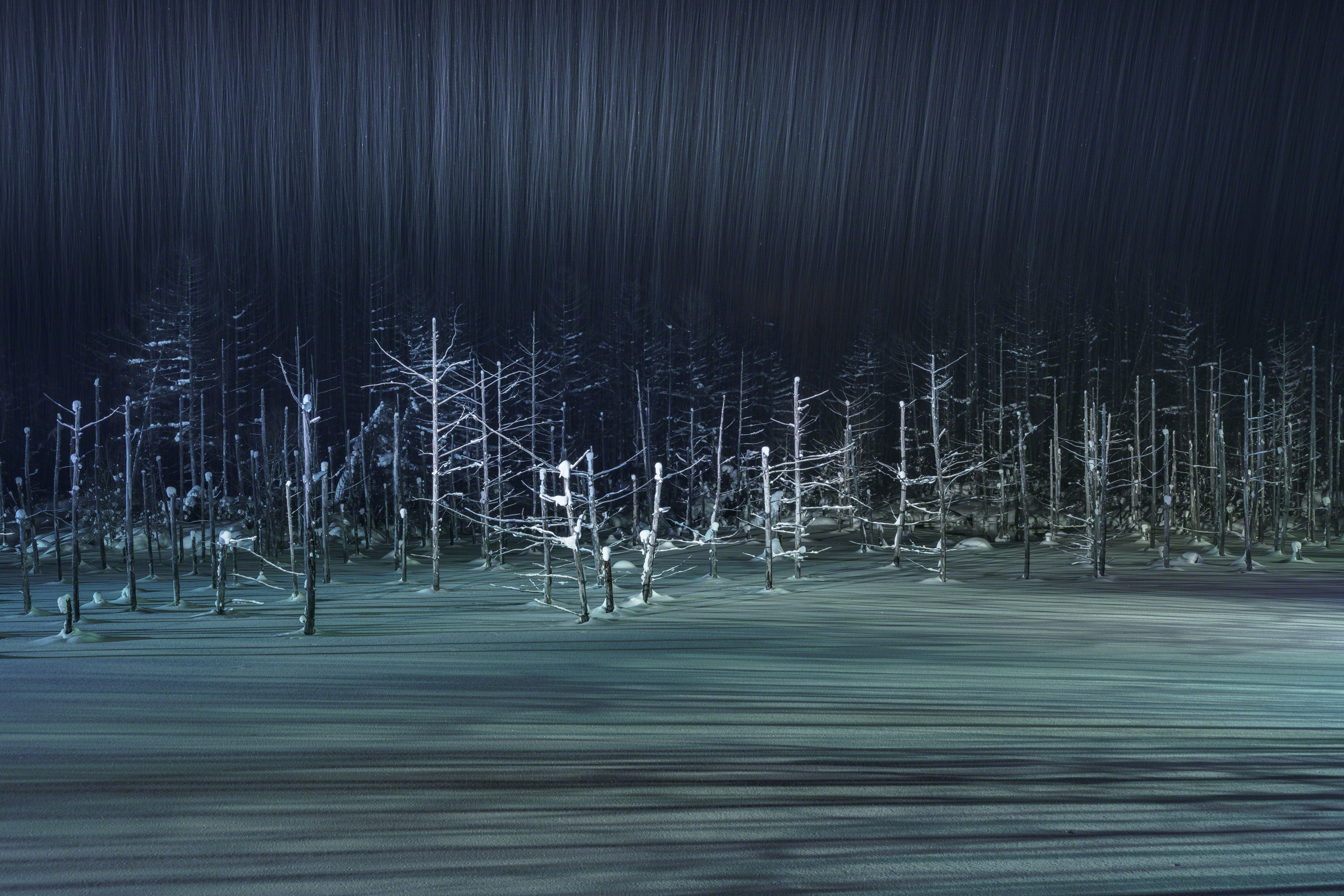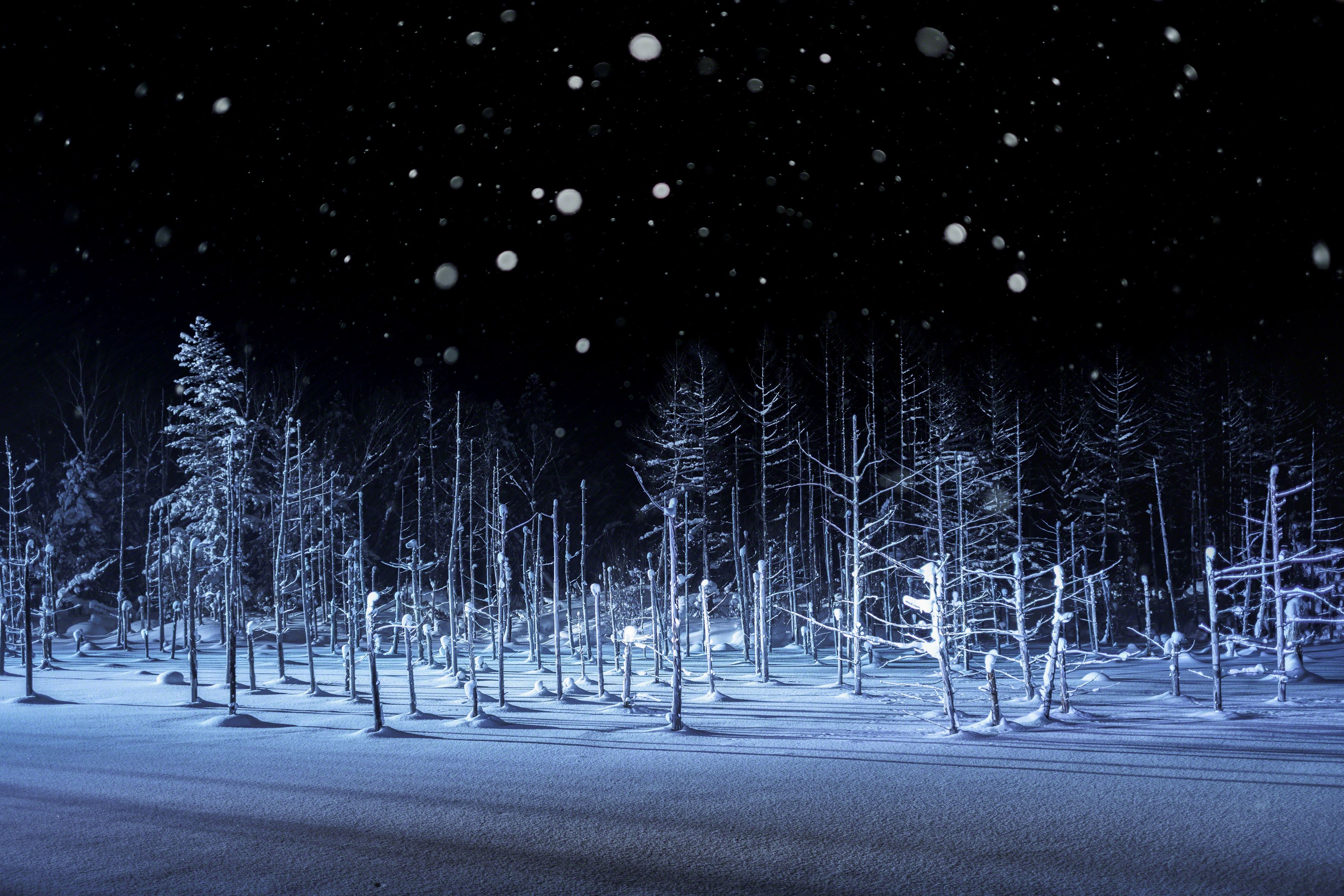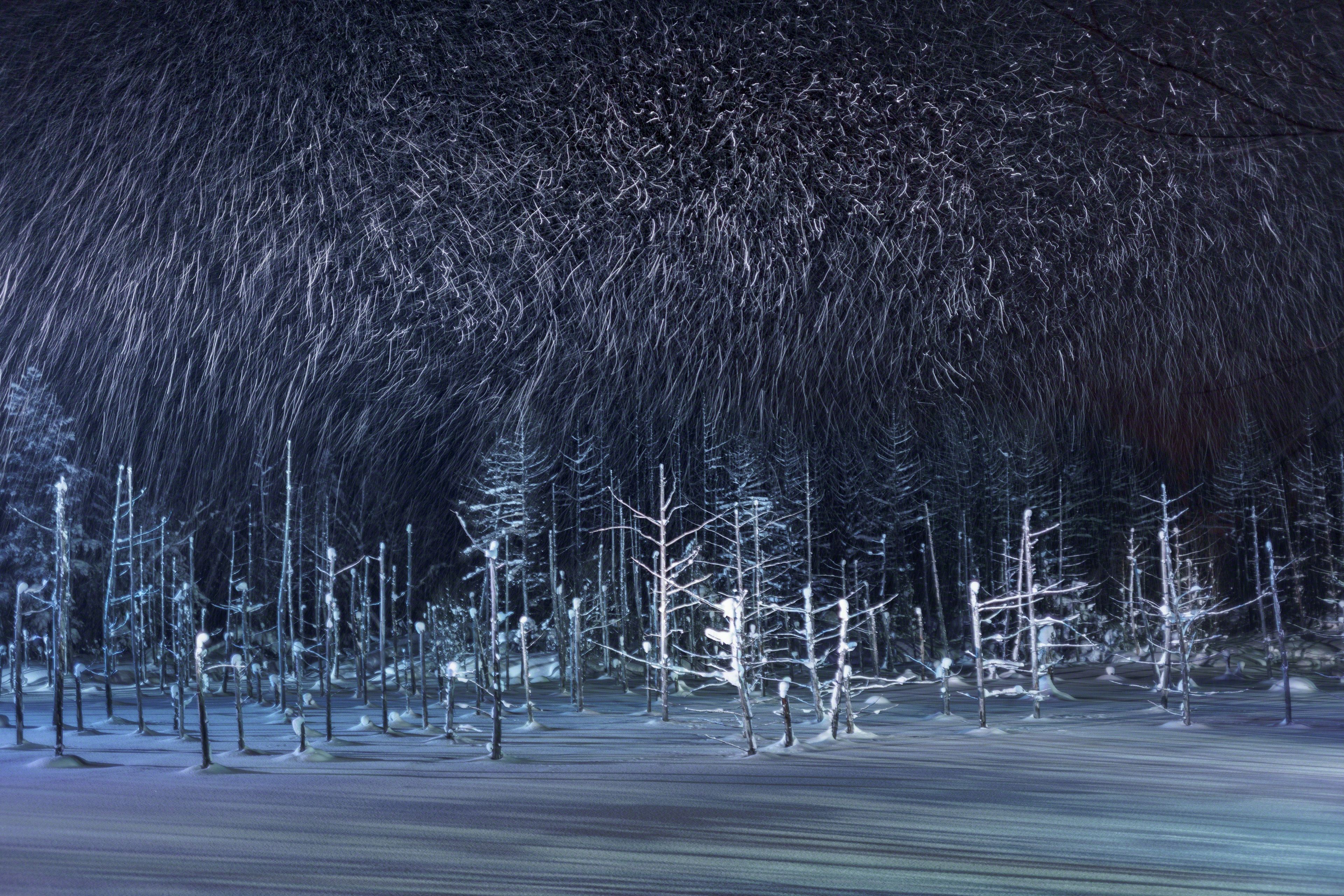 The blue pond in Biei-cho,in Hokkaodo is frozen during the winter season and snow accumulates. Tourists can not see the blue pond, but in the evening you can see the fantastic pond that was lighted up. The director's lighting can light the snow falling and photograph the locus of snow irregularly falling.