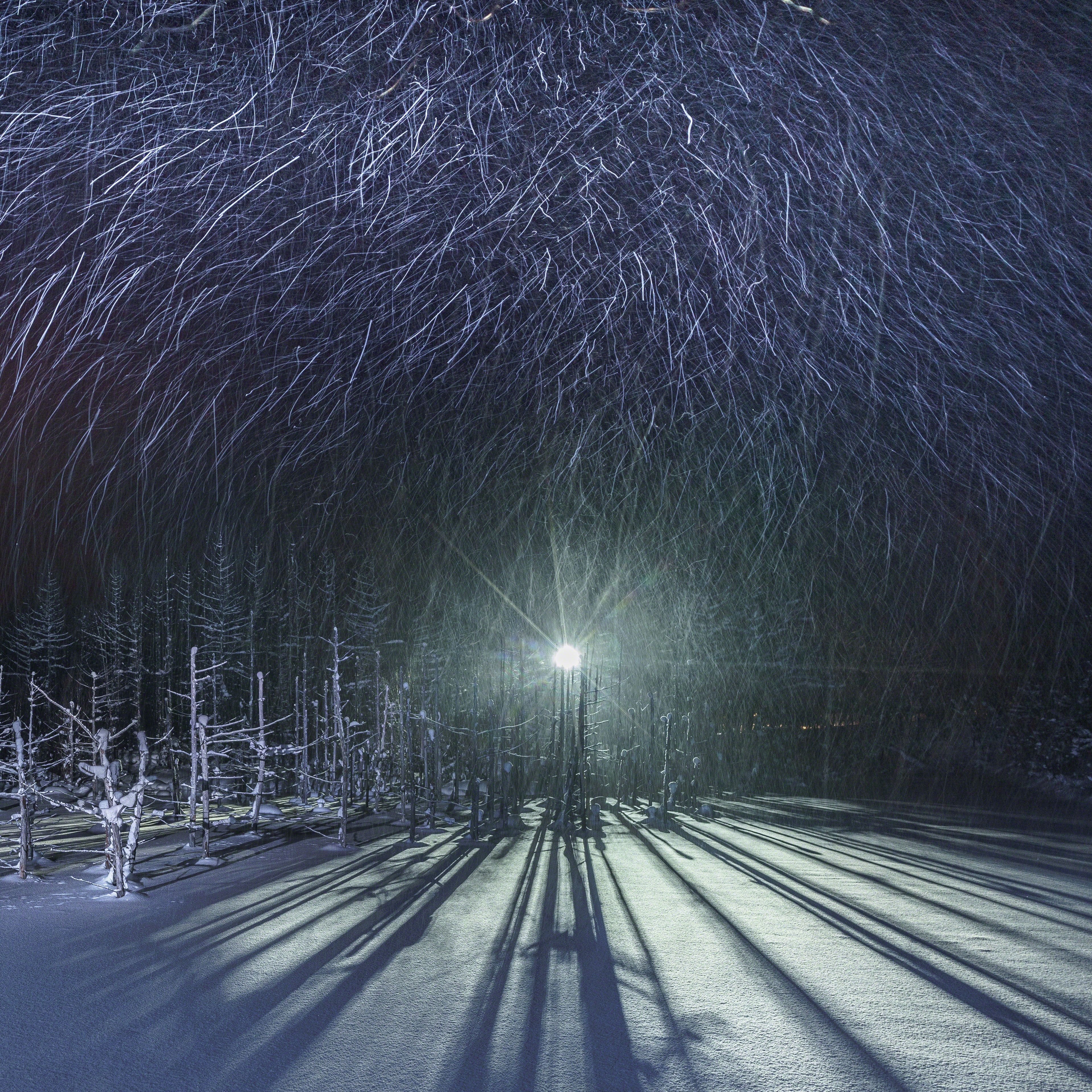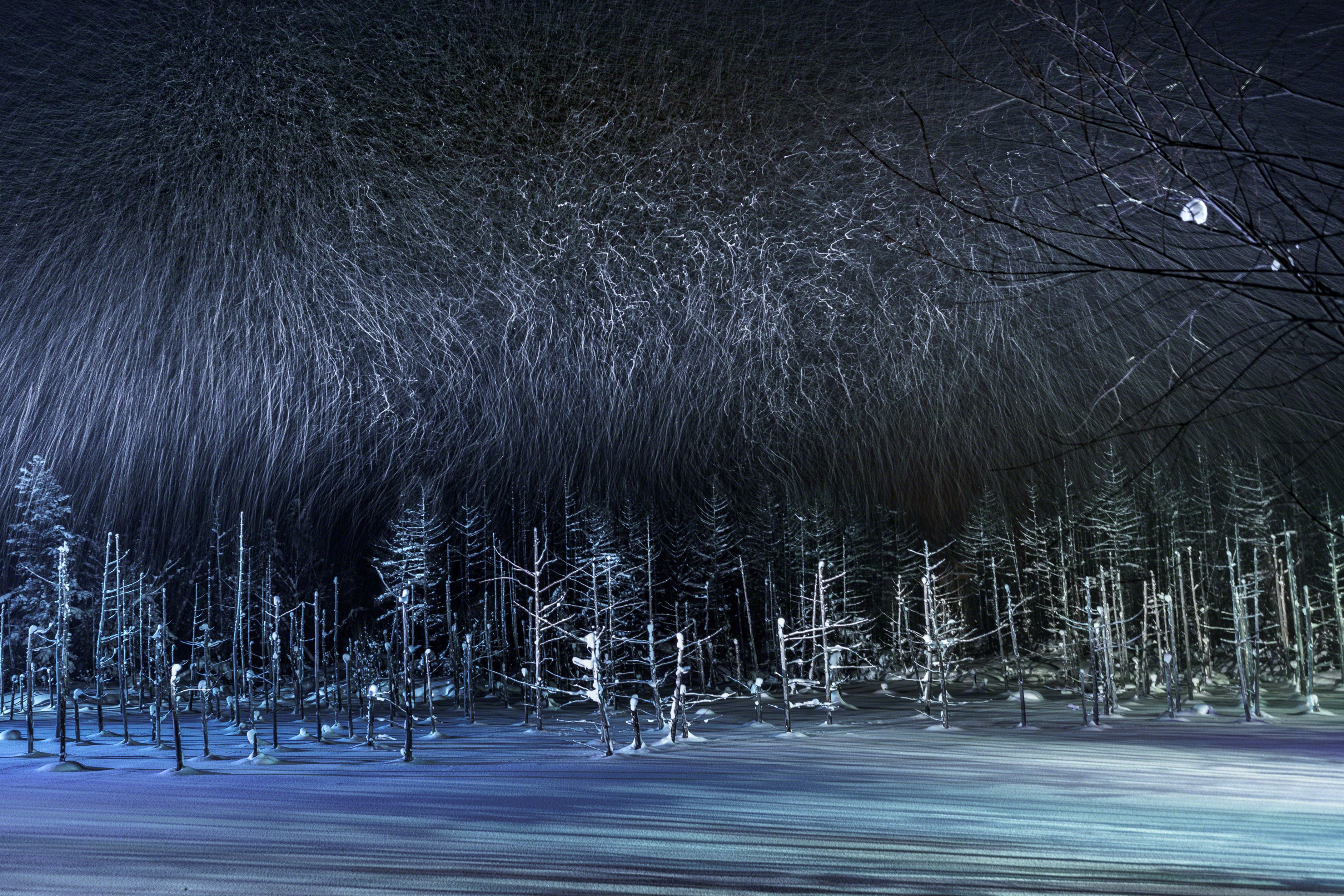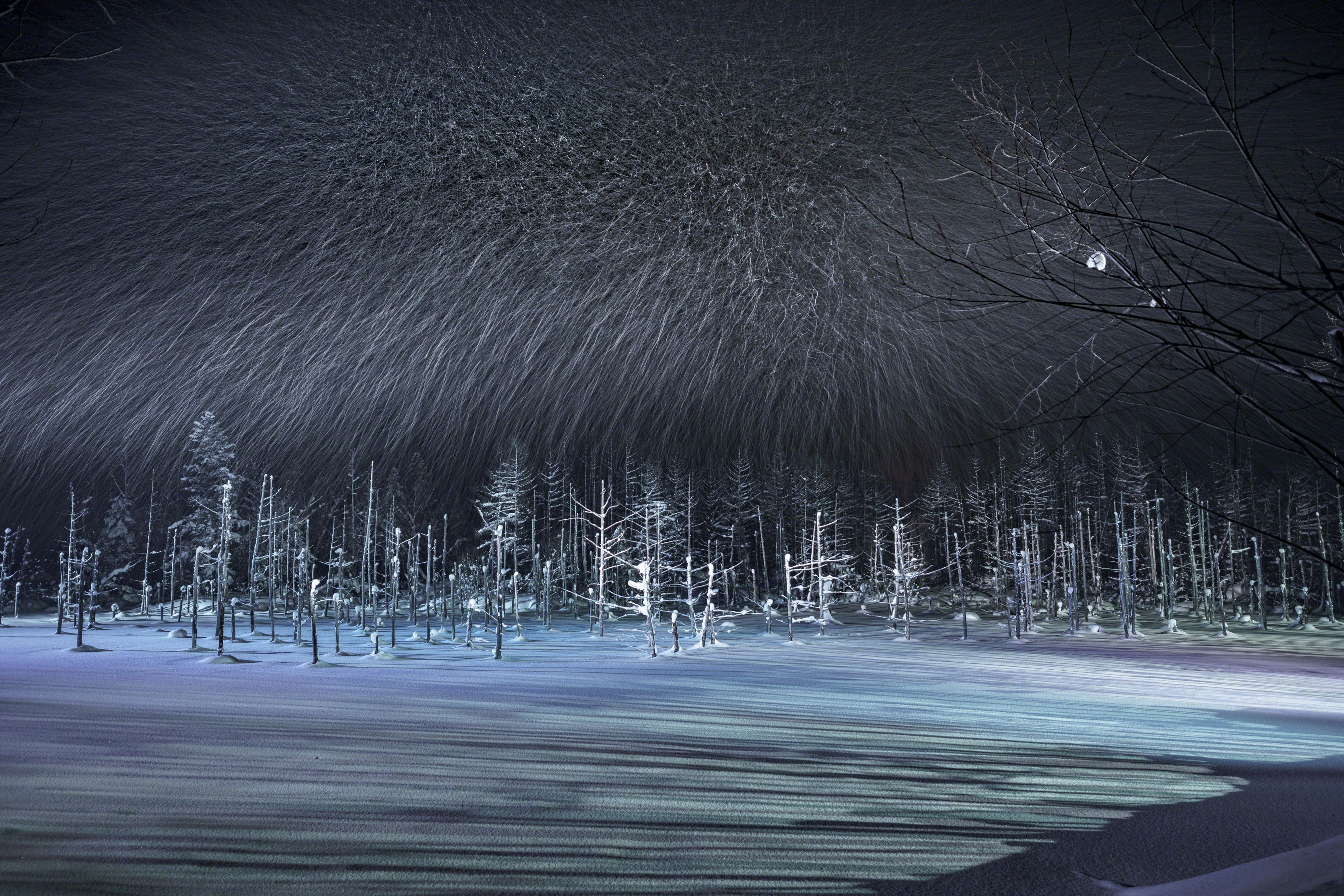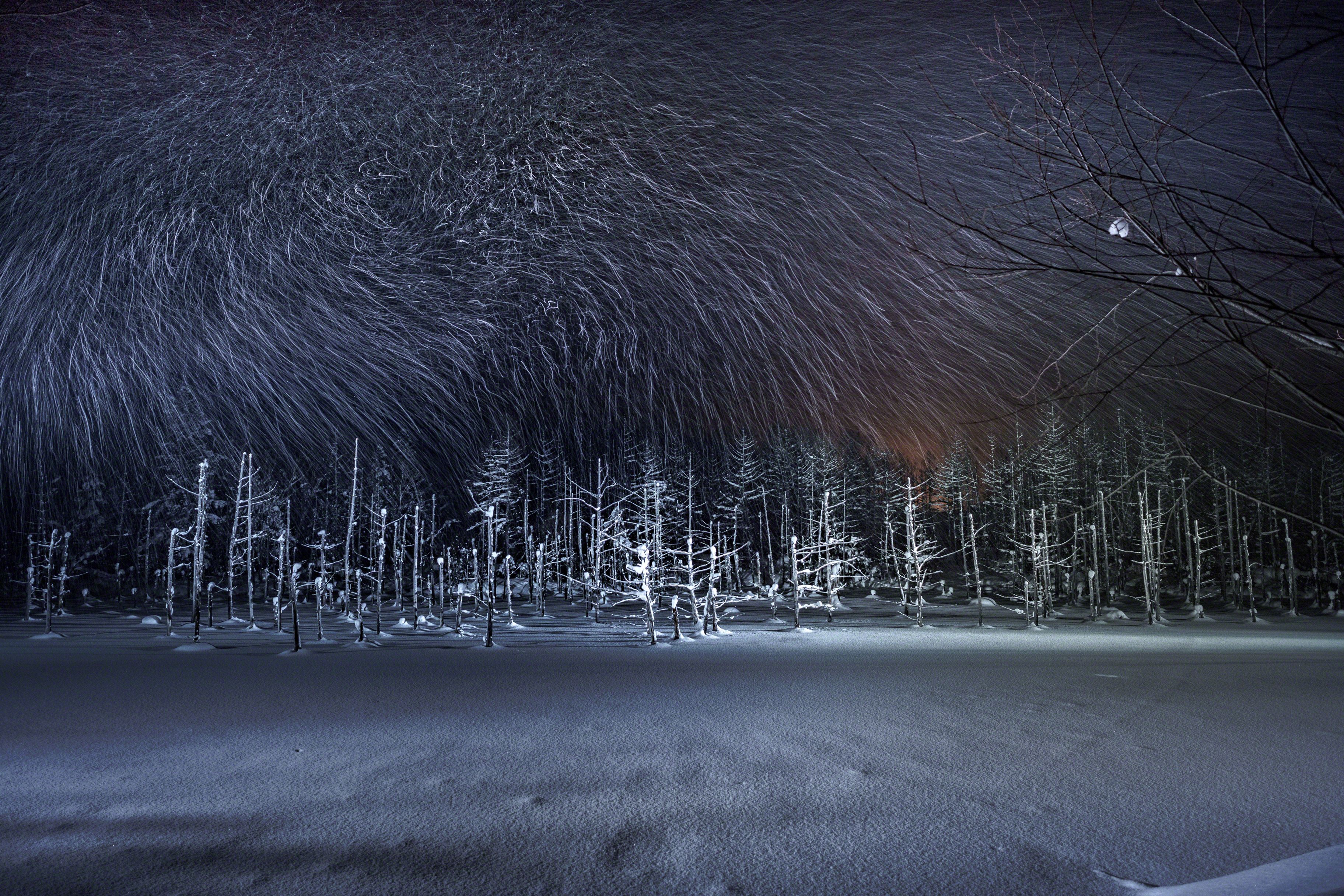 The blue pond in Biei-cho,in Hokkaodo is frozen during the winter season and snow accumulates. Tourists can not see the blue pond, but in the evening you can see the fantastic pond that was lighted up. The director's lighting can light the snow falling and photograph the locus of snow irregularly falling.