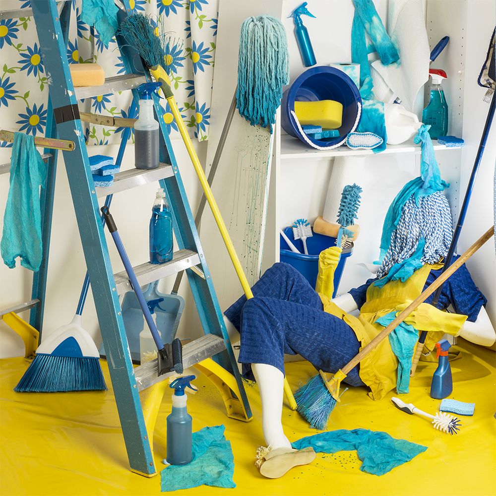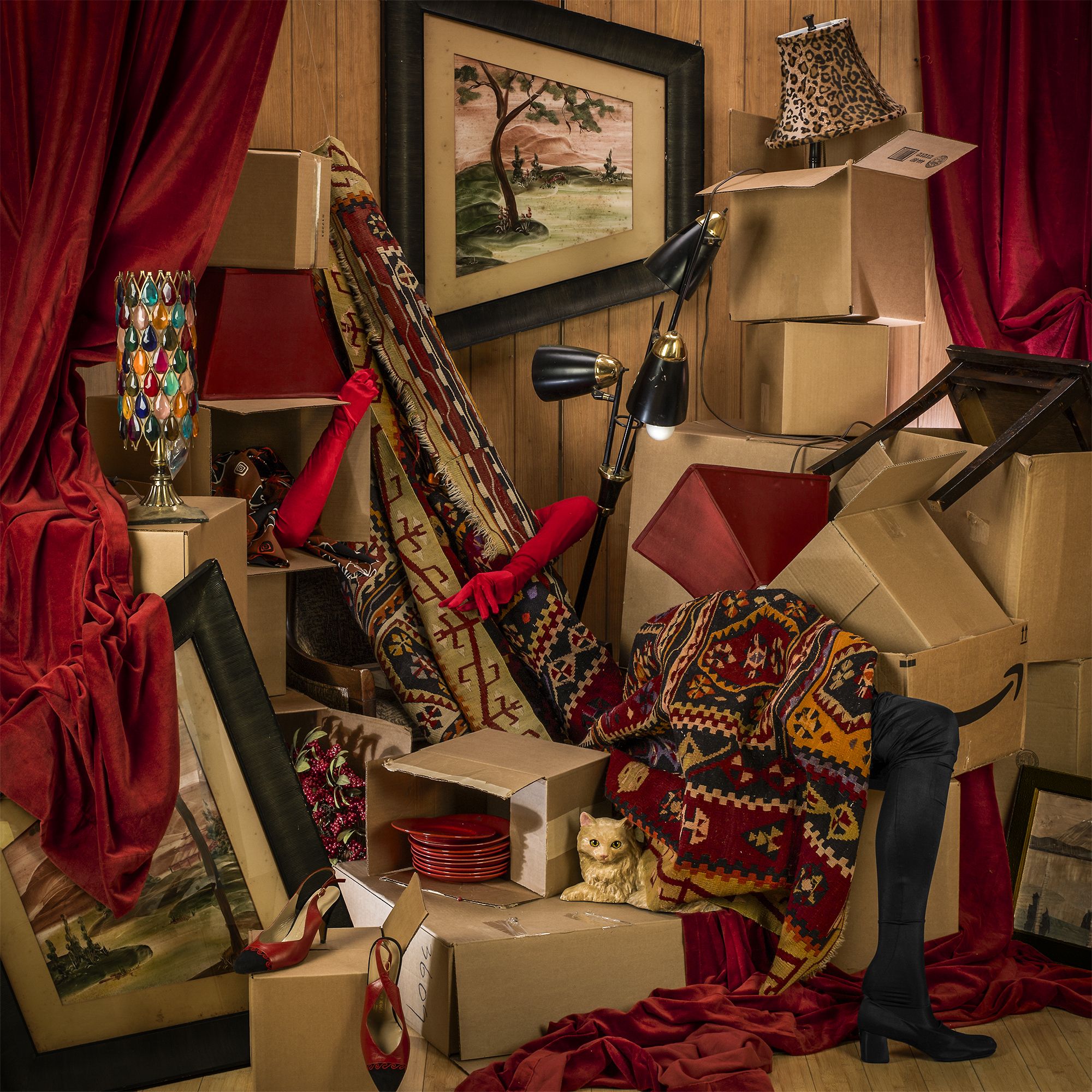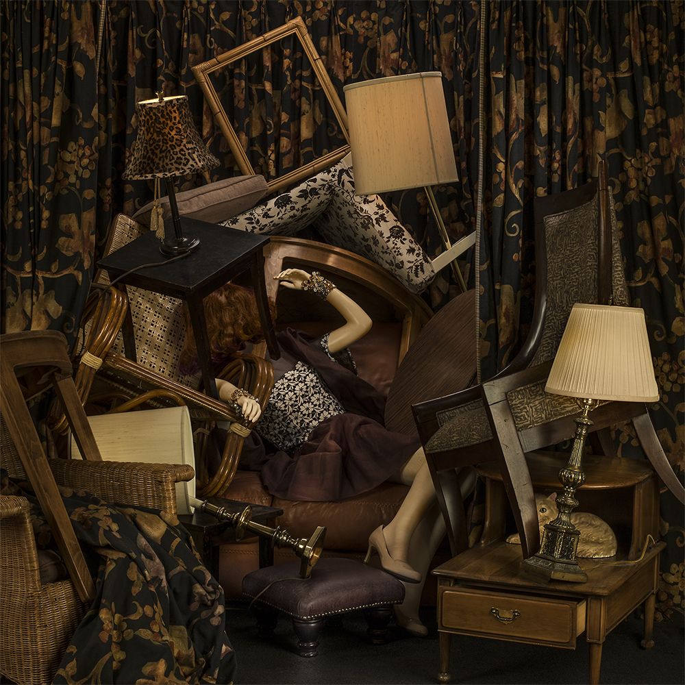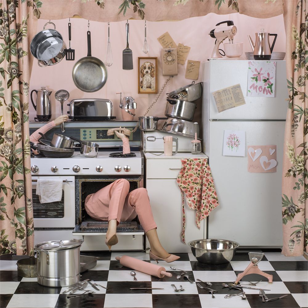 Anonymous Women: Demise The subject is the conflation of woman and home. The woman is camouflaged among her domestic objects, activities, and obsessions. The still-life narratives comment on the mania of collecting, accumulating, and decorating a home. In the series, the objects take over, and the woman is crushed by her own possessions, leading to disaster and mayhem.