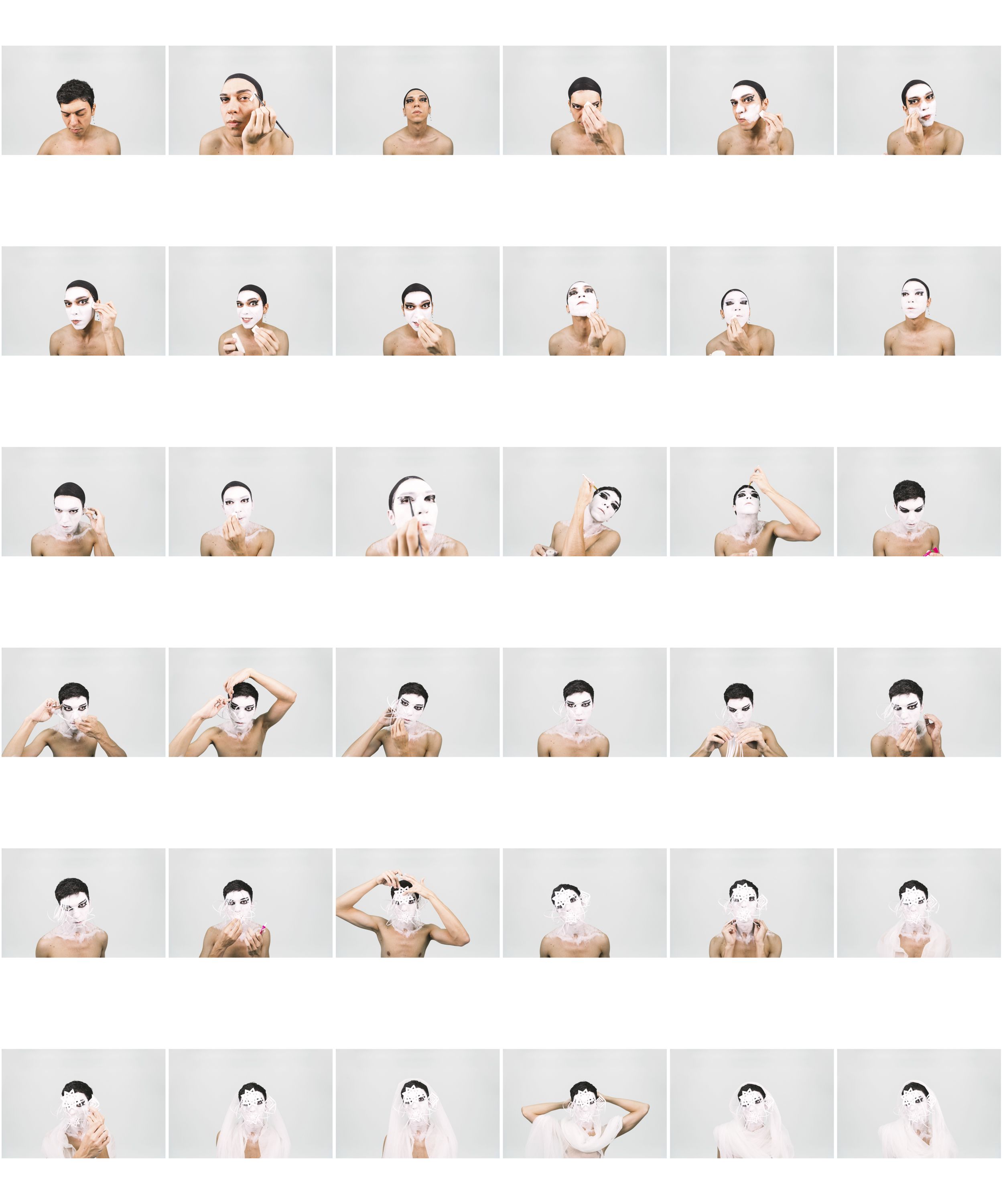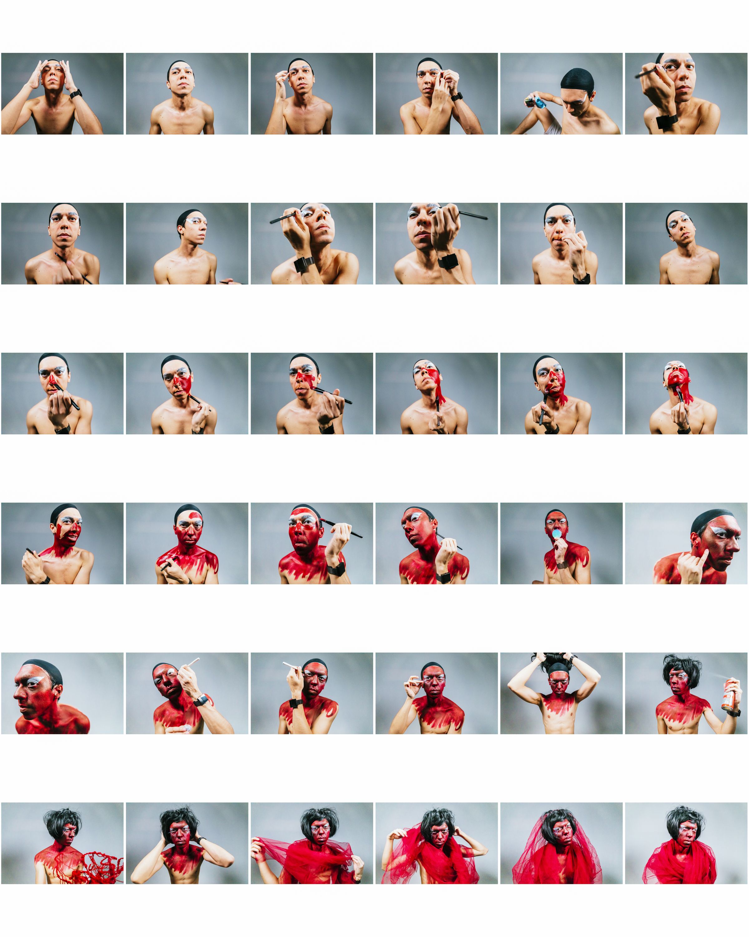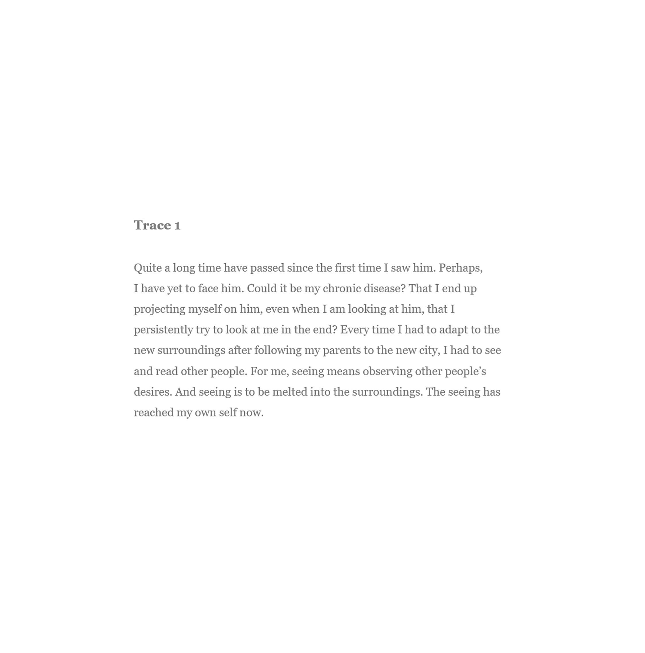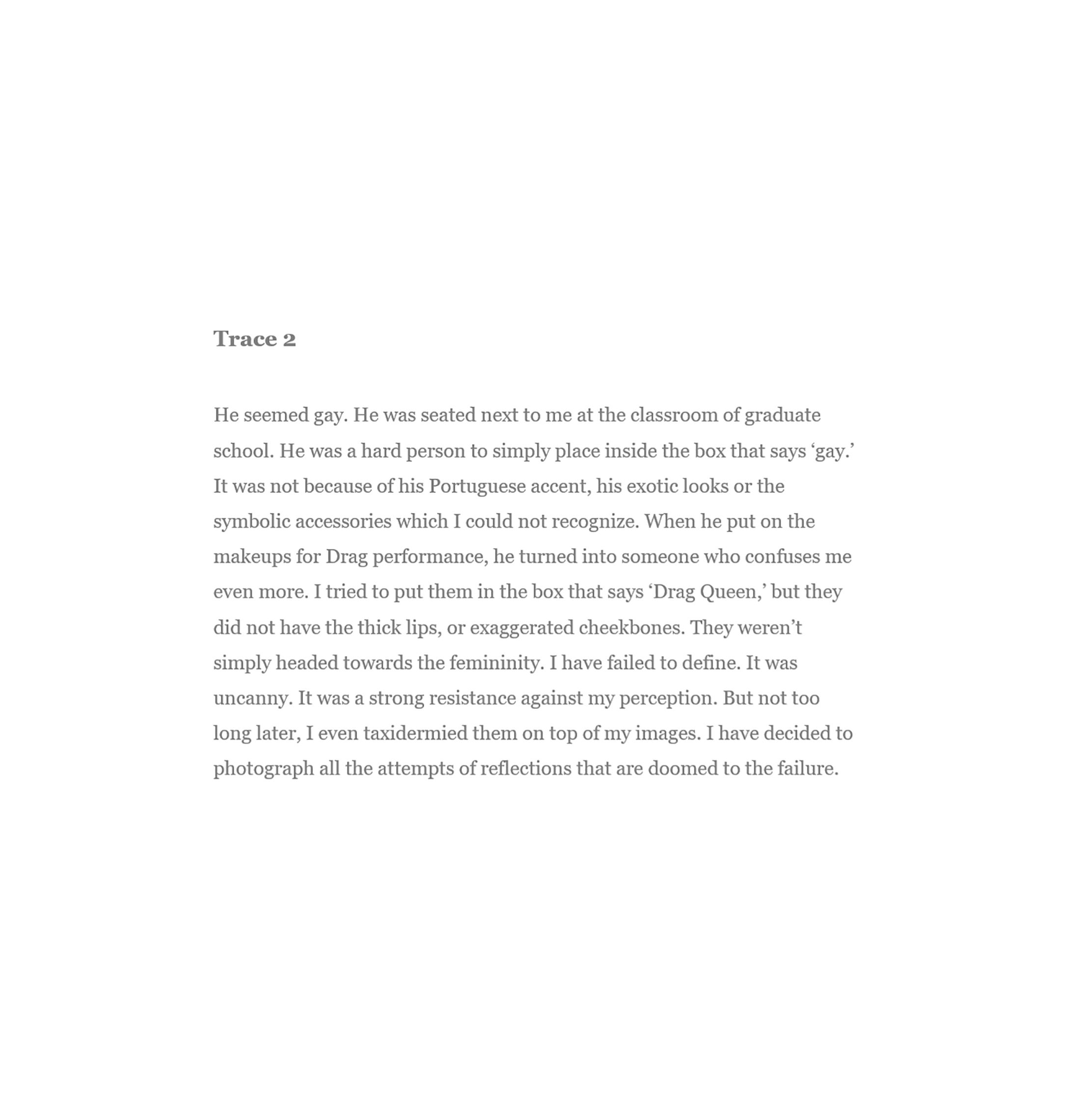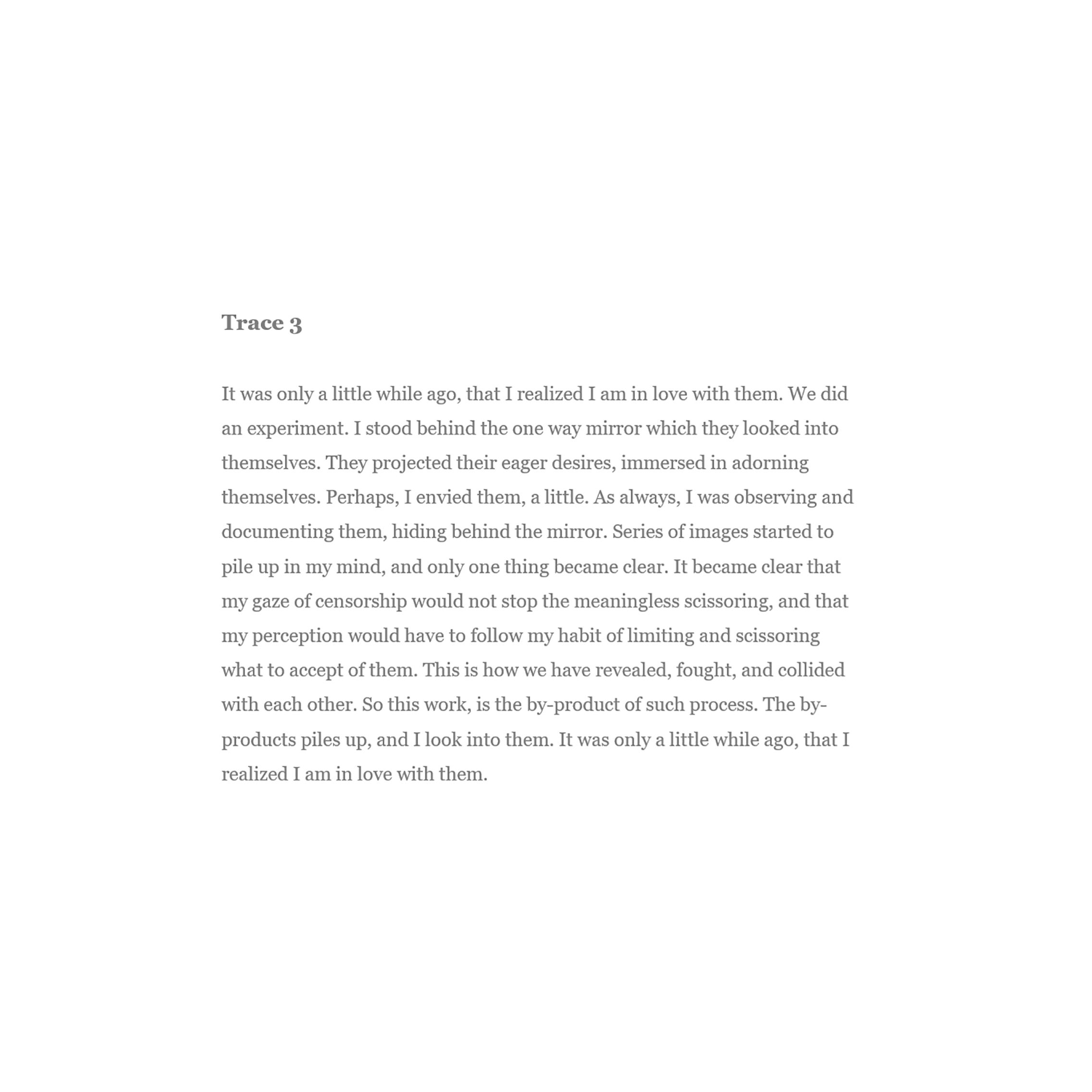 Artist Note is included between images with name of “Trace 3” “Trace 2” “Trace 1”. You can read them in random order or not. www.gibsonkim.com/nada Basically, Performer Nix wore make up looking at the one-way mirror which I can peep through and observe Nix’s movement behind it. I documented nix’s movement and identified them as I want confessing my voyeurism. Nix was against me expressing their identity for the best on the other side of mirror. This series of work ‘Nada’ is output from our collision.