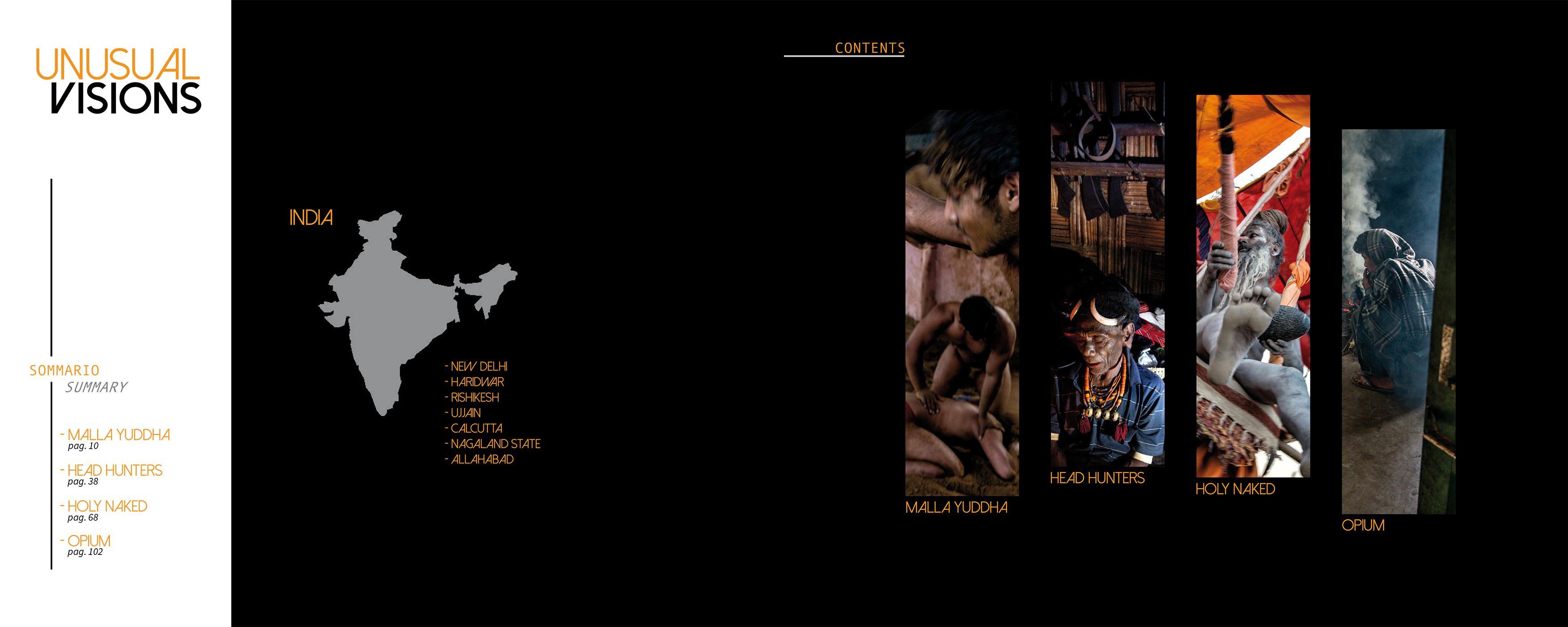 This book gathers together four different reportages, four stories of another India, different, unusual, and sometimes far from the collective imagination. The last Head Hunter of Nagaland (a group of warriors who, to increase their own power in the village, used to carry out the ritual decapitation of the enemy); The Malla Yuddha, the ancient indian wrestling in mud; The "Naga Baba" the highest expression of Indian asceticism, and the scourge of opium in the Indian-Myanmar border, where a third of the men of these villages are now addicted and slaves to the opium.