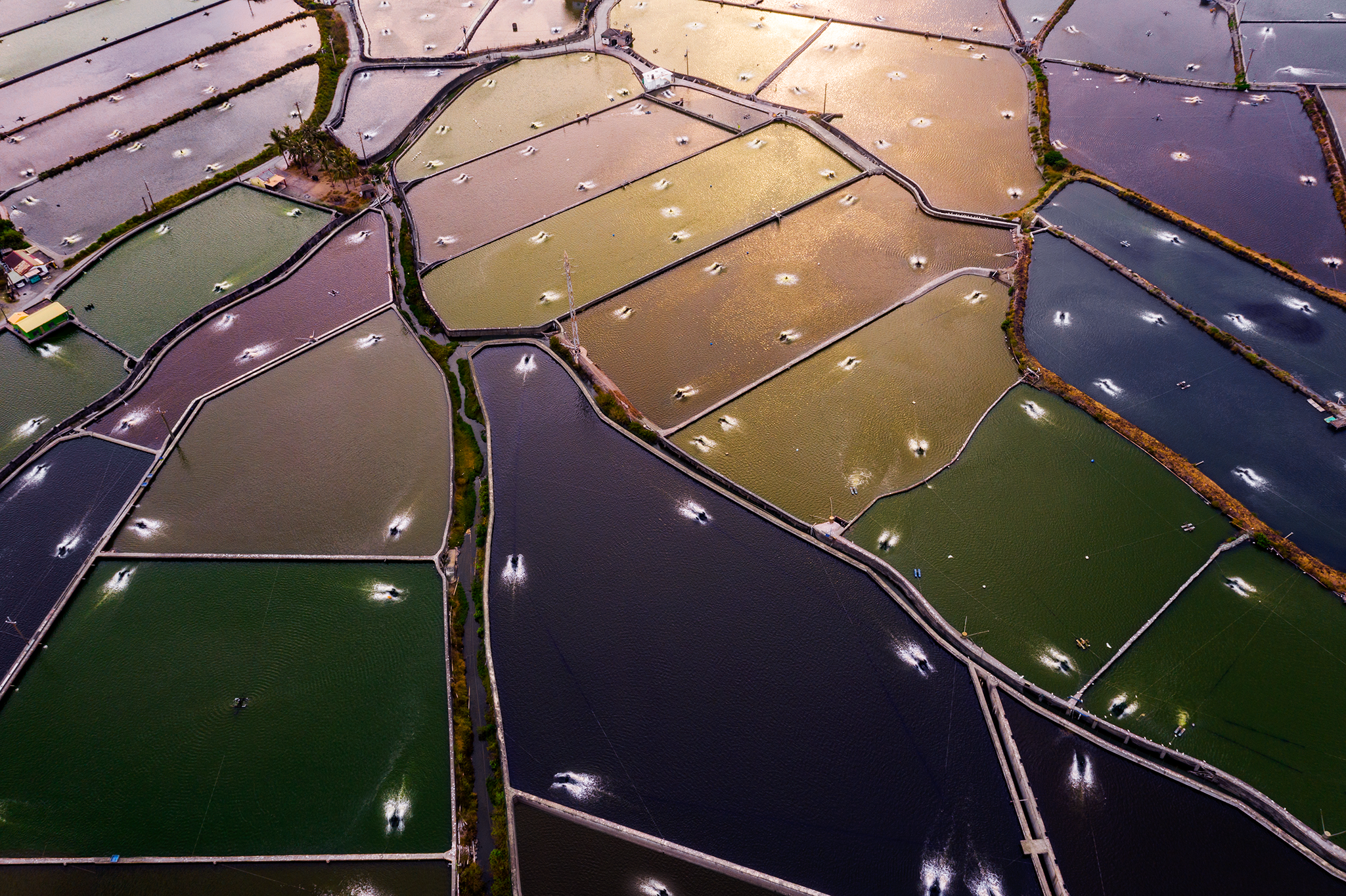 From the angle of the high altitude to take the photo of the geometric shape of fish ponds at sunset time. The reflection on the water surface forms the beautiful colors and the splash from the waterwheel , which are commonly seen in Taiwan. Although the raised fishes bring the big wealth , but also seriously damage the ecology and cause the crisis of stratum subsidence.